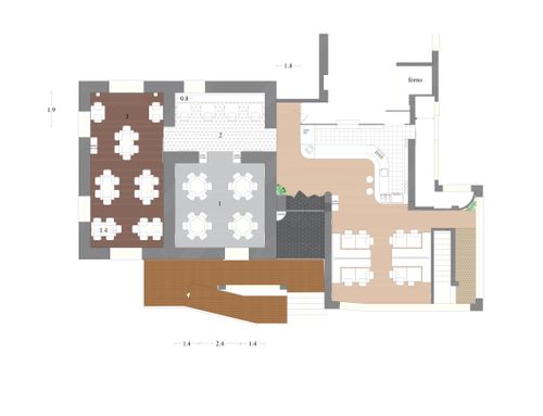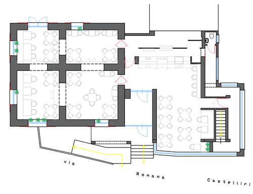 1)	Entrance/sale point. I’d like to leave more space for clients putting the bar, the cash register and the counter on the same side facing the entrance (please see file “planimetria con modifiche da apportare”). I’d like to leave 1 meter of space both on the left and the right side of the new counter (bar-register-counter): on the left there will be access to the kitchen and on the right there will be a partition wall, 1.80 meter tall or full-height.