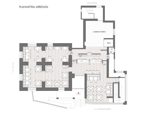 I tavoli e le sedie richiameranno lo stesso stile e lo stesso anche per il banco vendita e bar.