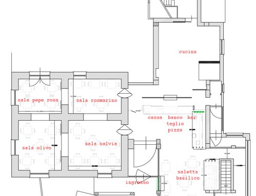 È così suddiviso: una sala grande, una sala più piccola, un punto vendita costituito da un angolo bar e un angolo vendita pizze da asporto.