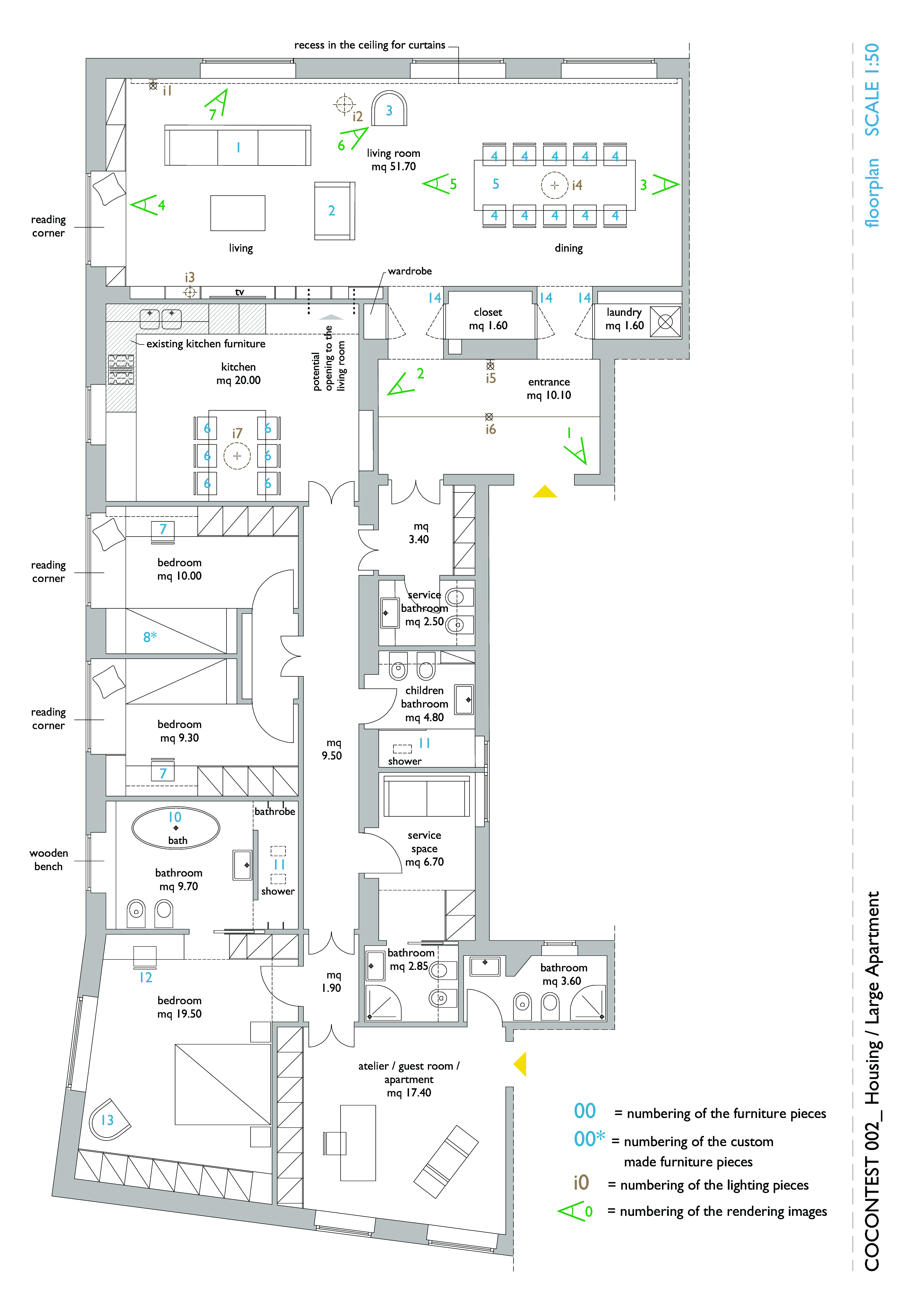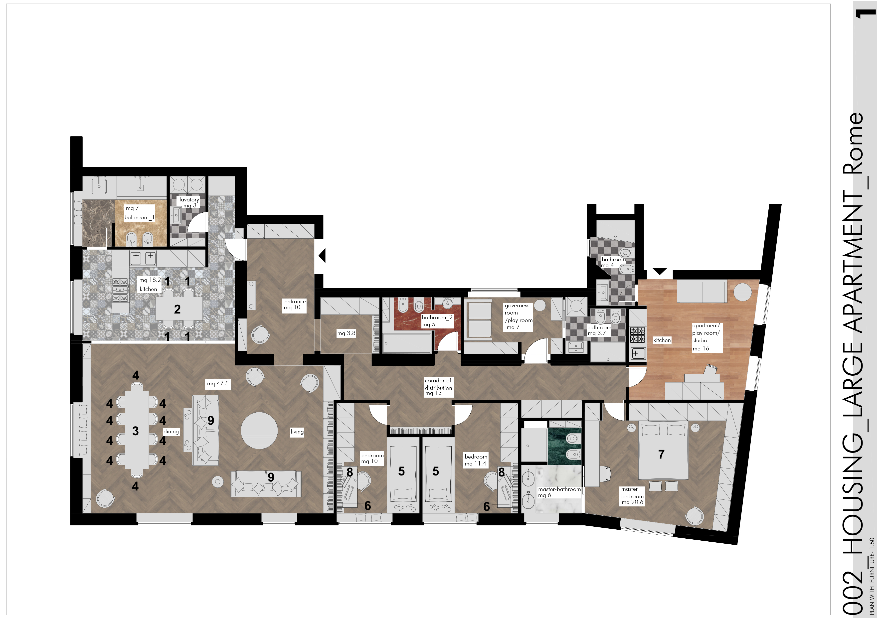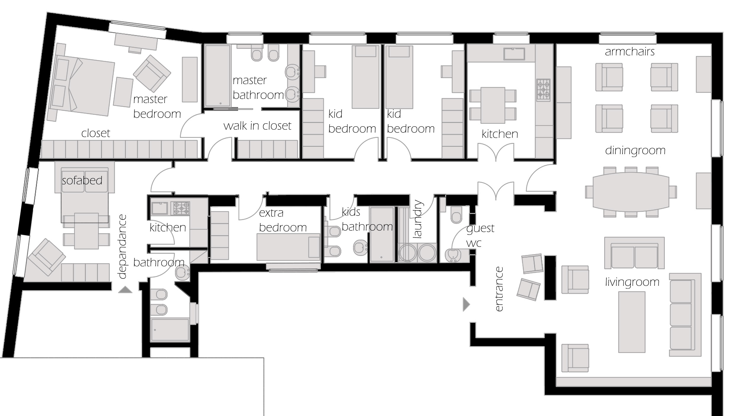 8. A large kitchen, which should not be visible from the main entrance, with a table for 4/6 people. The idea is to use the kitchen we have in our current apartment (18 months old) and then change in the future (we shall of course add some items to the current ones). We are thinking of an entrance to the kitchen from the drawing room. We would also consider giving up a small portion of the drawing room for a larger kitchen if the solution does not break the line of the drawing room.