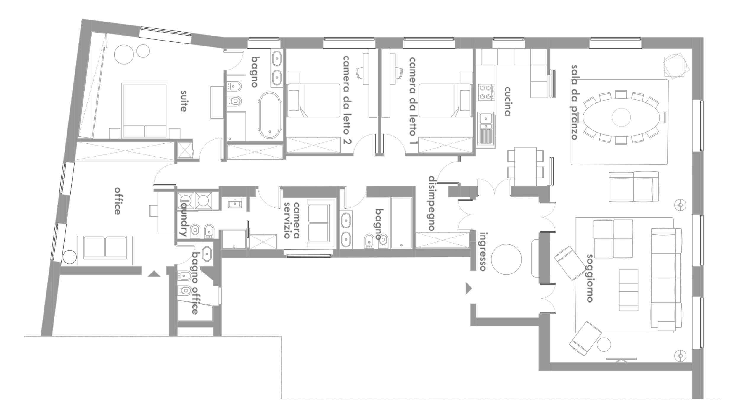 L’immobile si trova a Roma in una palazzina del 1960, è un primo piano ed affaccia su tre lati (una piazza, una strada pubblica, ed un cortile interno). L’appartamento dovrà essere completamente ristrutturato sia da un punto di vista estetico che impiantistico. Gli obiettivi che volevamo raggiungere dalla ristrutturazione sono i seguenti:
