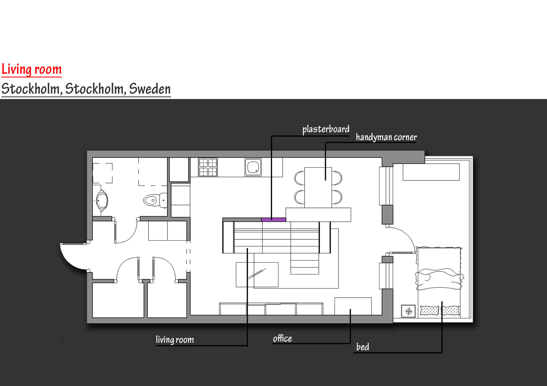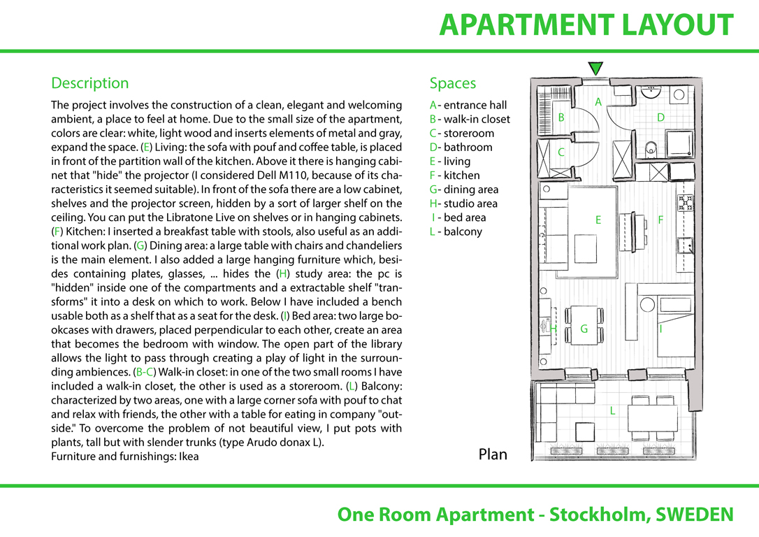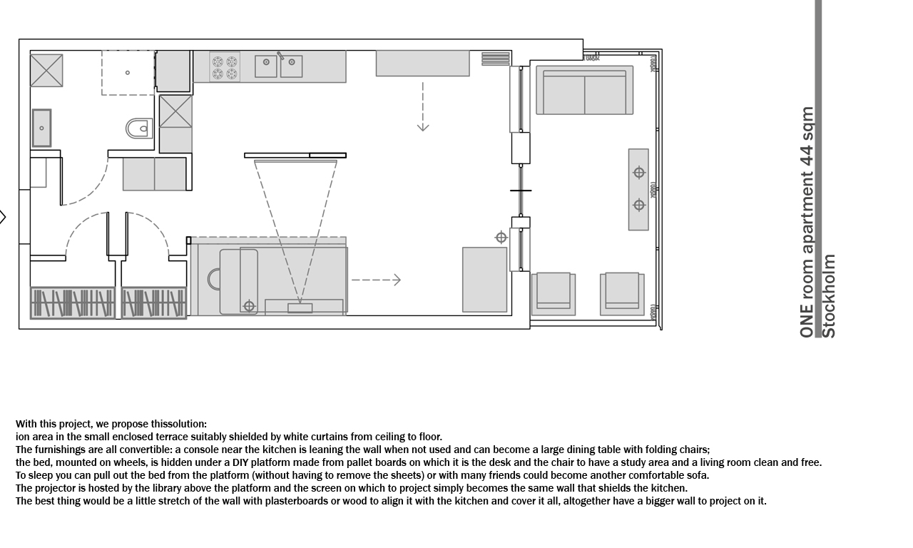 I am looking for advice and inspiration regarding furniture and decorations for this apartment. # Style I'd like to create an inviting atmosphere that makes it feel natural for people to hang out in the apartment, everything from twelve people down to two or just a single person. Also think that I need to find a couple of fitting base colors. I like clean, but it doesn't have to be sterile. Decorations, colors and flowers are welcome. Clever solutions for compact living can be cool, but I am not a fan of when they get too obvious.I prefer designs that look uncompromised, as if the area was constructed for the furnitures and not the other way around. Some feelings I'm striving for: Social, Relaxing, Clean, Nature, (Zen?), (Scandinavian-ish?) # Bed Since I don't have a bedroom I like the idea of creating a somewhat closed-off area for the bed,but it is not a requirement since I don't know if it is possible to achieve in an elegant fashion, # Balcony The balcony is rather big in relation to the apartment. I decided to make it glazed so thatit would feel more like a room and an extension of the apartment. Since the view is not the best I will need to compensate, plants are probably the way to go, maybe a small tree even? Keywords are social, welcoming and nature. # Main I don't want a television to be the center of the room. I am leaning torwards buying a projectorto get rid of the "big black area" that a regular tv screen creates when turned off. Not going for a home cinema and I won't use a projector screen. It would be greatif the projector could be hidden somewhow, maybe among other things so that it doesn't "pop out"Same goes for roof mounted projectors, they tend to be very visible and not what I am after. # Office Not talking about a full blown office, but I do need a small desk where I can put a screen, keyboard, mouse and computer.If the computer chassis can be hidden from plain sight that would be fantastic. Minimalistic is good. # Dining A big table is not necessary. Great if you manage to include it, but don't force it in. Not planning any fancy family dinners. A few places to put glasses and some plates is all I require. # Storage and Closet Two small rooms used for storage. I don't believe that any furniture, like a bed or a desk can fit in these. # Required or existing furniture: - I've already ordered a bed with the dimensions 120x200cm - I am consdering getting the Libratone Live for music and home entertainment. Mainly because it looks good and comes with a variety of different colored covers. Suggestions are welcome if you feel your design would go better with other speakers # Stores - Ikea - Any furniture store in Stockholm, for example Boconcept - International stores online if you find something unique that would fit perfectly # Budget I am not on a tight budget, but I am reluctant to spend $4000 on just a sofa (it would have to be a pretty damn good sofa). Lower prices are advantageous but not an absolute necessity. # Deadline I put 7 days as a deadline since I am moving in soon and will start to buy furniture. I hope it is not too short.