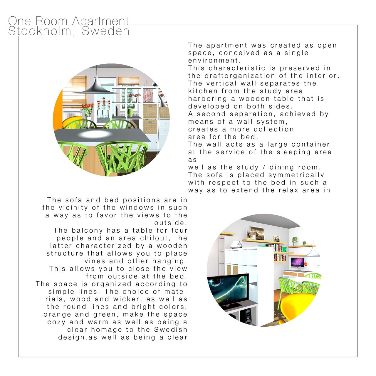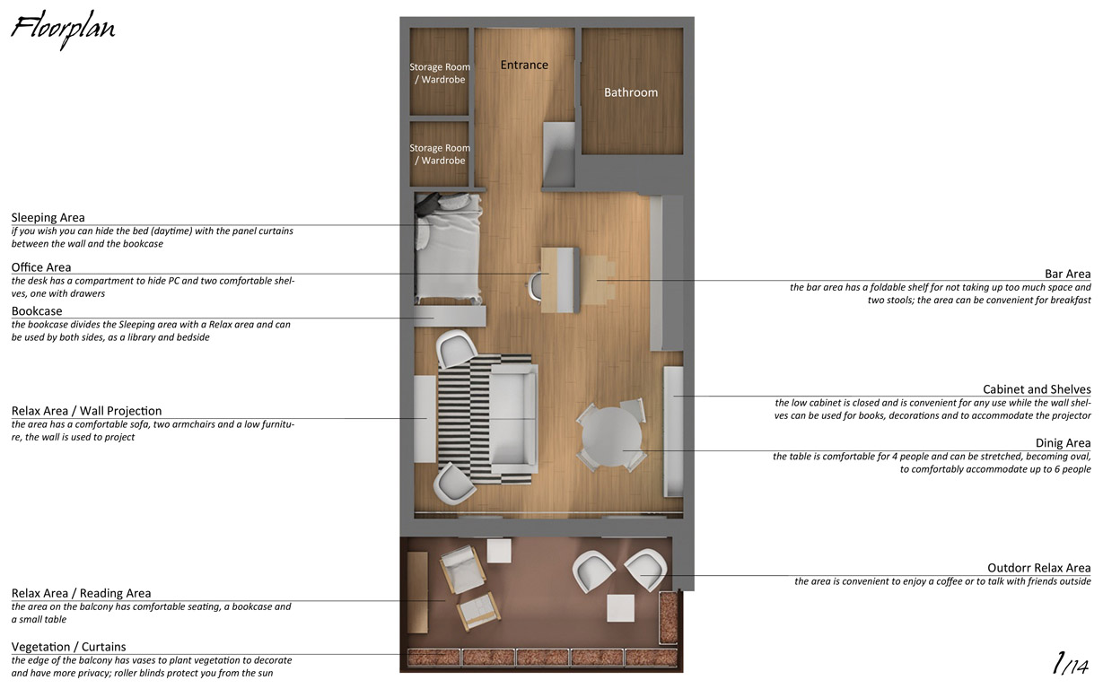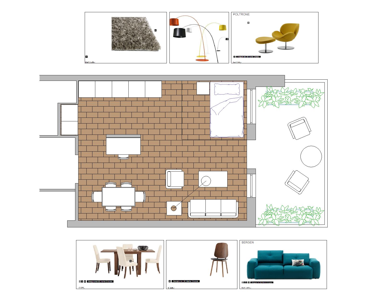 I am looking for advice and inspiration regarding furniture and decorations for this apartment. # Style I'd like to create an inviting atmosphere that makes it feel natural for people to hang out in the apartment, everything from twelve people down to two or just a single person. Also think that I need to find a couple of fitting base colors. I like clean, but it doesn't have to be sterile. Decorations, colors and flowers are welcome. Clever solutions for compact living can be cool, but I am not a fan of when they get too obvious.I prefer designs that look uncompromised, as if the area was constructed for the furnitures and not the other way around. Some feelings I'm striving for: Social, Relaxing, Clean, Nature, (Zen?), (Scandinavian-ish?) # Bed Since I don't have a bedroom I like the idea of creating a somewhat closed-off area for the bed,but it is not a requirement since I don't know if it is possible to achieve in an elegant fashion, # Balcony The balcony is rather big in relation to the apartment. I decided to make it glazed so thatit would feel more like a room and an extension of the apartment. Since the view is not the best I will need to compensate, plants are probably the way to go, maybe a small tree even? Keywords are social, welcoming and nature. # Main I don't want a television to be the center of the room. I am leaning torwards buying a projectorto get rid of the "big black area" that a regular tv screen creates when turned off. Not going for a home cinema and I won't use a projector screen. It would be greatif the projector could be hidden somewhow, maybe among other things so that it doesn't "pop out"Same goes for roof mounted projectors, they tend to be very visible and not what I am after. # Office Not talking about a full blown office, but I do need a small desk where I can put a screen, keyboard, mouse and computer.If the computer chassis can be hidden from plain sight that would be fantastic. Minimalistic is good. # Dining A big table is not necessary. Great if you manage to include it, but don't force it in. Not planning any fancy family dinners. A few places to put glasses and some plates is all I require. # Storage and Closet Two small rooms used for storage. I don't believe that any furniture, like a bed or a desk can fit in these. # Required or existing furniture: - I've already ordered a bed with the dimensions 120x200cm - I am consdering getting the Libratone Live for music and home entertainment. Mainly because it looks good and comes with a variety of different colored covers. Suggestions are welcome if you feel your design would go better with other speakers # Stores - Ikea - Any furniture store in Stockholm, for example Boconcept - International stores online if you find something unique that would fit perfectly # Budget I am not on a tight budget, but I am reluctant to spend $4000 on just a sofa (it would have to be a pretty damn good sofa). Lower prices are advantageous but not an absolute necessity. # Deadline I put 7 days as a deadline since I am moving in soon and will start to buy furniture. I hope it is not too short.