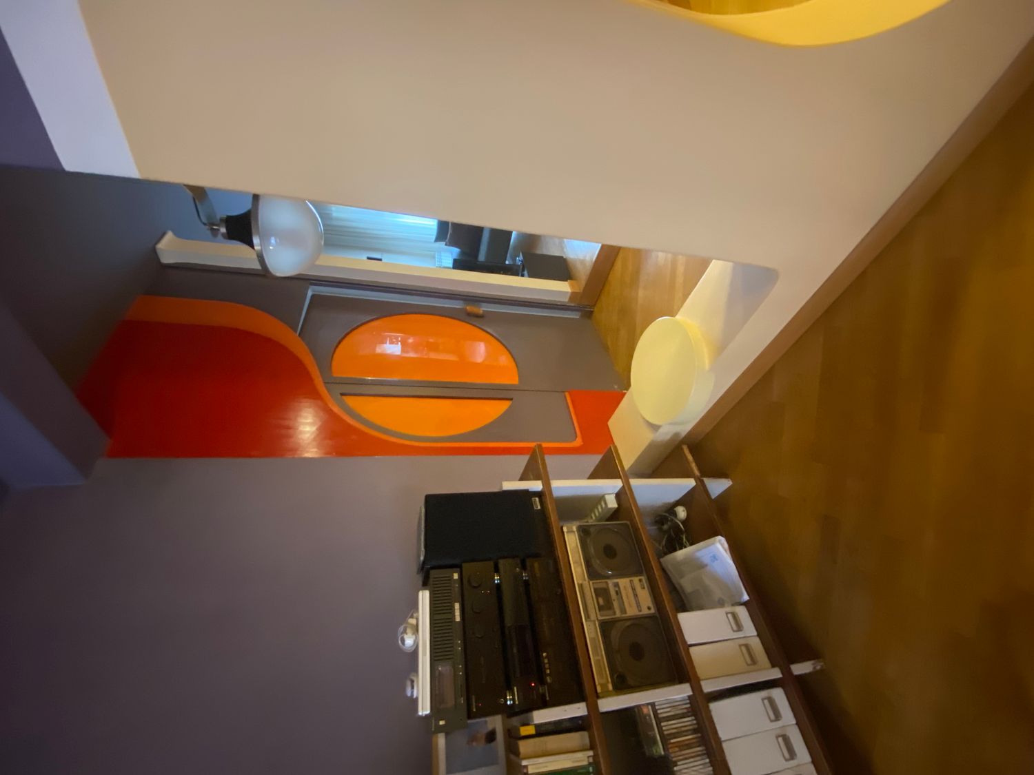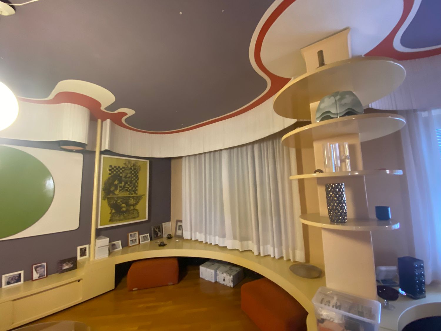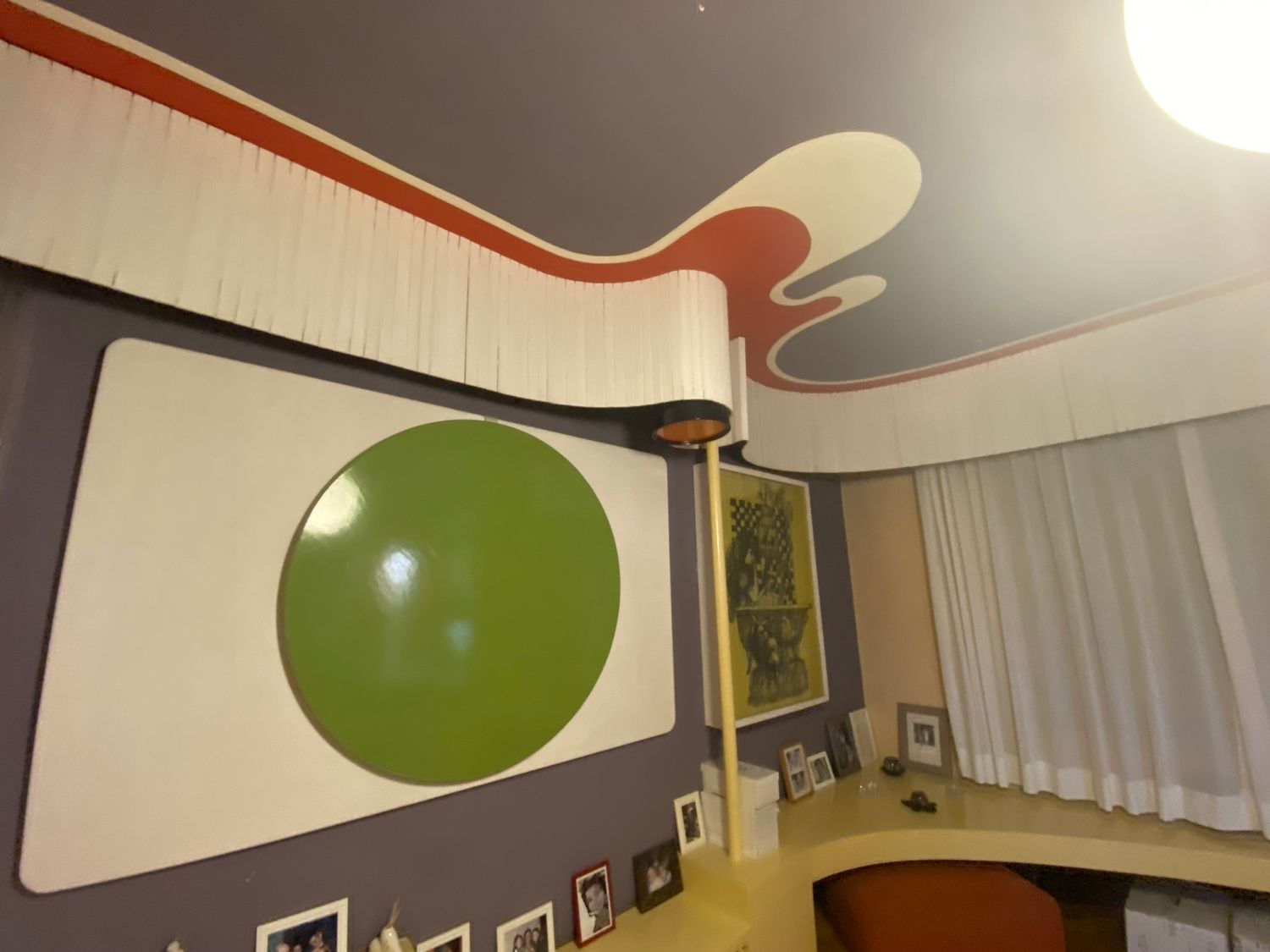 El panel de pared blanco con el disco verde aplicado es, en realidad, una pantalla de proyección: en los años 60/70 se usaban proyectores domésticos; el disco verde se engancha al panel blanco y se retira cuando se necesita la superficie de proyección. Me gustaría conservarlo.