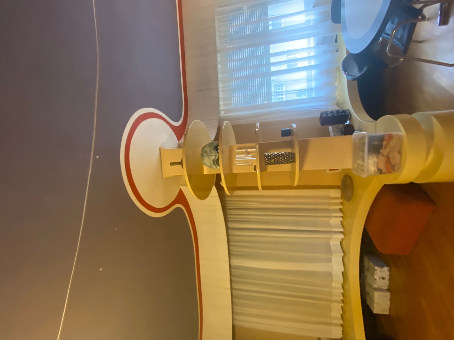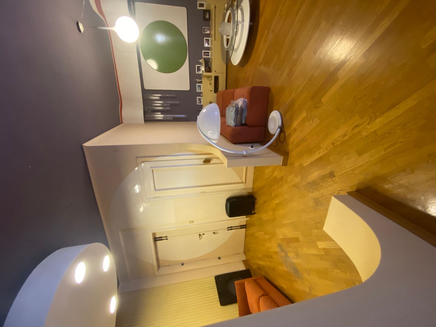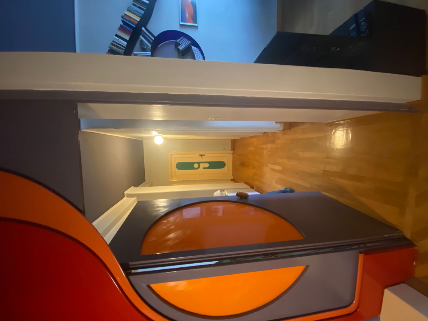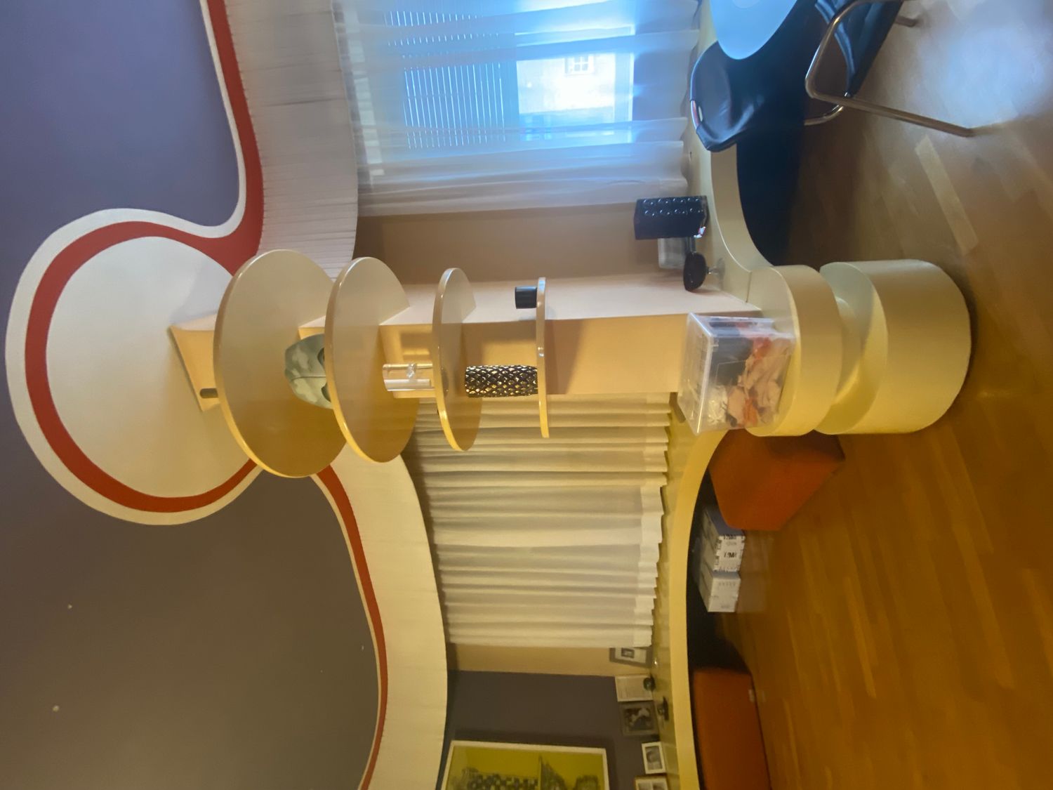 El panel de pared blanco con el disco verde aplicado es, en realidad, una pantalla de proyección: en los años 60/70 se usaban proyectores domésticos; el disco verde se engancha al panel blanco y se retira cuando se necesita la superficie de proyección. Me gustaría conservarlo.