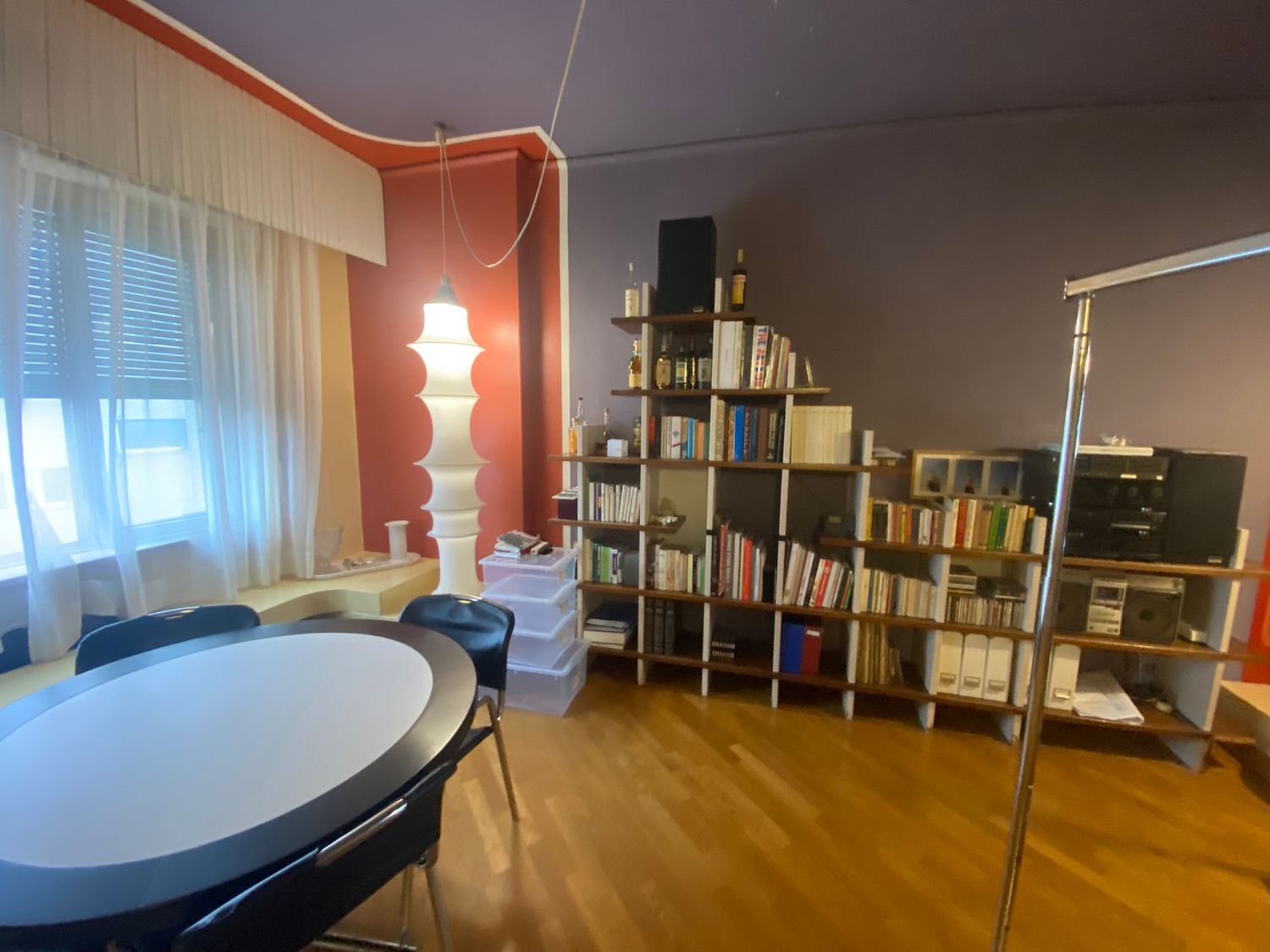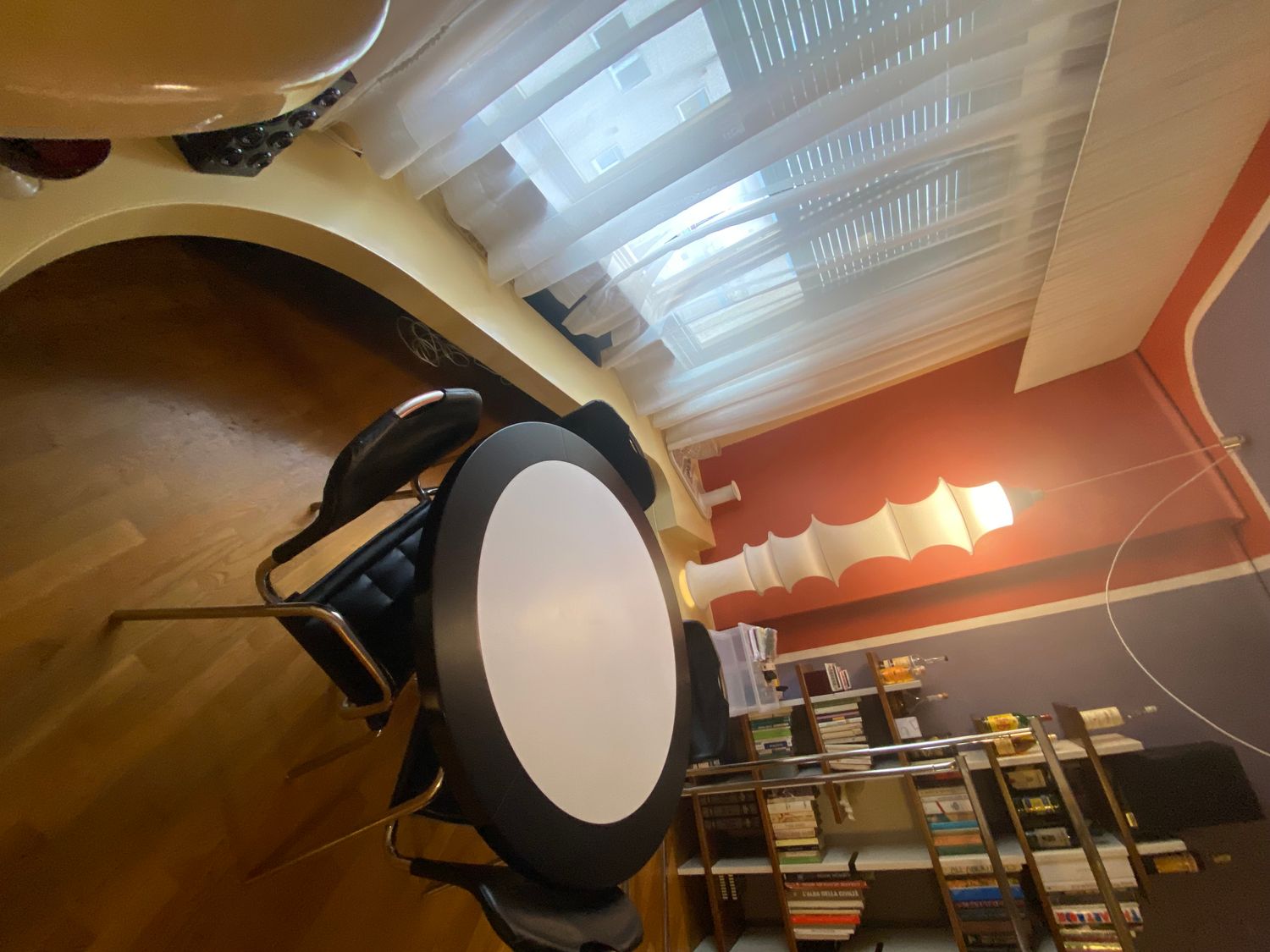 5) lascerei la libreria, ma inserirei un nuovo tavolo e nuove sedute. Il tavolo potrebbe essere di sagoma ovale e anche allungabile, in modo da poter ospitare molte persone (in alcune cene siamo anche 16/18 persone). A tal proposito non so se sia il caso di eliminare la boiserie dove attualmente esiste il tavolo e la lampada a calza di Munari (che potrebbe essere spostata altrove). In questo caso ci sarebbe più spazio per il tavolo che potrebbe essere posizionato longitudinalmente alla finestra quando chiuso, e verrebbe spostato ed allungato longitudinalmente alla libreria quando ci sono più ospiti.