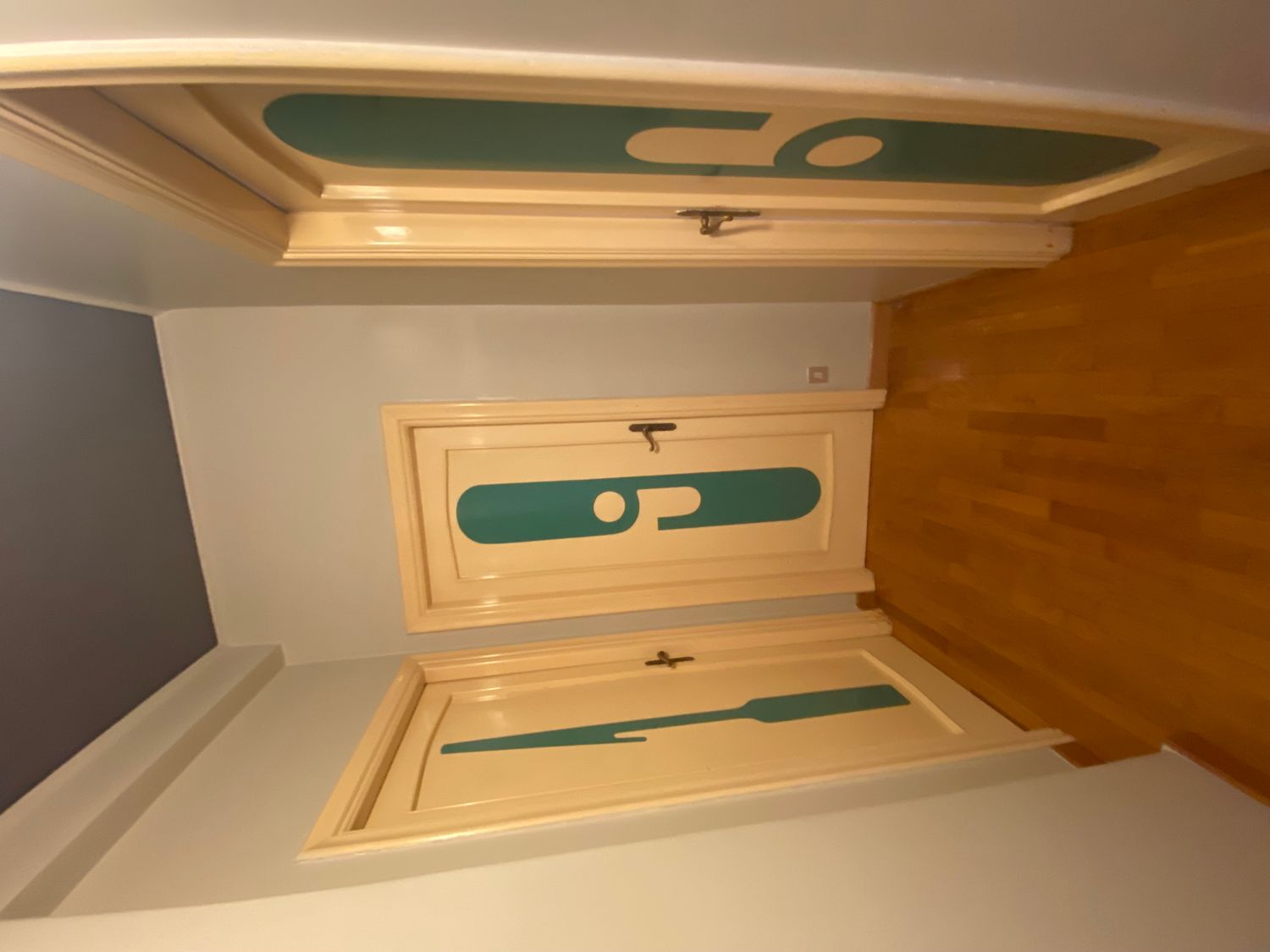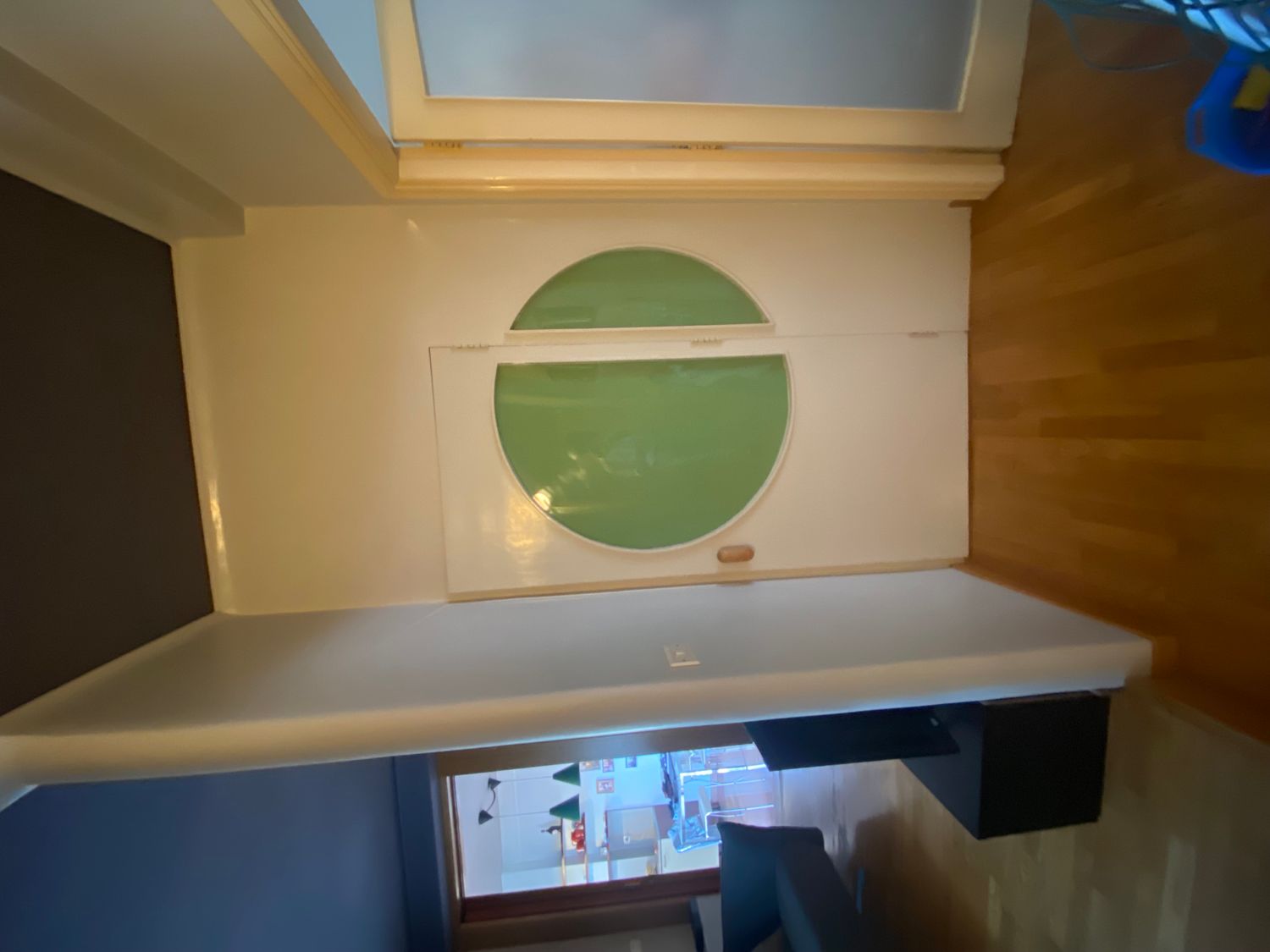 Il pannello a parete bianco con il disco verde applicato è, in realtà, uno schermo per proiezioni: negli anni 60/70 si usavano i filmini da riprodurre con il proiettore: il disco verde è agganciato sul pannello bianco e, all'occorrenza, veniva rimosso per lasciare solo lo schermo su cui proiettare i filmini. Mi piacerebbe lasciarlo