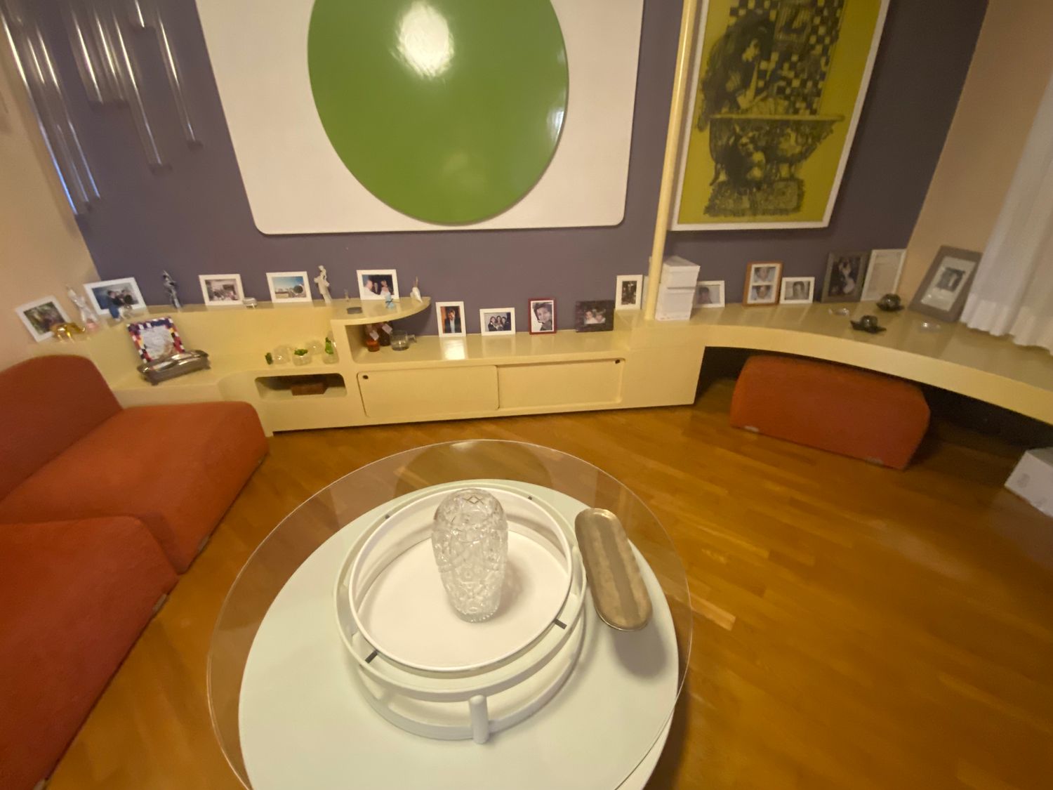 The white wall panel with the applied green disc is actually a projection screen: in the 1960s/70s people used film projectors for home videos; the green disc is attached to the white panel and, when needed, removed to reveal the projection surface. I would like to keep it.