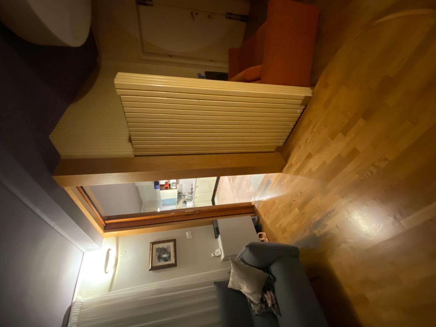 - Move the existing door (the scenic red/orange/lilac one) back, aligning it with the wall of the first WC.