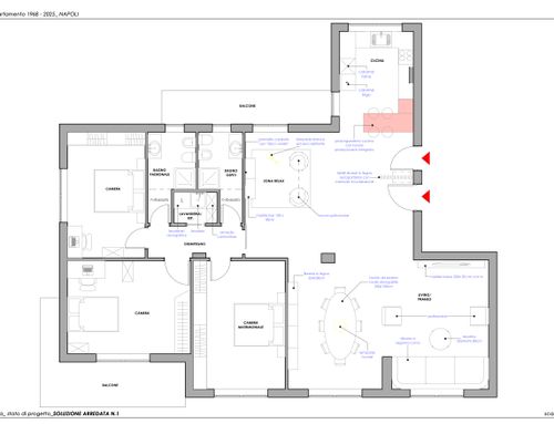 1) eliminare la parete tra la cucina e la zona ingresso/living in modo da creare una continuità tra cucina e living. La parete può essere eliminata completamente (lasciandone comunque circa mt.1 per tenere i due ingressi separati), oppure solo in parte ma lasciando comunque un ampio varco tra le due zone.
