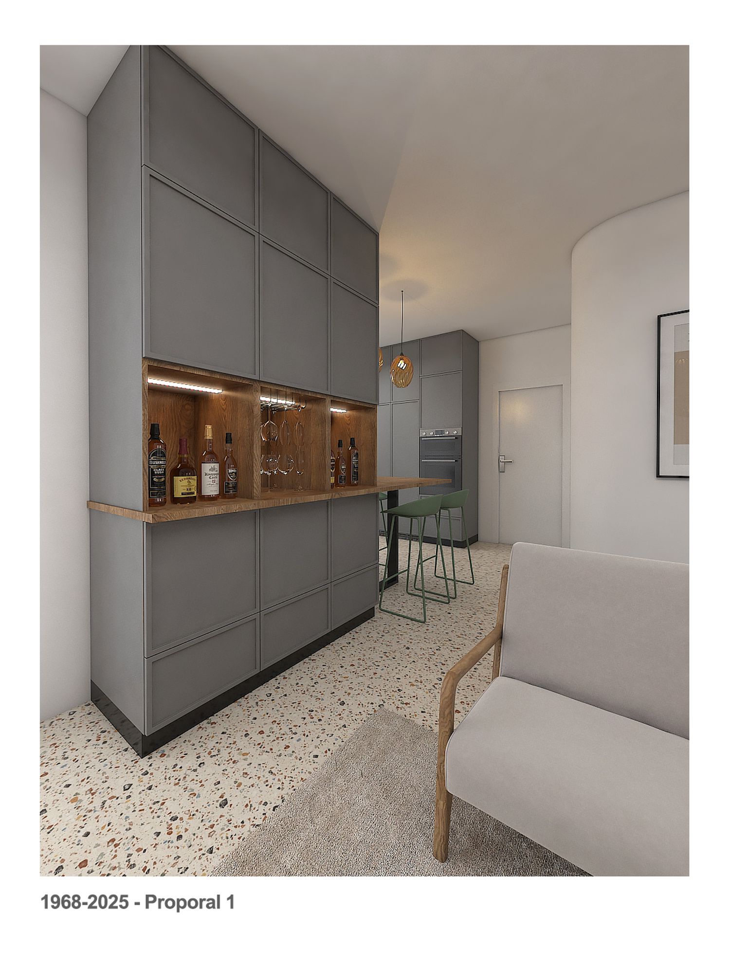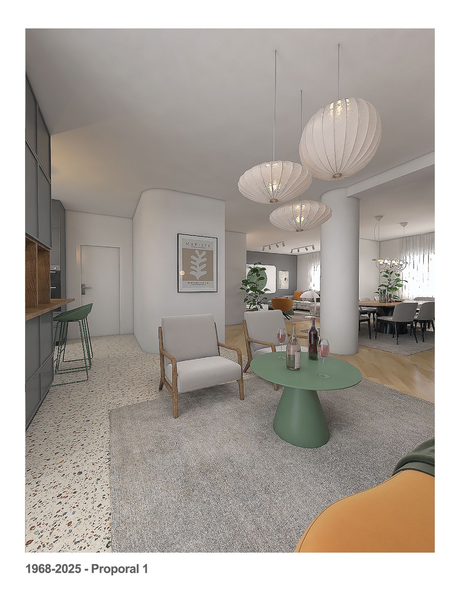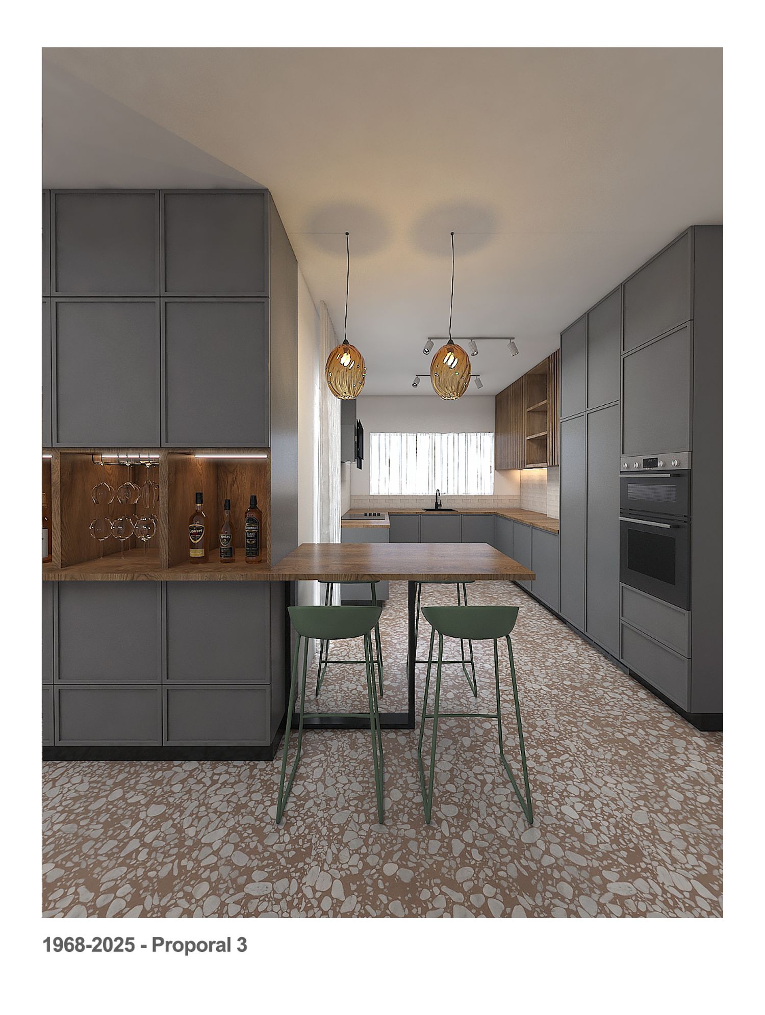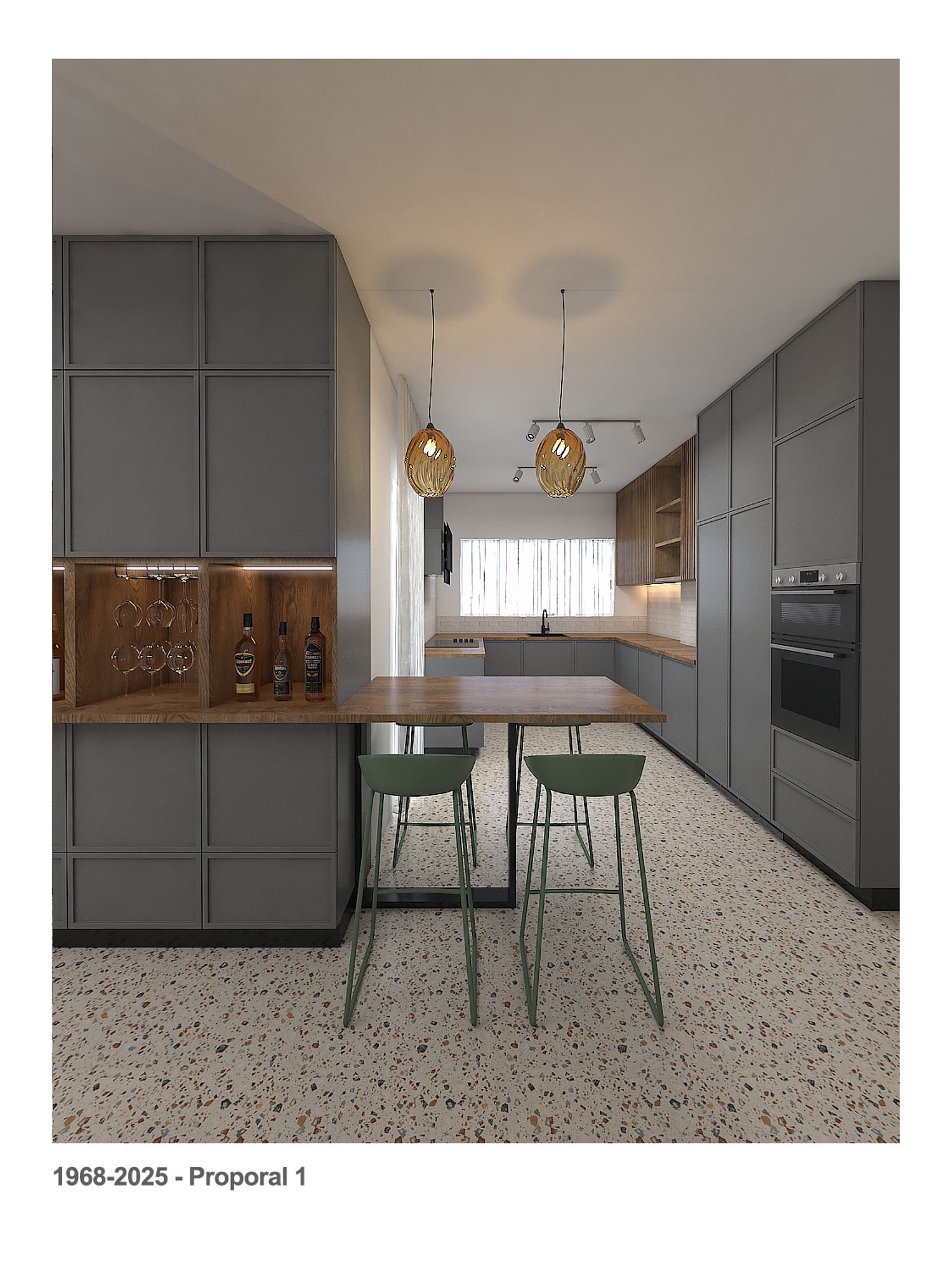 We kept the kitchen in its current area, replaced the current large breakfast table with a counter with 4 chairs, and provided a large storage cabinet that also has a wine cellar, the wine cellar can serve the kitchen counter and the living area.