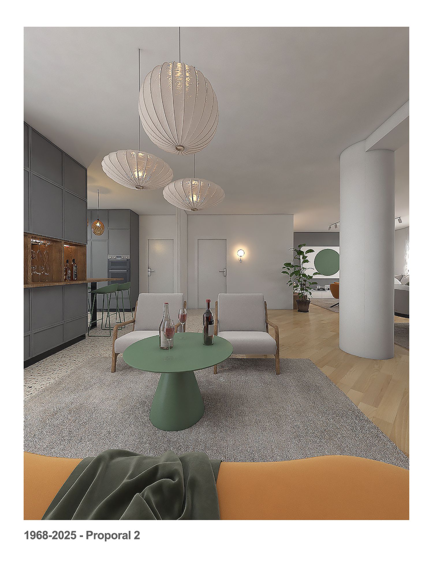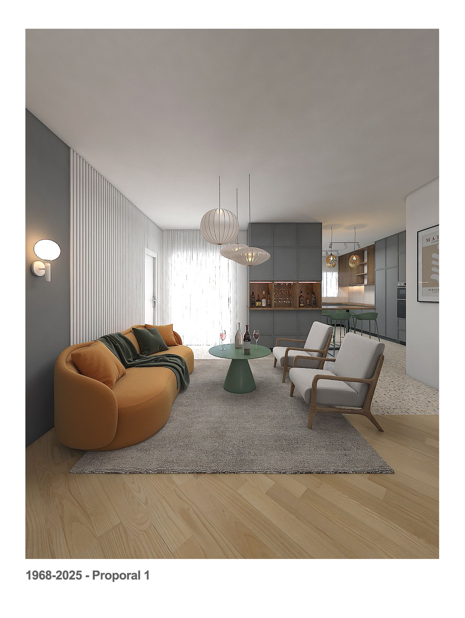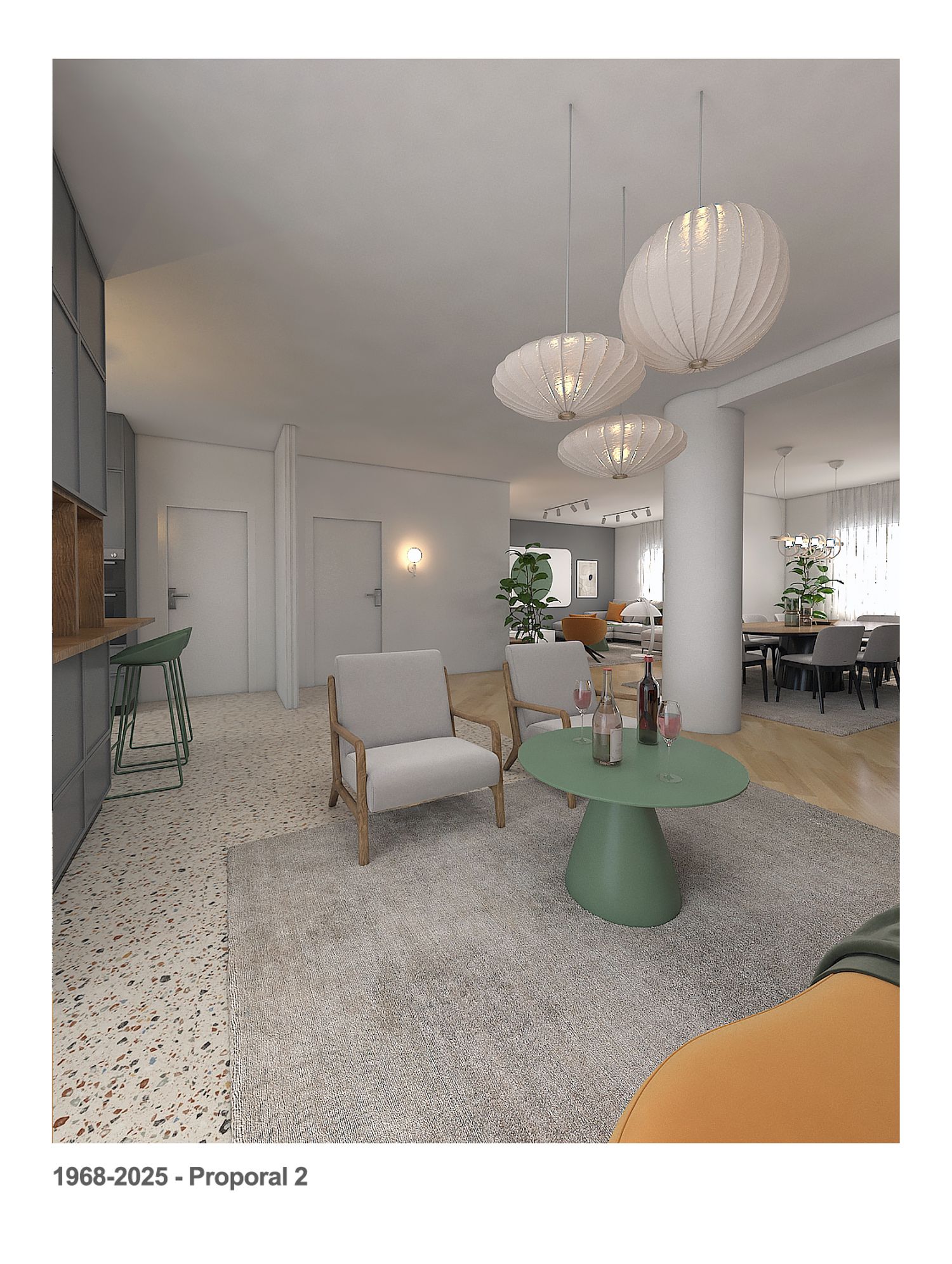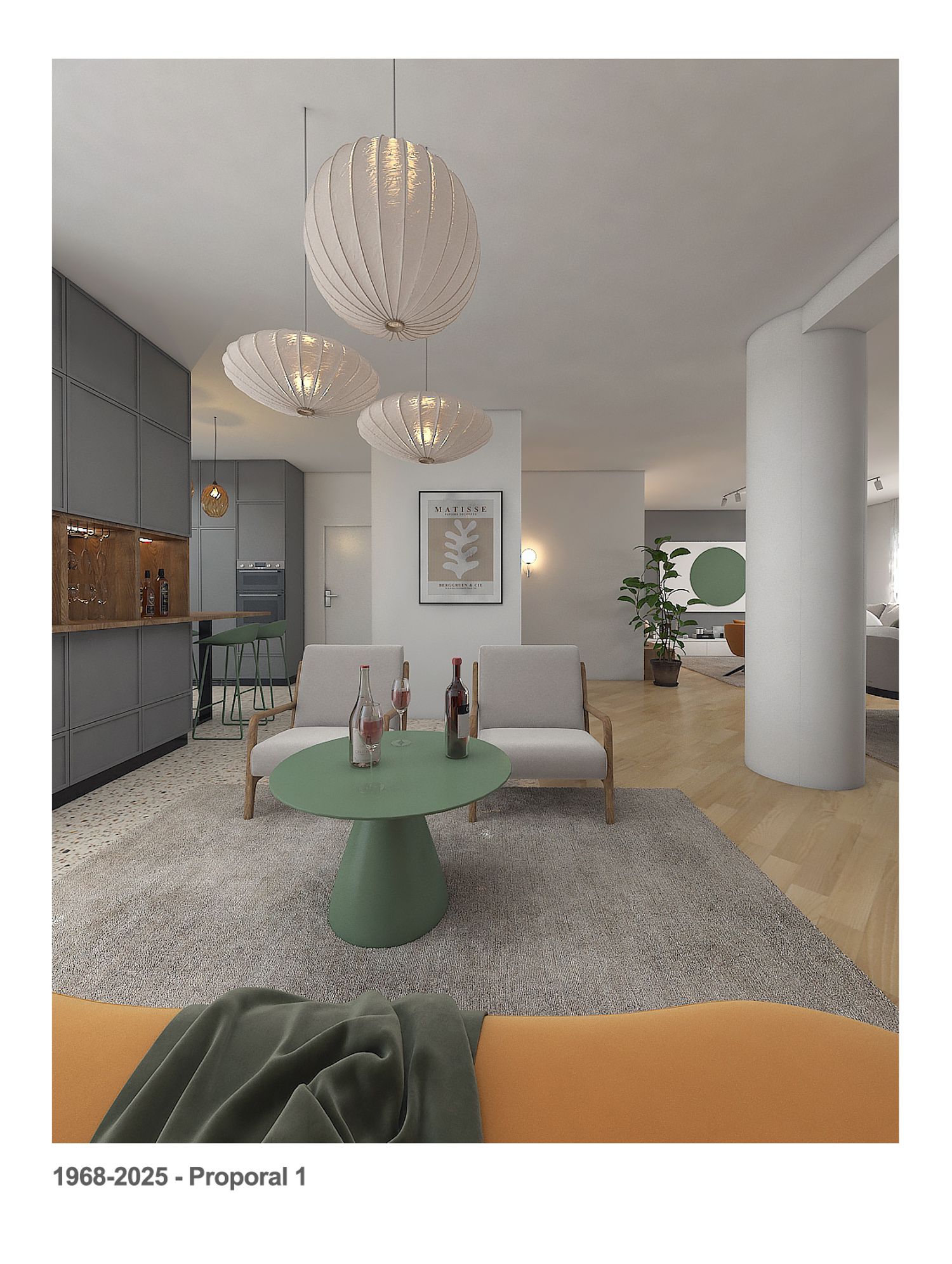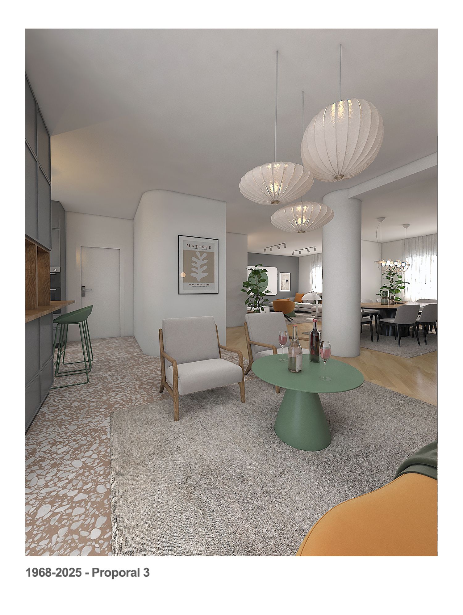 We kept the kitchen in its current area, replaced the current large breakfast table with a counter with 4 chairs, and provided a large storage cabinet that also has a wine cellar, the wine cellar can serve the kitchen counter and the living area.