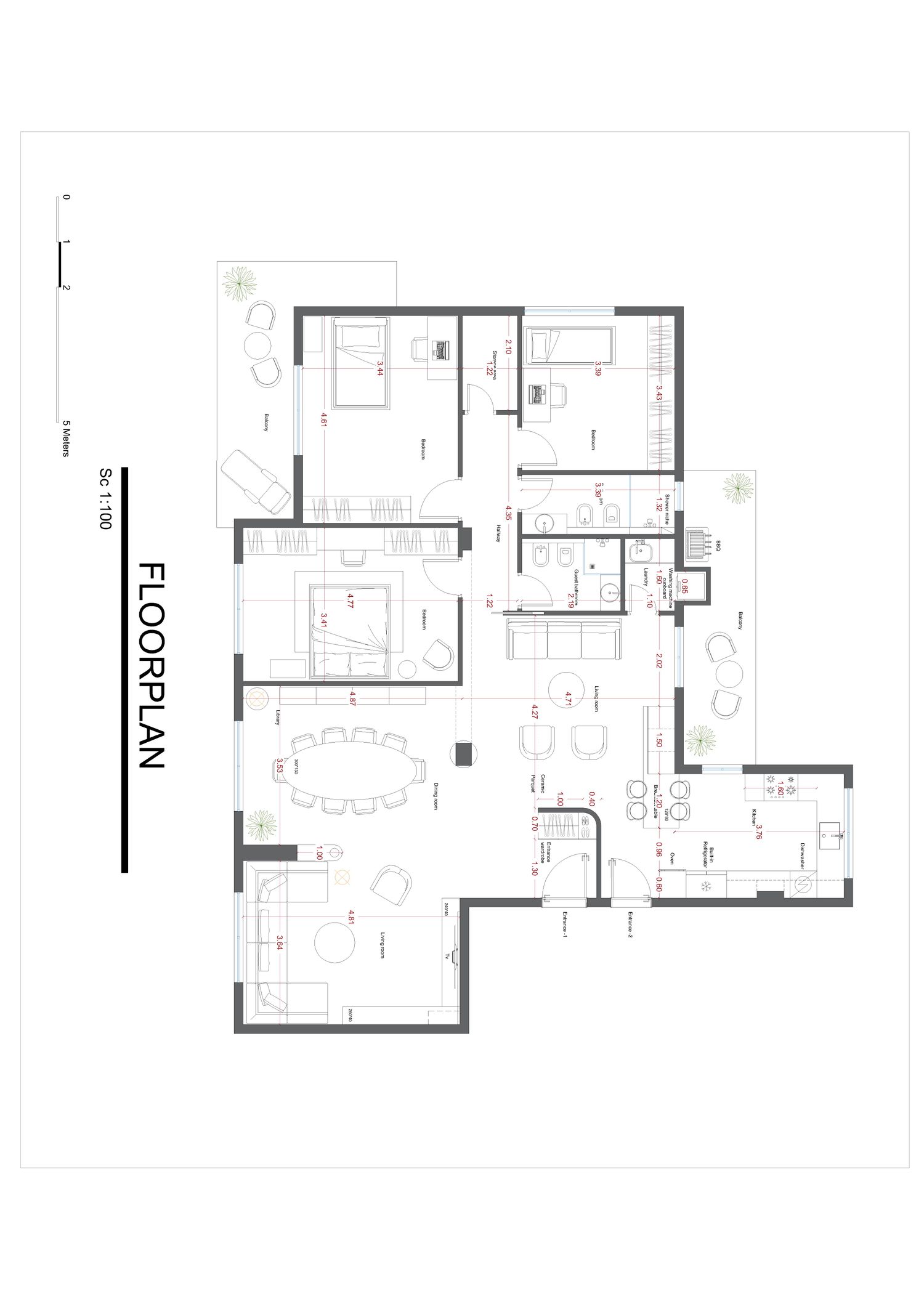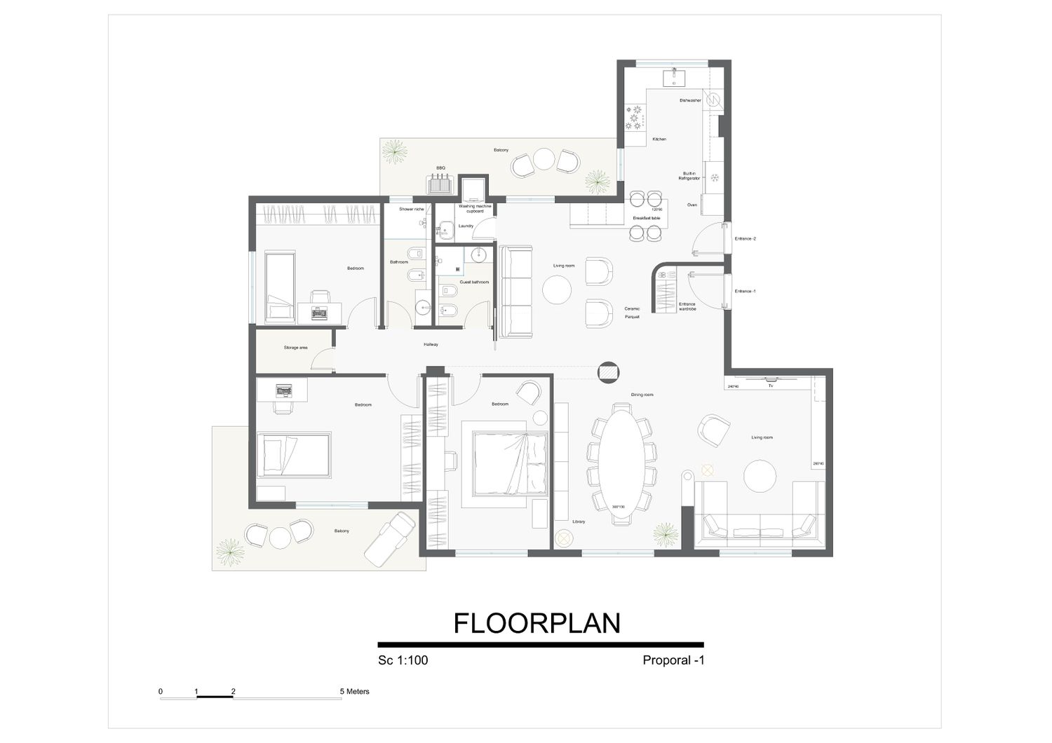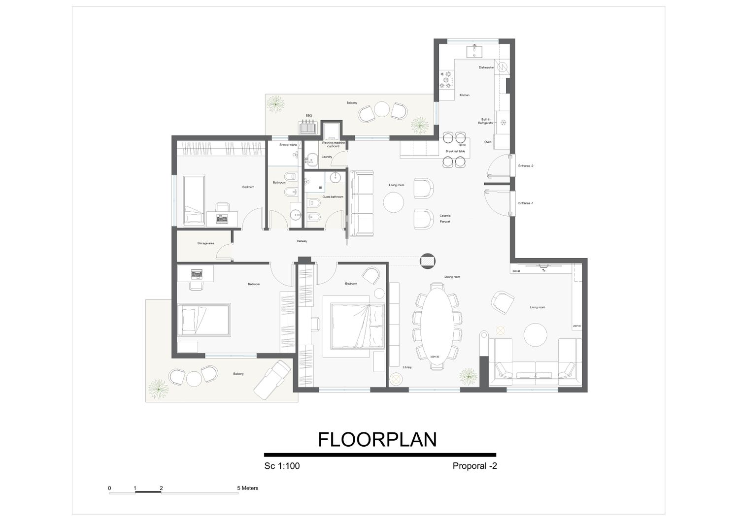 Nella zona d'ingresso, abbiamo proposto due progetti: in uno è presente una parete di un metro tra le due porte d'ingresso, mentre nell'altro abbiamo previsto un armadio per gli ospiti nella zona d'ingresso, che proteggeva la porta d'ingresso dall'esterno.