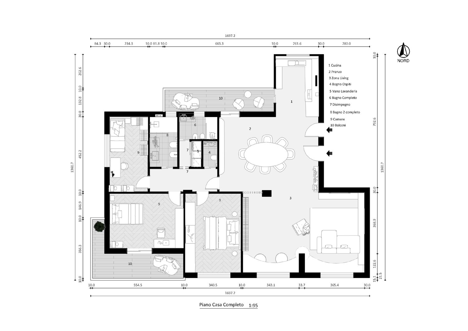L’area dei servizi è stata completamente razionalizzata, introducendo un bagno ospiti, due bagni completi e un vano lavanderia dedicato, organizzati in modo compatto e funzionale per ridurre i percorsi e migliorare la fruibilità quotidiana.
