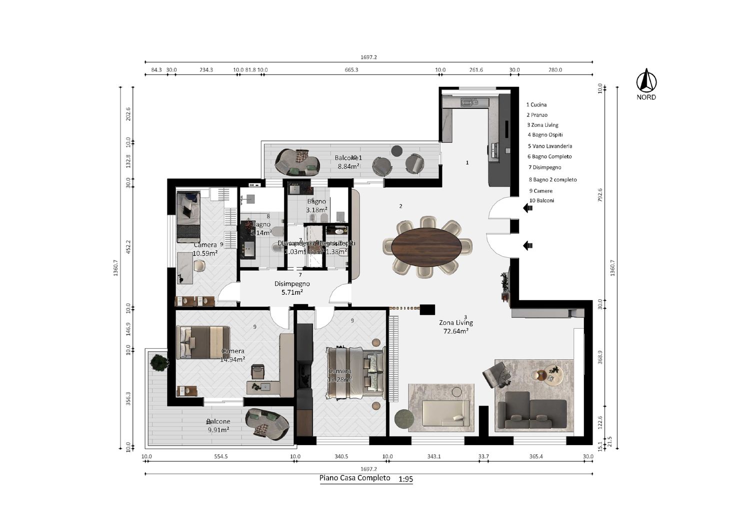 L’intervento si concentra sulla ridefinizione della zona giorno e sulla riorganizzazione dei servizi, con l’obiettivo di ottenere spazi più fluidi, leggibili e coerenti con le esigenze dell’abitare contemporaneo.