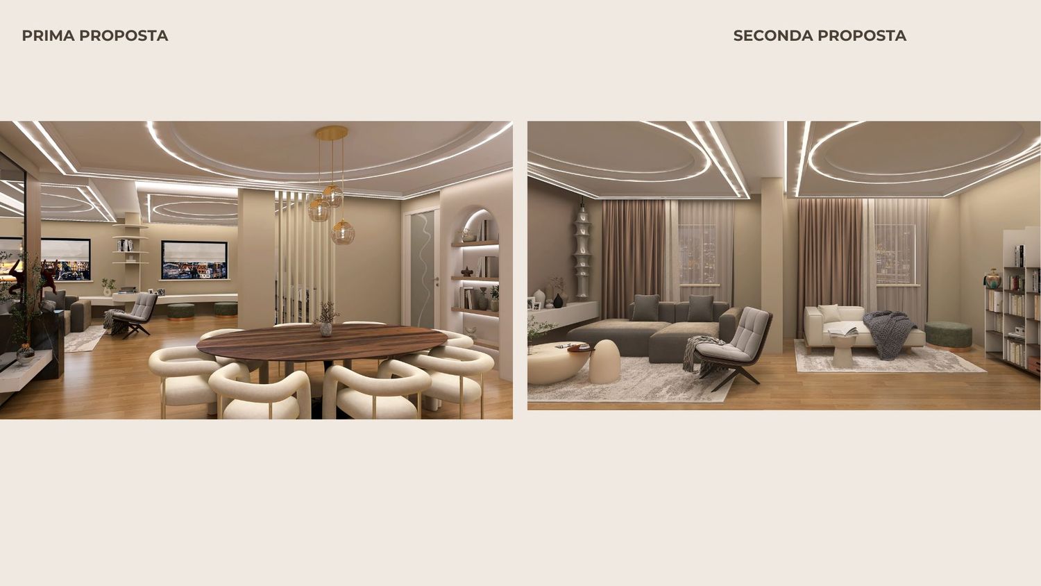 La nuova disposizione prevede una zona giorno ampia e continua, dove cucina, pranzo e living dialogano tra loro in modo naturale, valorizzata da un sistema di controsoffitti e illuminazione che accompagna la percezione dello spazio senza appesantirlo.