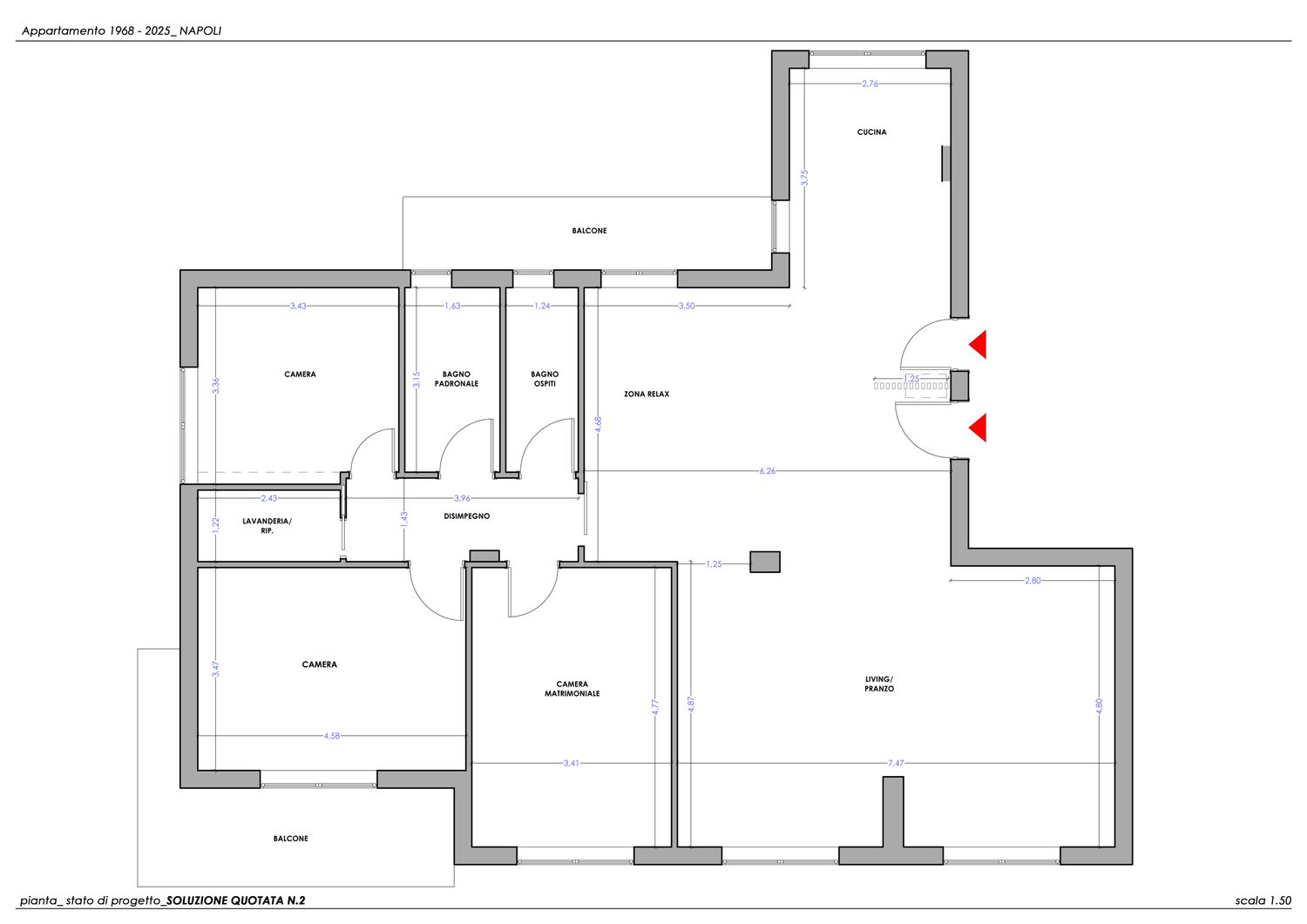 Un altro intervento chiave riguarda l’arretramento della porta esistente, quella dal forte carattere scenografico nelle tonalità rosso/arancio/lilla, che viene riallineata alla parete del primo WC, garantendo una maggiore coerenza geometrica e distributiva. Contestualmente, è stata prevista la rimozione della pedana esistente, a favore di una superficie continua e più contemporanea.