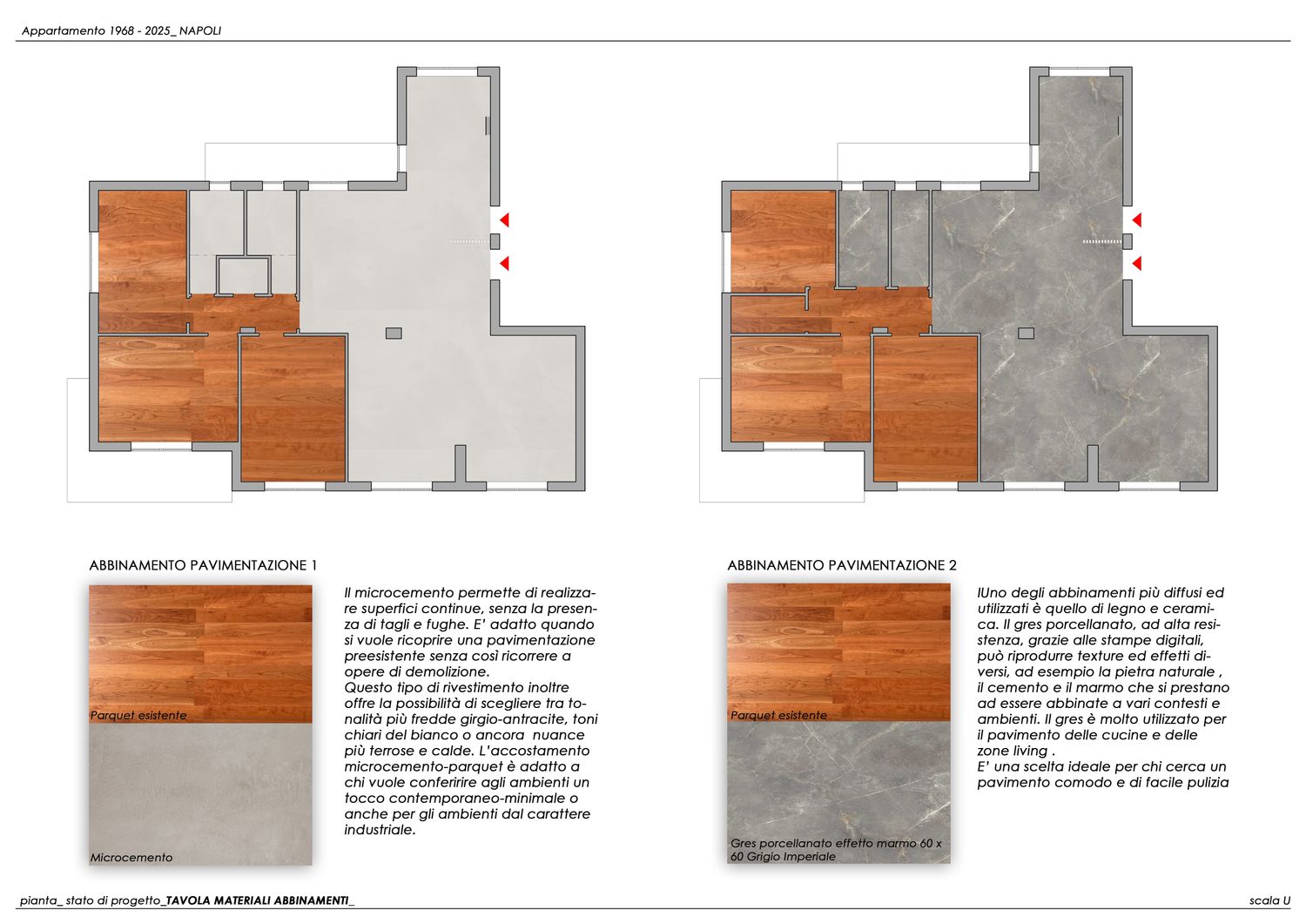 Infine, sono state elaborate due tavole di progetto pensate per illustrare le possibili soluzioni di abbinamento tra il parquet esistente e le nuove pavimentazioni, al fine di garantire continuità materica ed estetica con le scelte progettuali proposte.