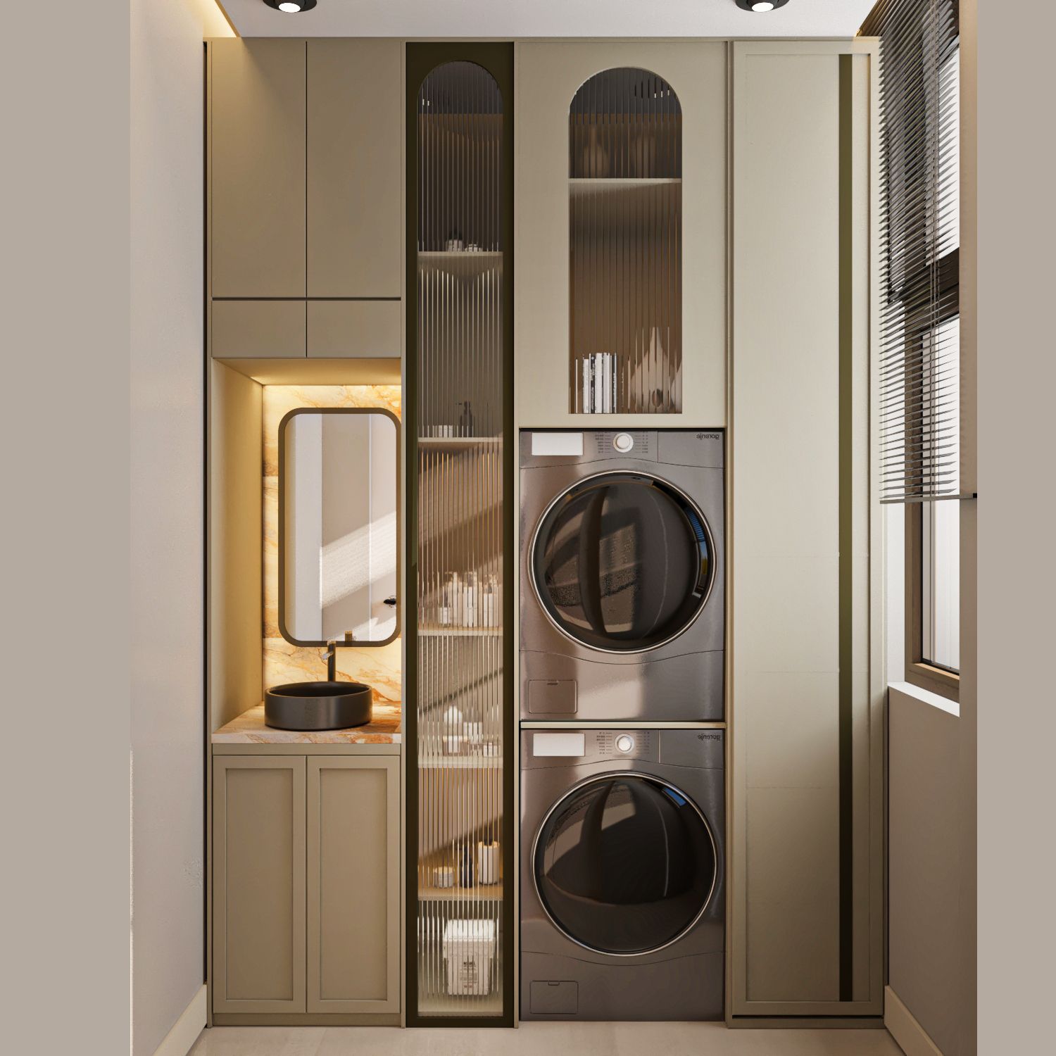 - Zona pranzo e ripostiglio: ora c'è molto spazio per il vostro grande tavolo da pranzo. Abbiamo anche aggiunto un'area nascosta per la lavanderia e il ripostiglio per mantenere l'appartamento organizzato.
