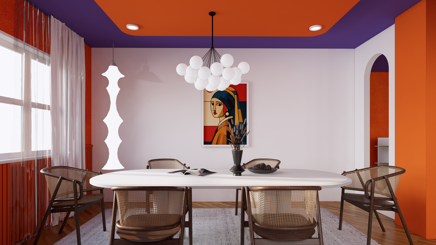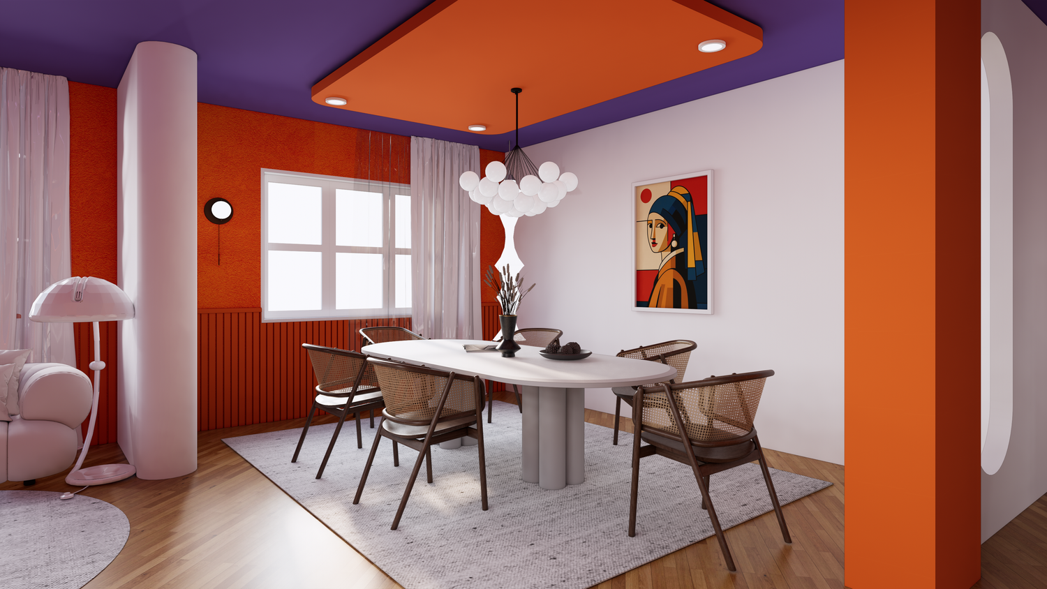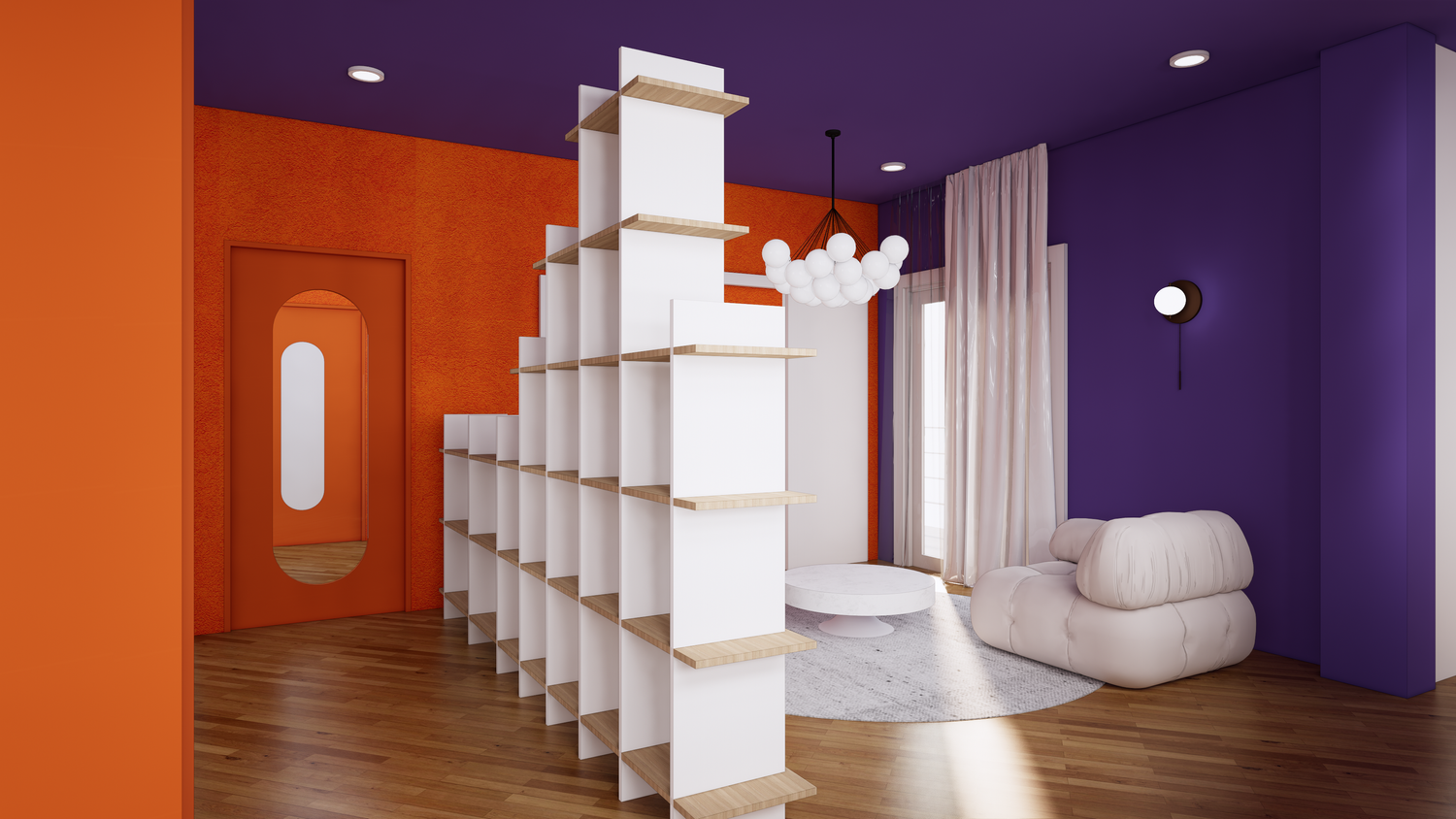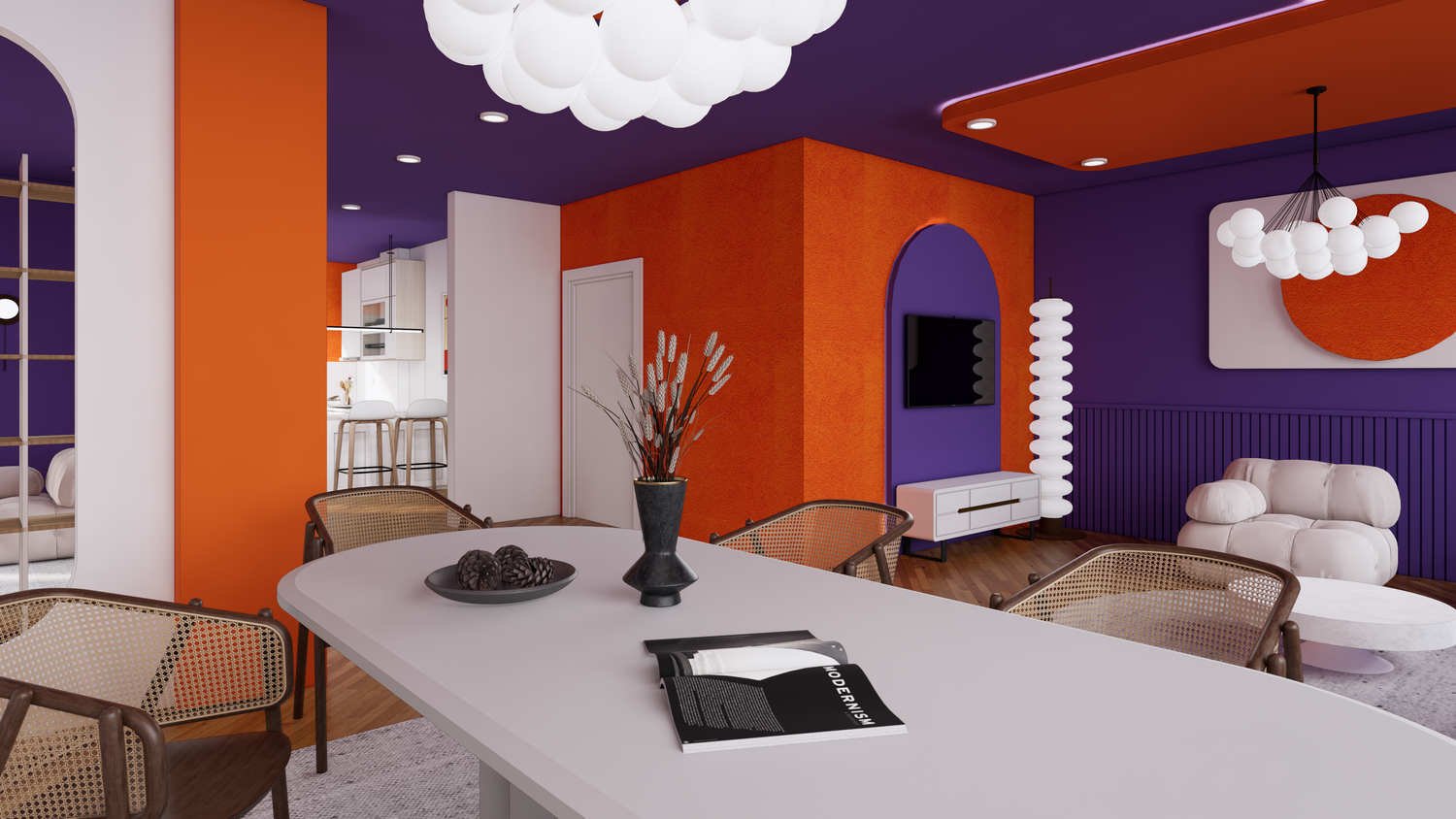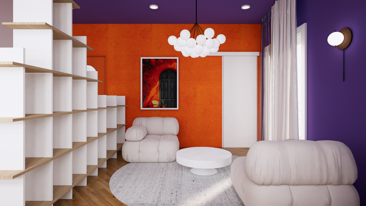 Thank you for this great project. I tried to create a design with a combination of dark purple, orange, and white. In the living room area, there is a sofa, armchair, and a round table. On the other side of the living room, there are bookshelves and armchairs. In the dining area, there is a large oval dining table.