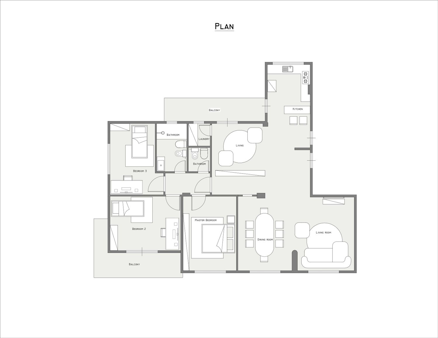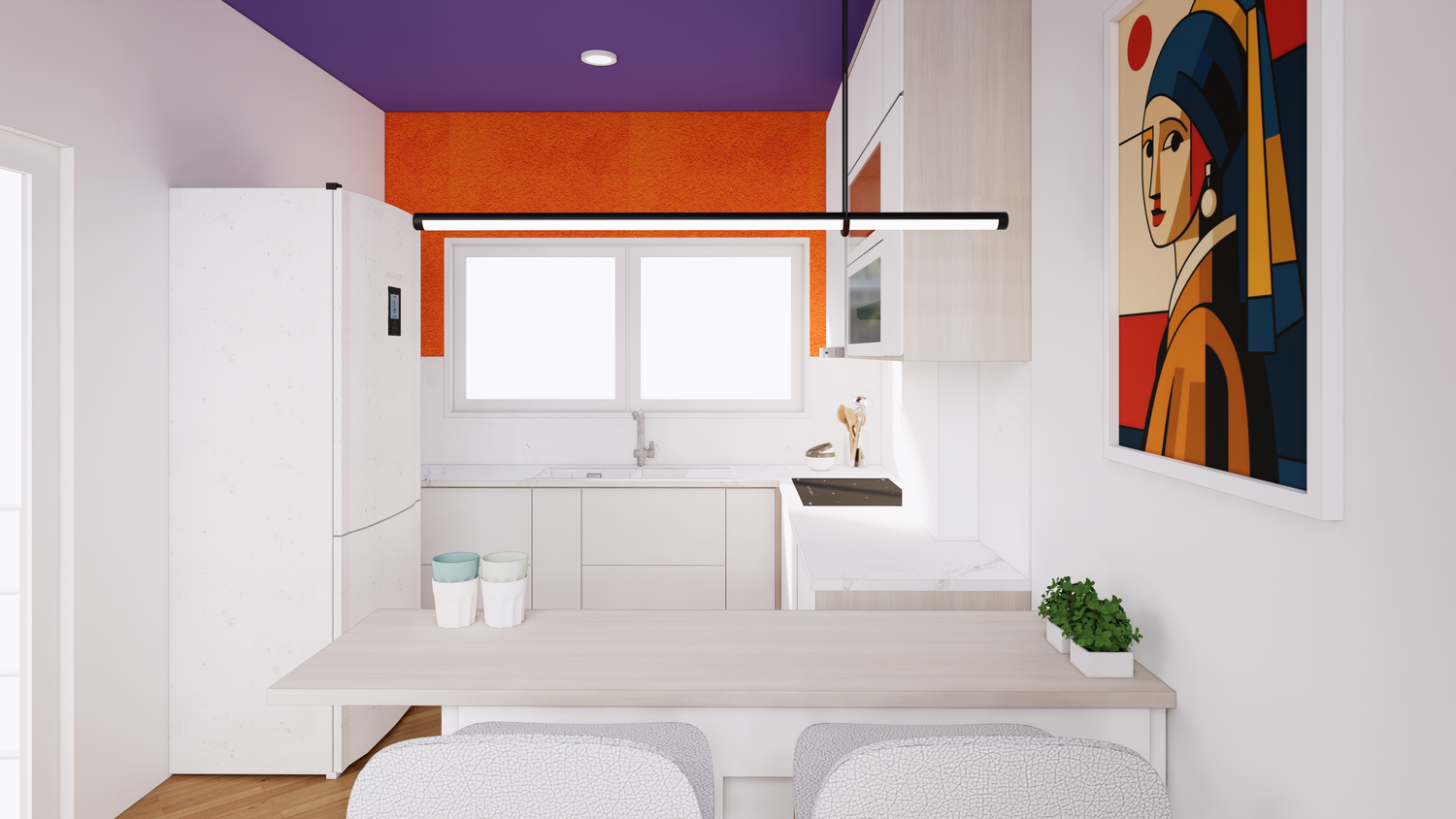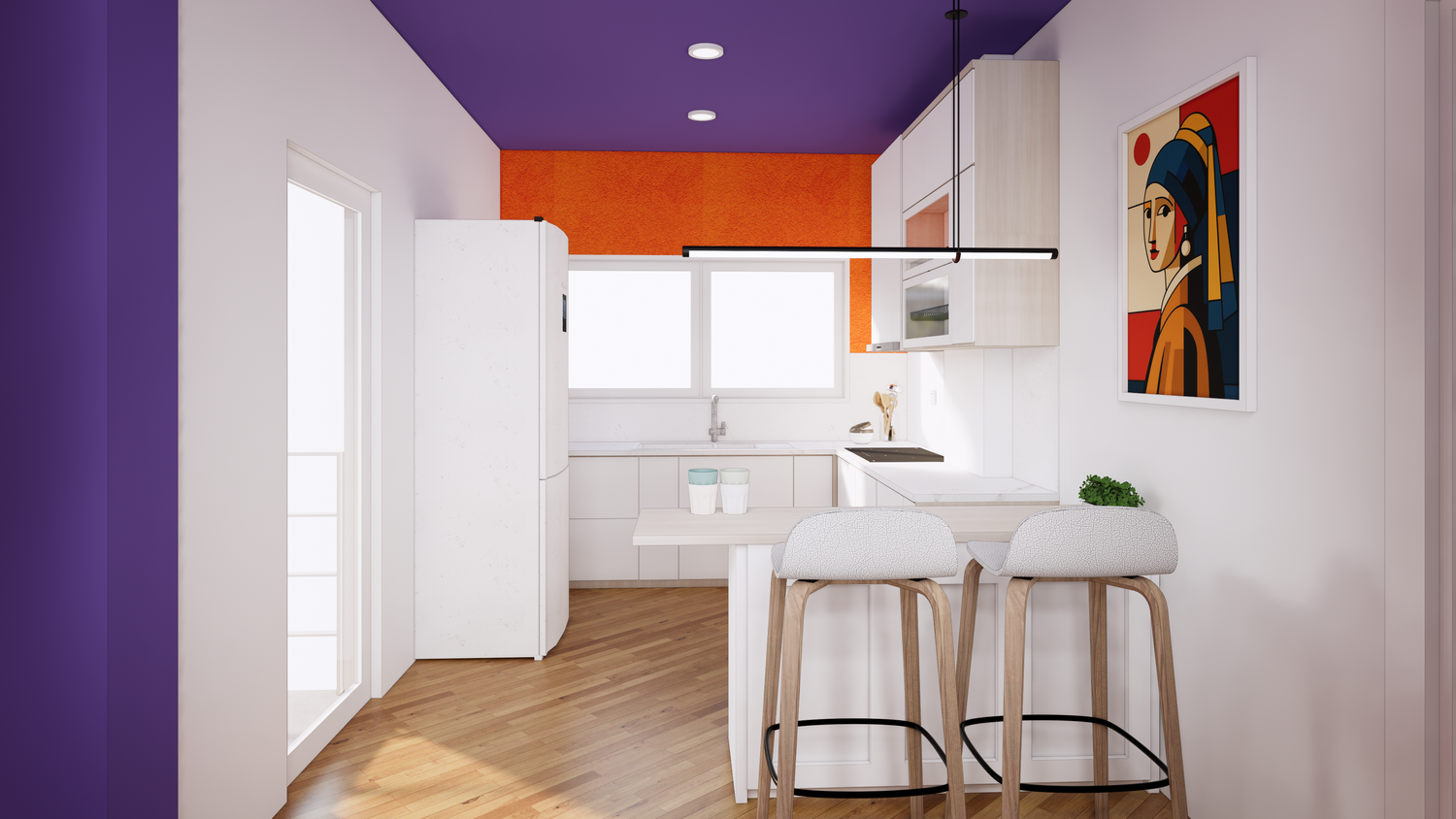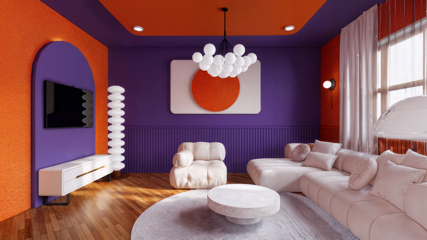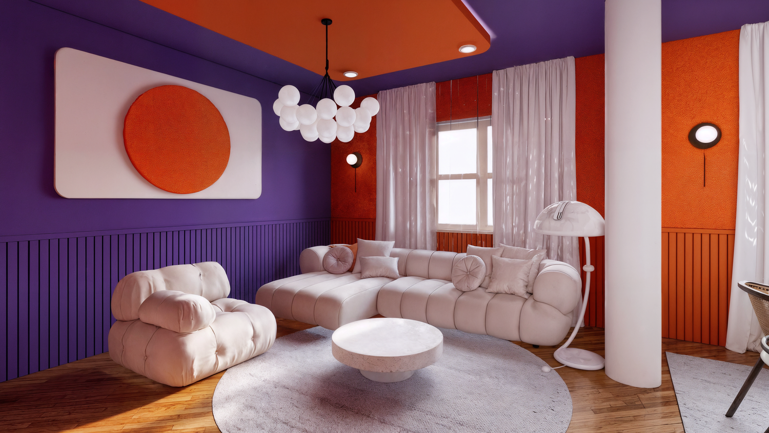 Thank you for this great project. I tried to create a design with a combination of dark purple, orange, and white. In the living room area, there is a sofa, armchair, and a round table. On the other side of the living room, there are bookshelves and armchairs. In the dining area, there is a large oval dining table.