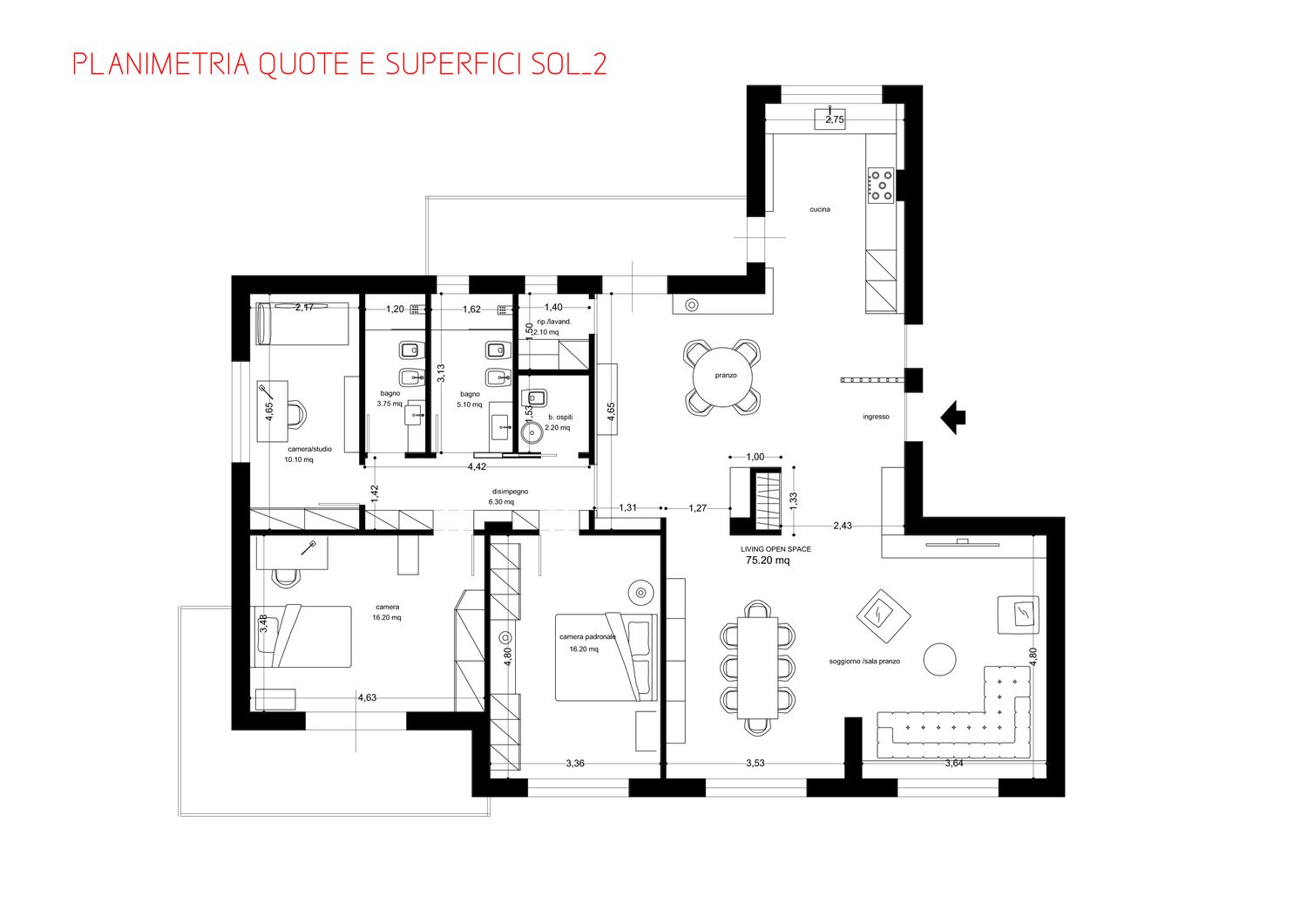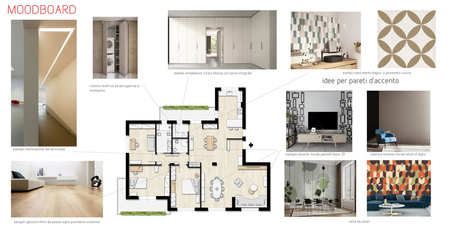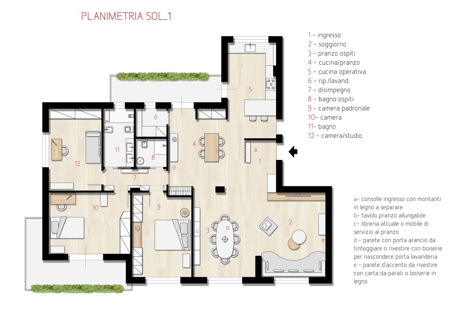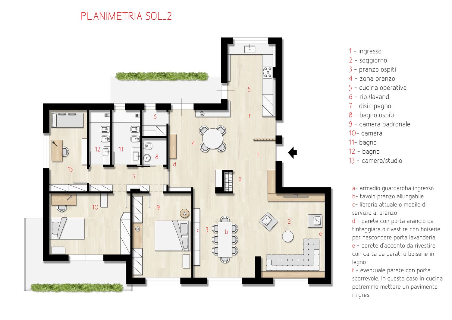 Per rappresentare lo spazio in base alle vostre esigenze sono state realizzate due soluzioni che partono entrambe dagli stessi input da voi descritti ma con differenti accorgimenti in particolare per quanto riguardano le zone accessorie come la lavanderia con diretto accesso dalla cucina e di sevizio dato che una soluzione si compone di due bagni e l’altra di tre. Entrando in casa siamo accolti da una prima zona d’ingresso che fa da filtro con l’intero appartamento così da rendere meno impattanti alla vista la cucina e il tavolo pranzo secondario; mentre la vista si apre sul living con grande divano proposta in una soluzione più lineare e nell’altra curvo e sulla grande sala da pranzo con tavolo allungabile per ospitare numerose persone. Particolare attenzione è stata rivolta ai dettagli con comode armadiature a filo parete per non invadere gli spazi e dare linearità all’intero ambiente. Le camere sono tre di cui due non vengono modificate mentre una viene leggermente ridotta per dare spazio al bagno.