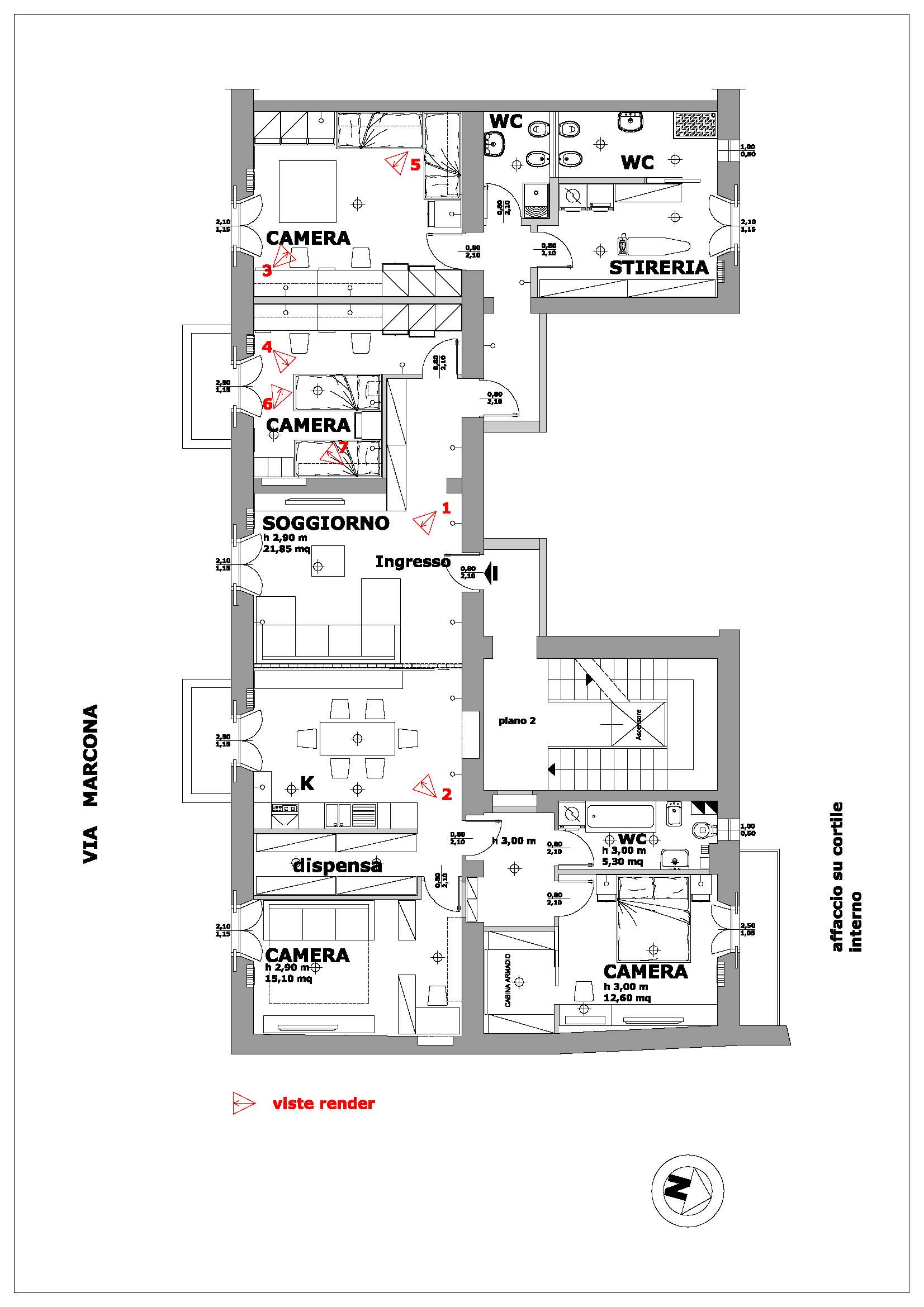 La zona lato strada è molto luminosa e pertanto concentreremmo le camere il più possibile nella parte opposta.