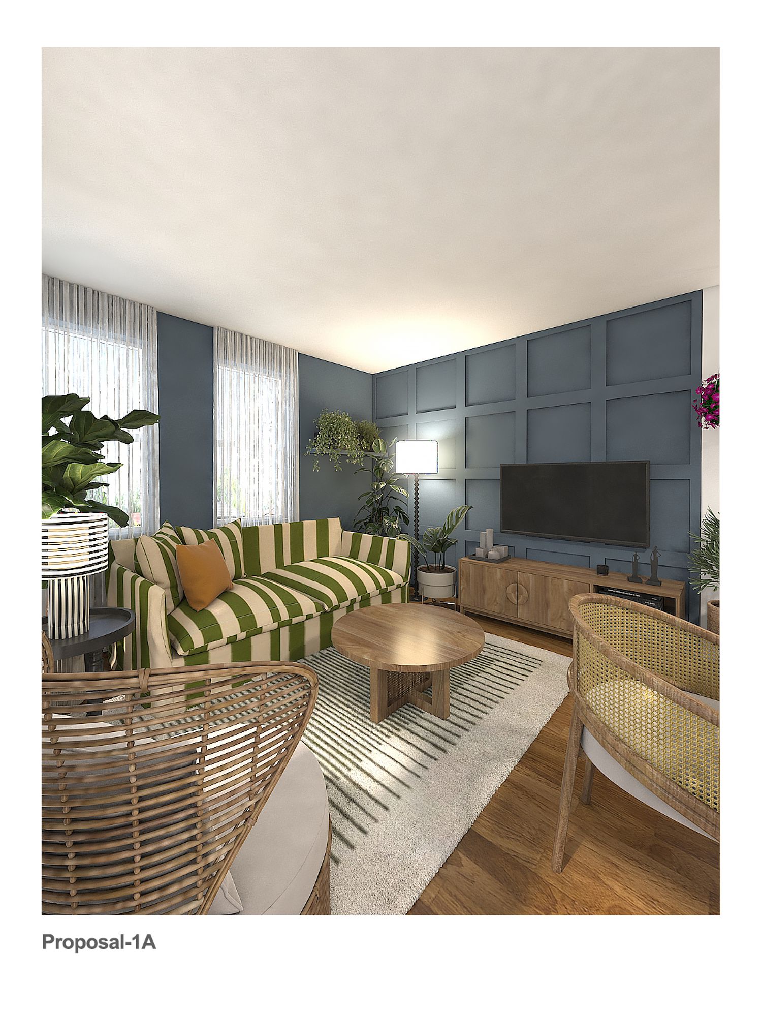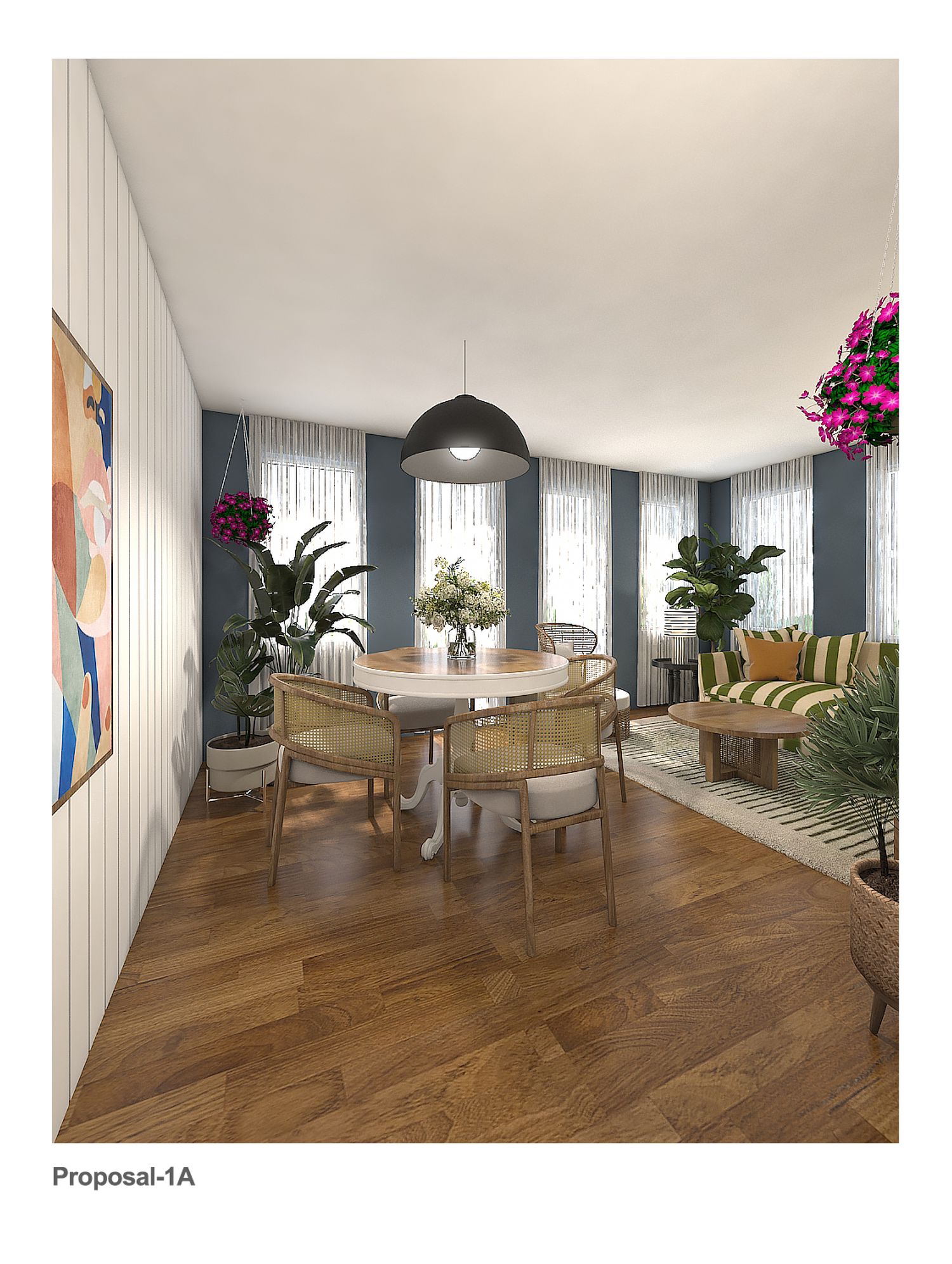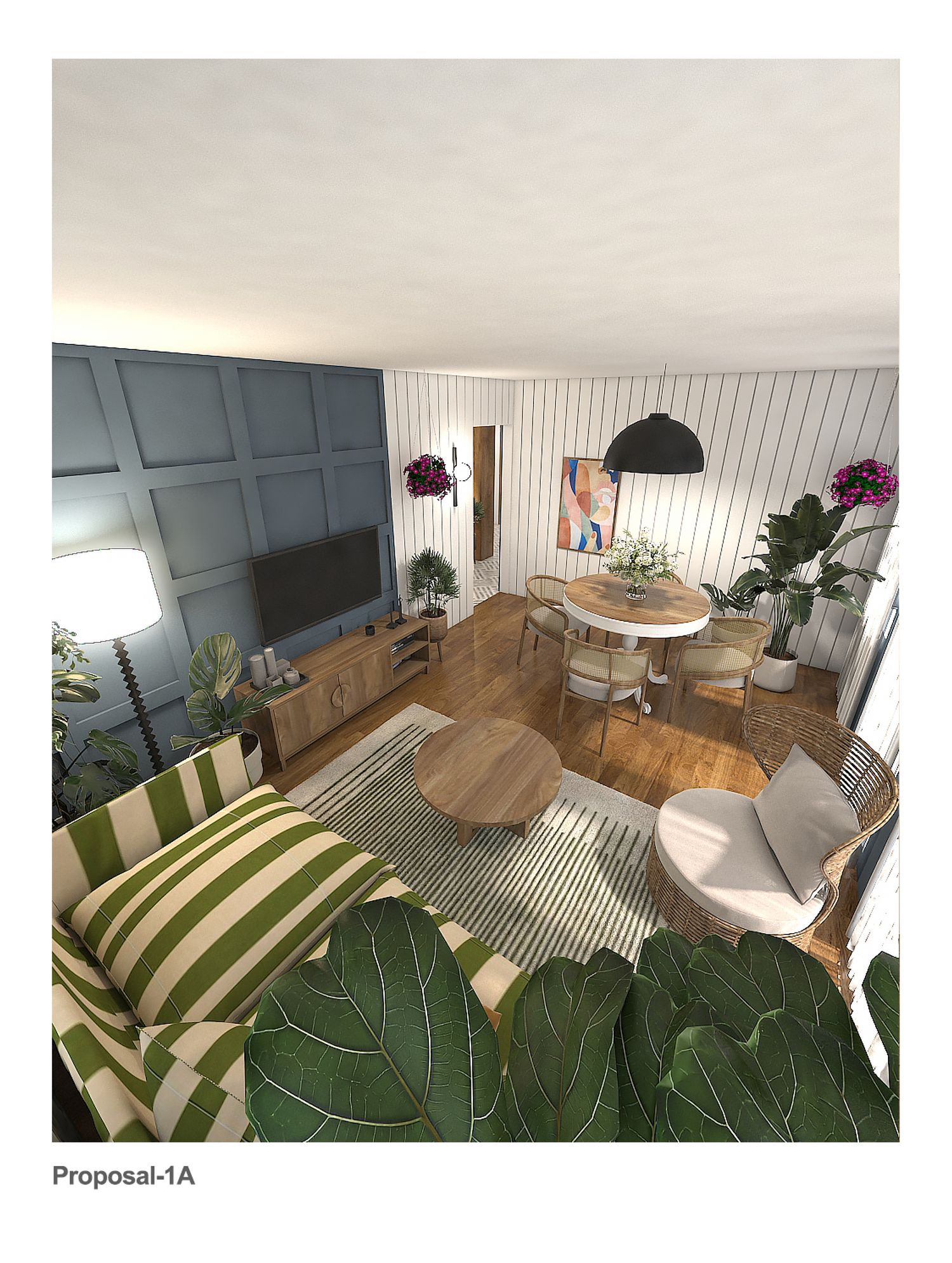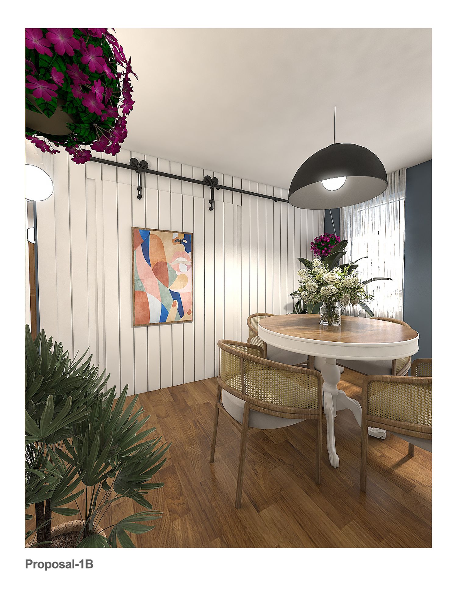 The second proposal assumes that the current walls are fixed and creates a sliding door between the dining/living room and the kitchen.