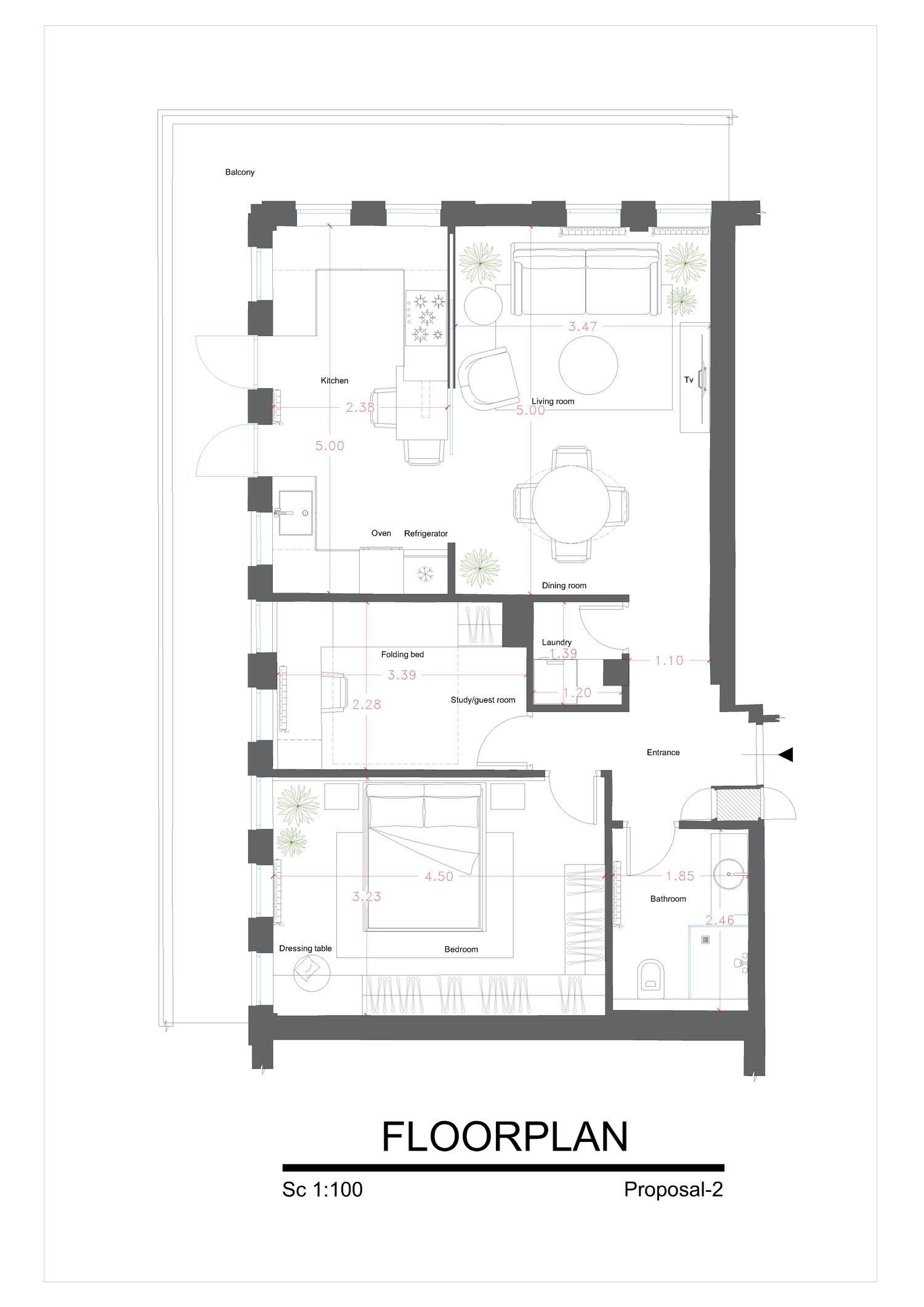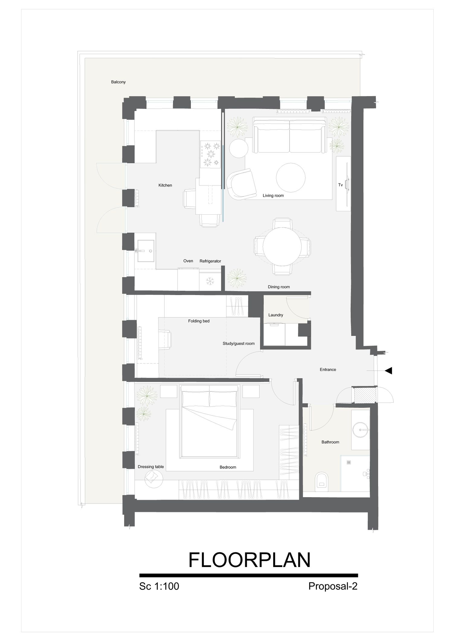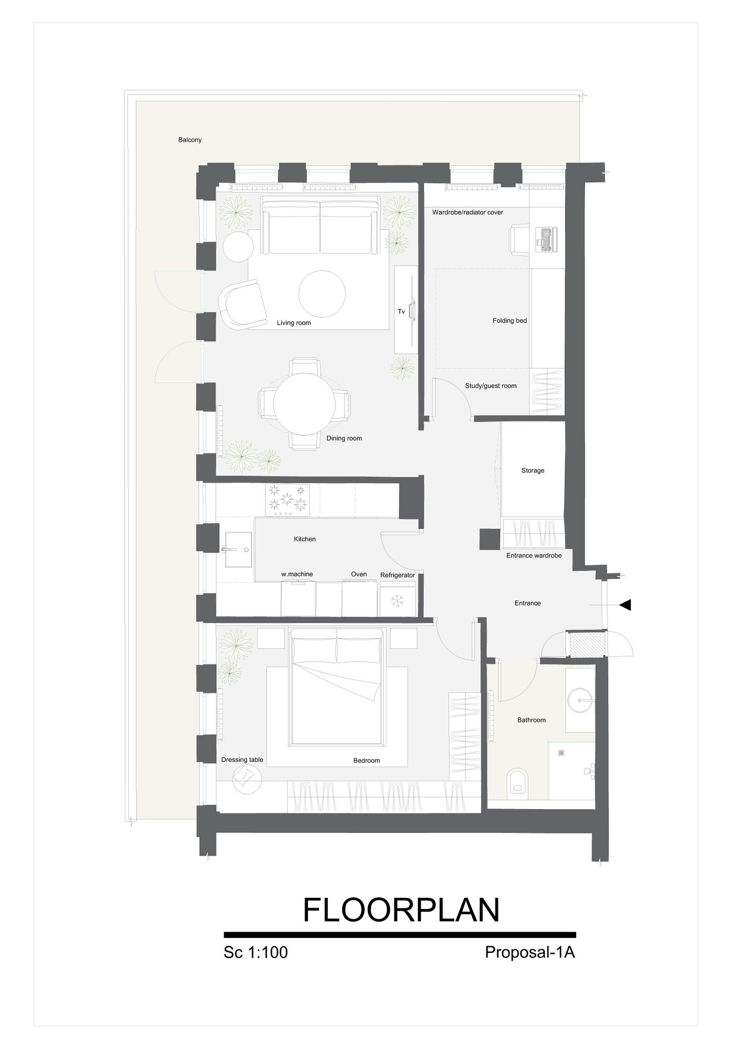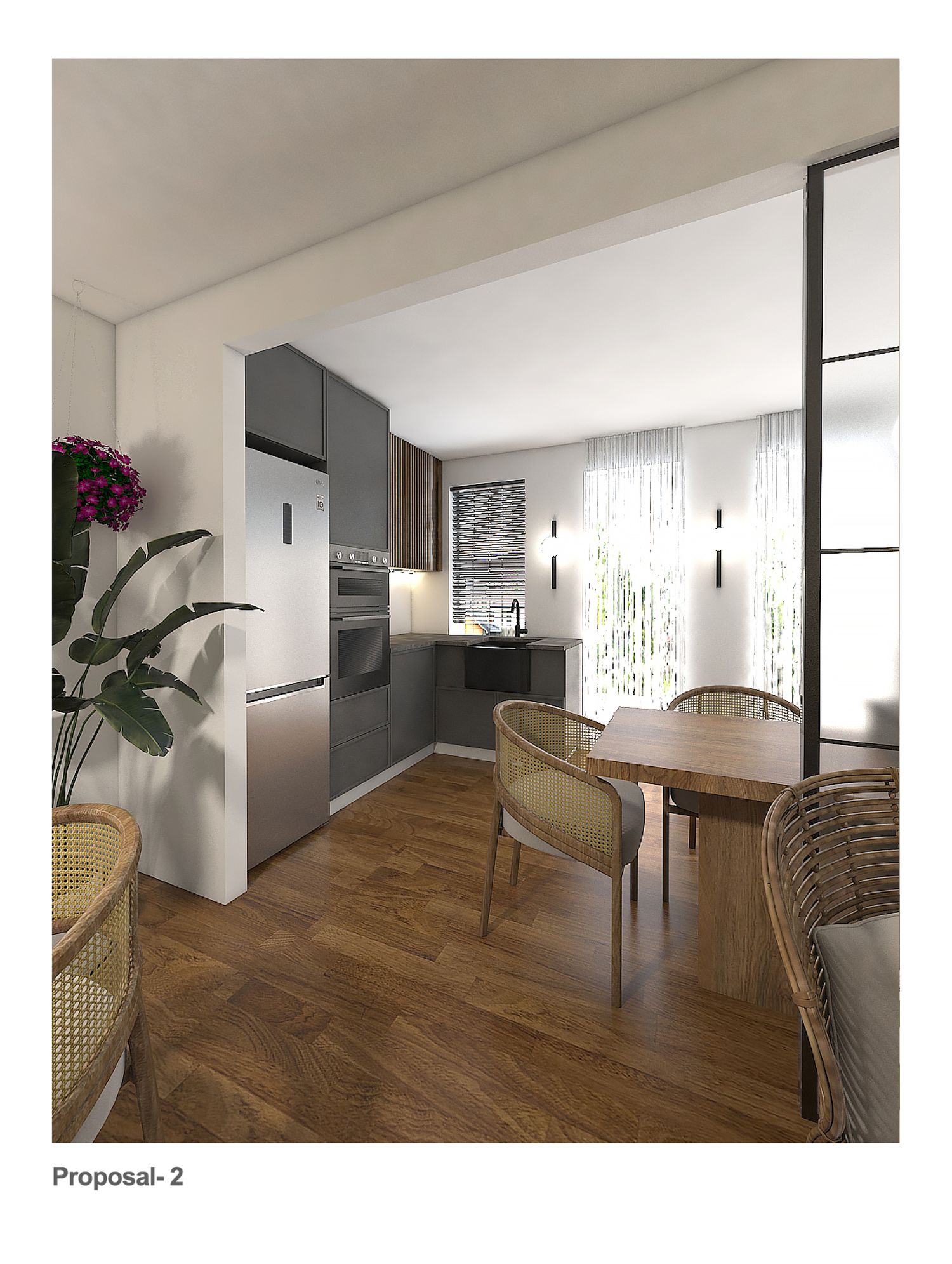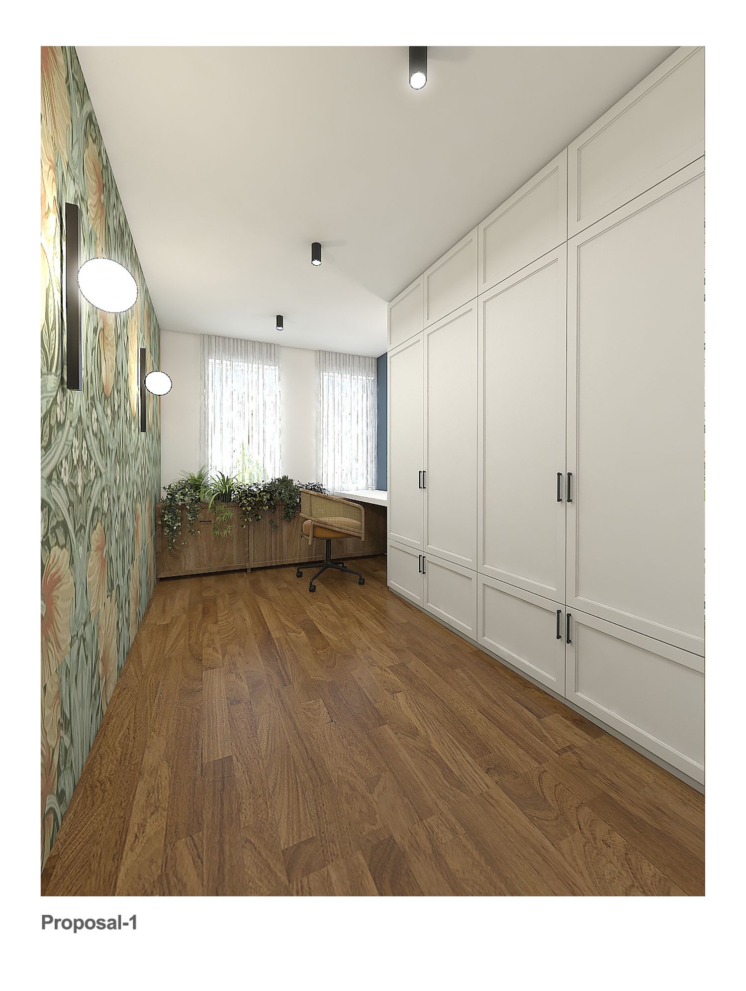 In the first and second proposals, an entrance wardrobe and a storage room (built with two wooden doors and without new walls) are foreseen in the hallway, which is a place to store extra items and extra chairs for the dining table.