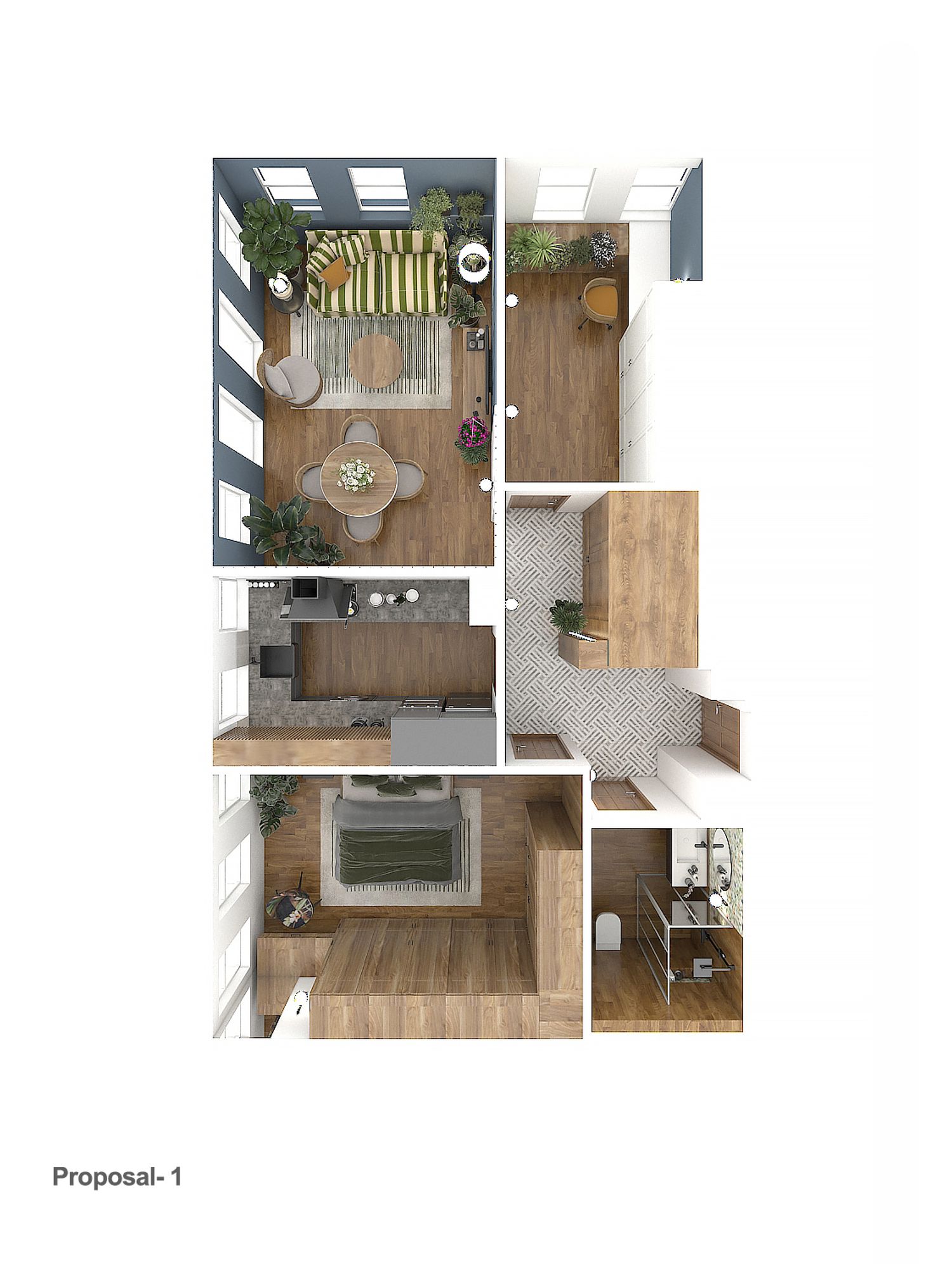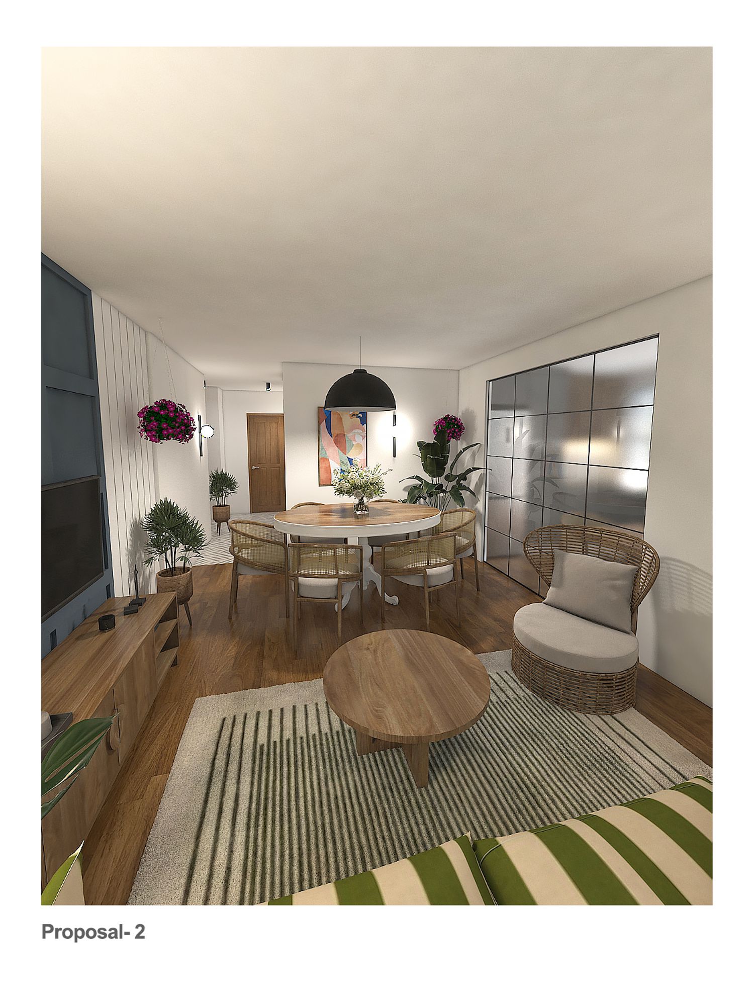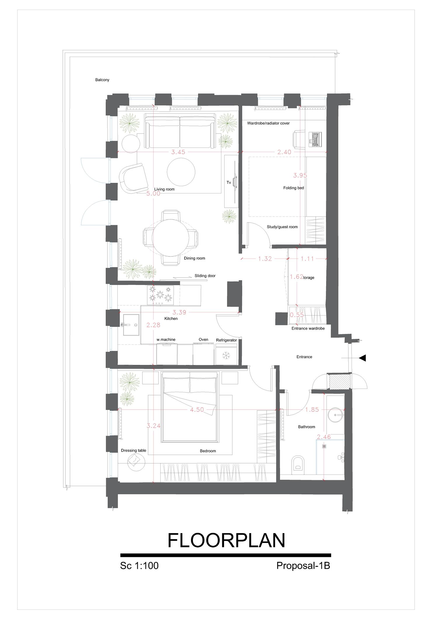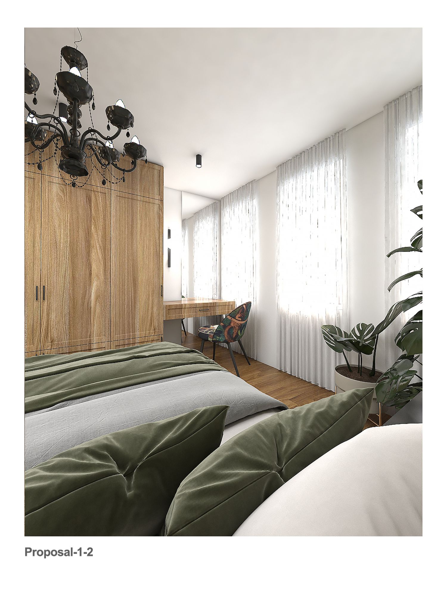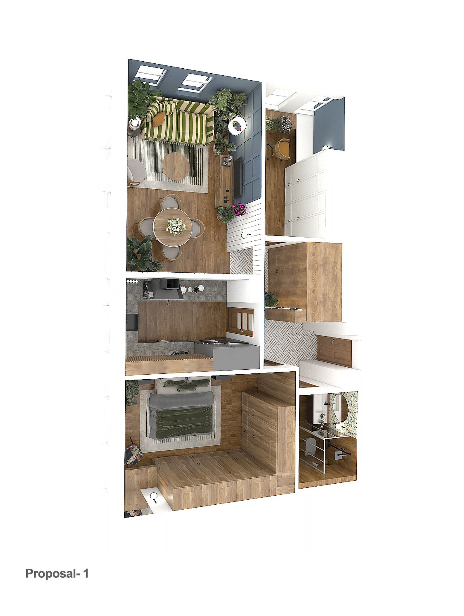 In the first and second proposals, an entrance wardrobe and a storage room (built with two wooden doors and without new walls) are foreseen in the hallway, which is a place to store extra items and extra chairs for the dining table.