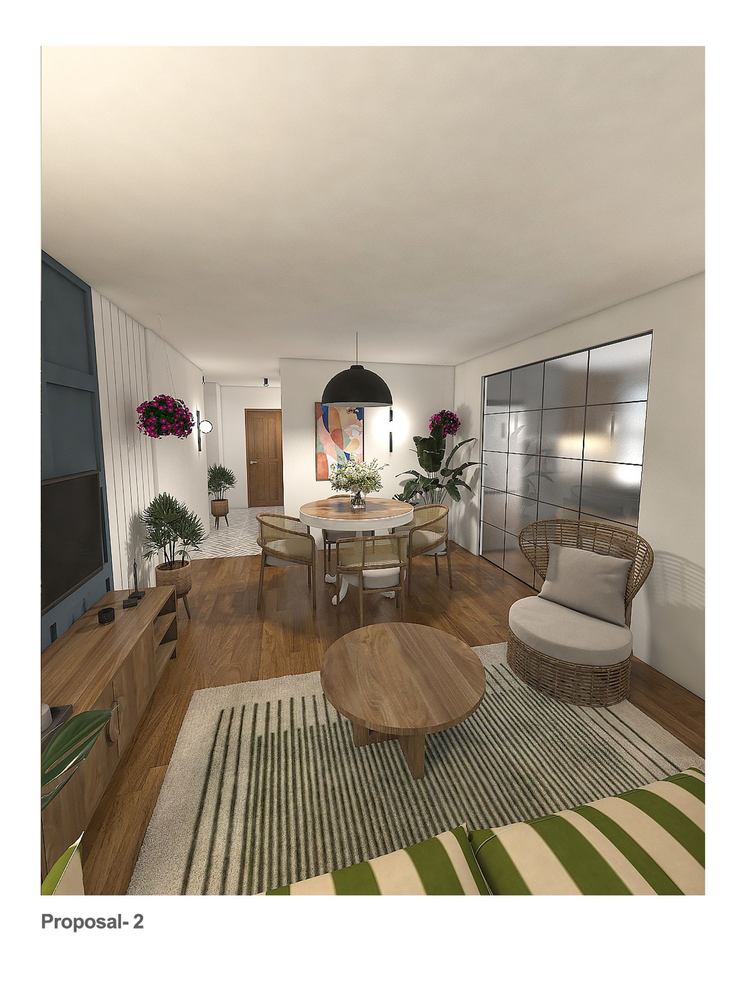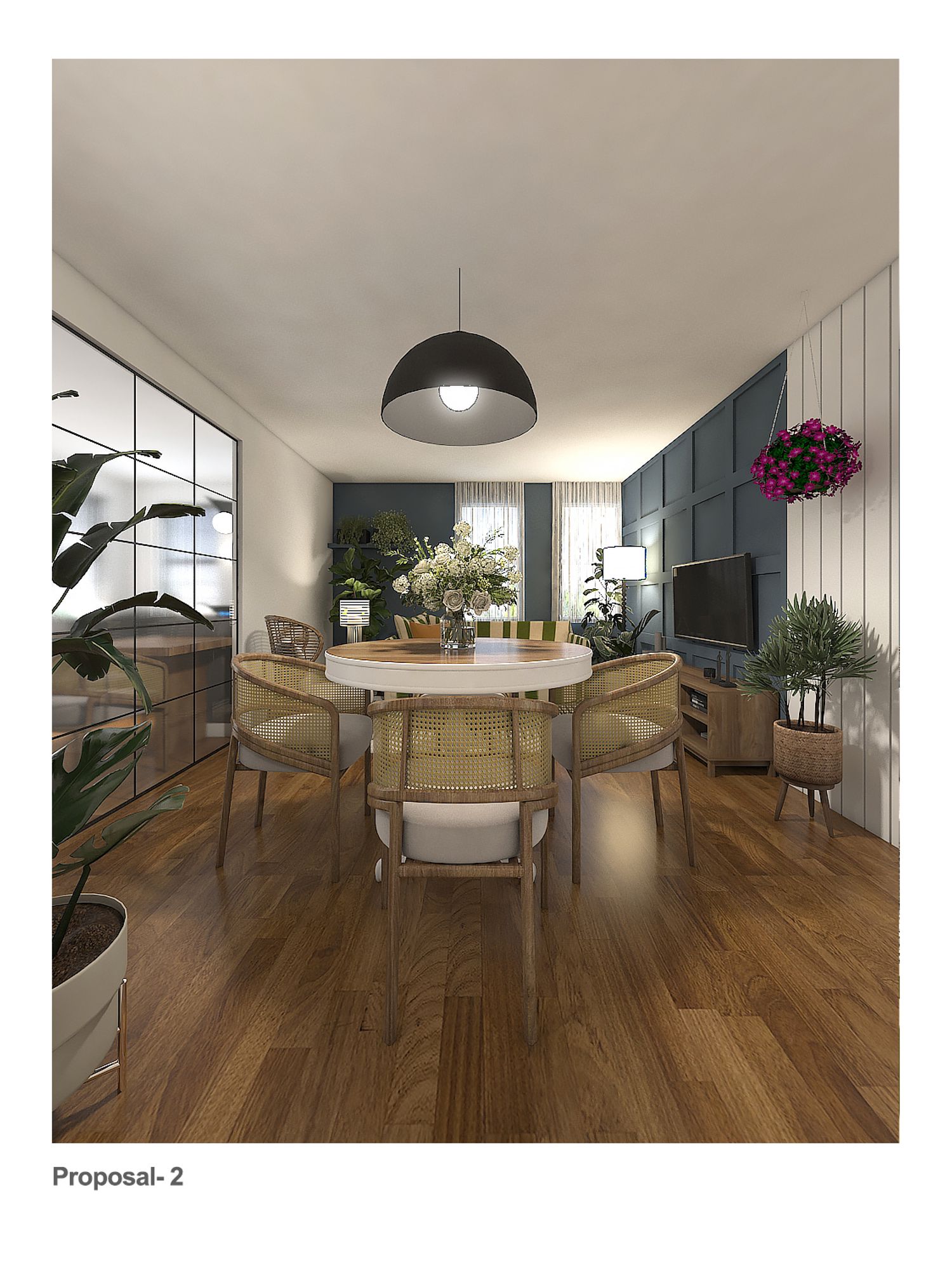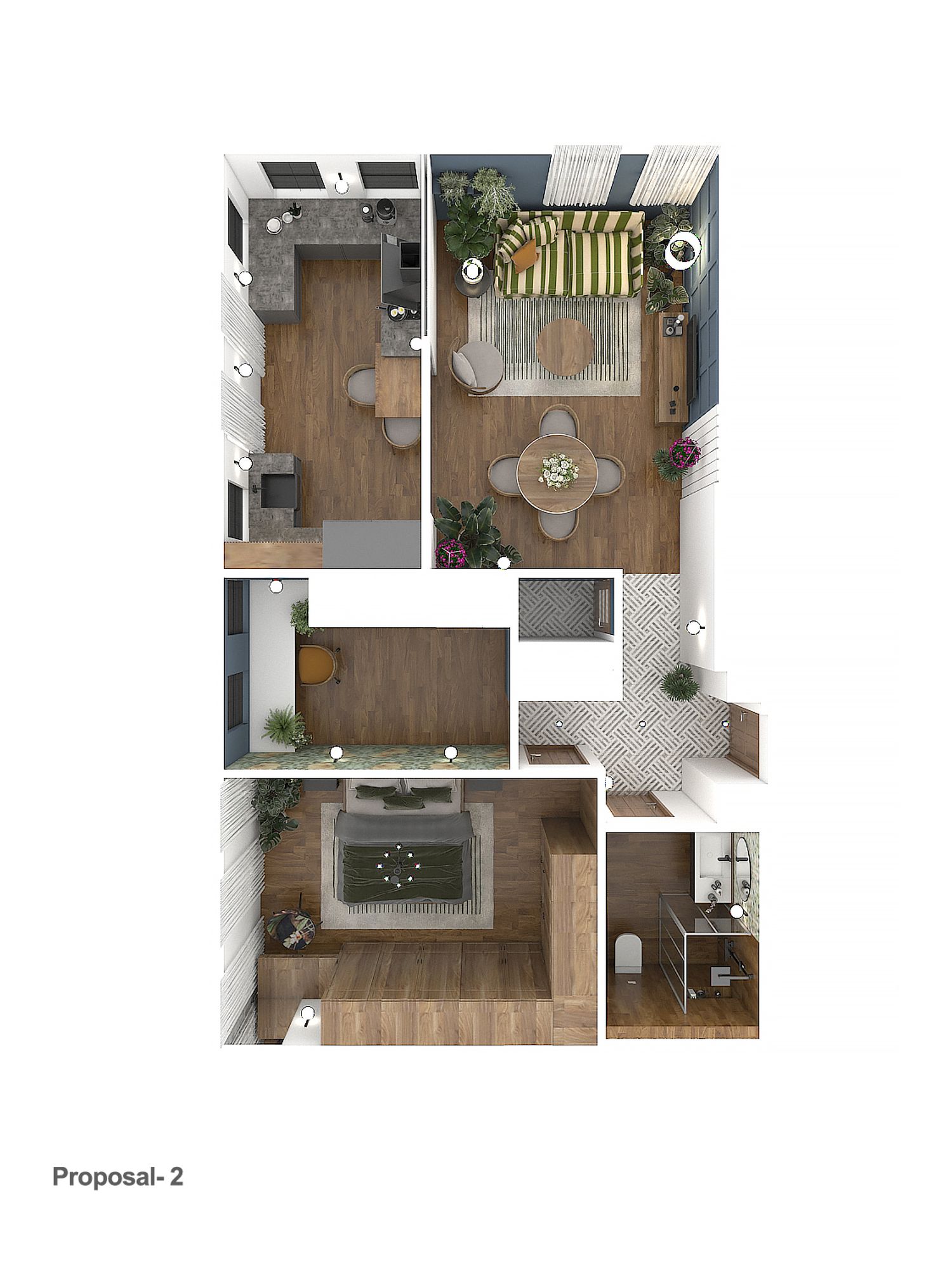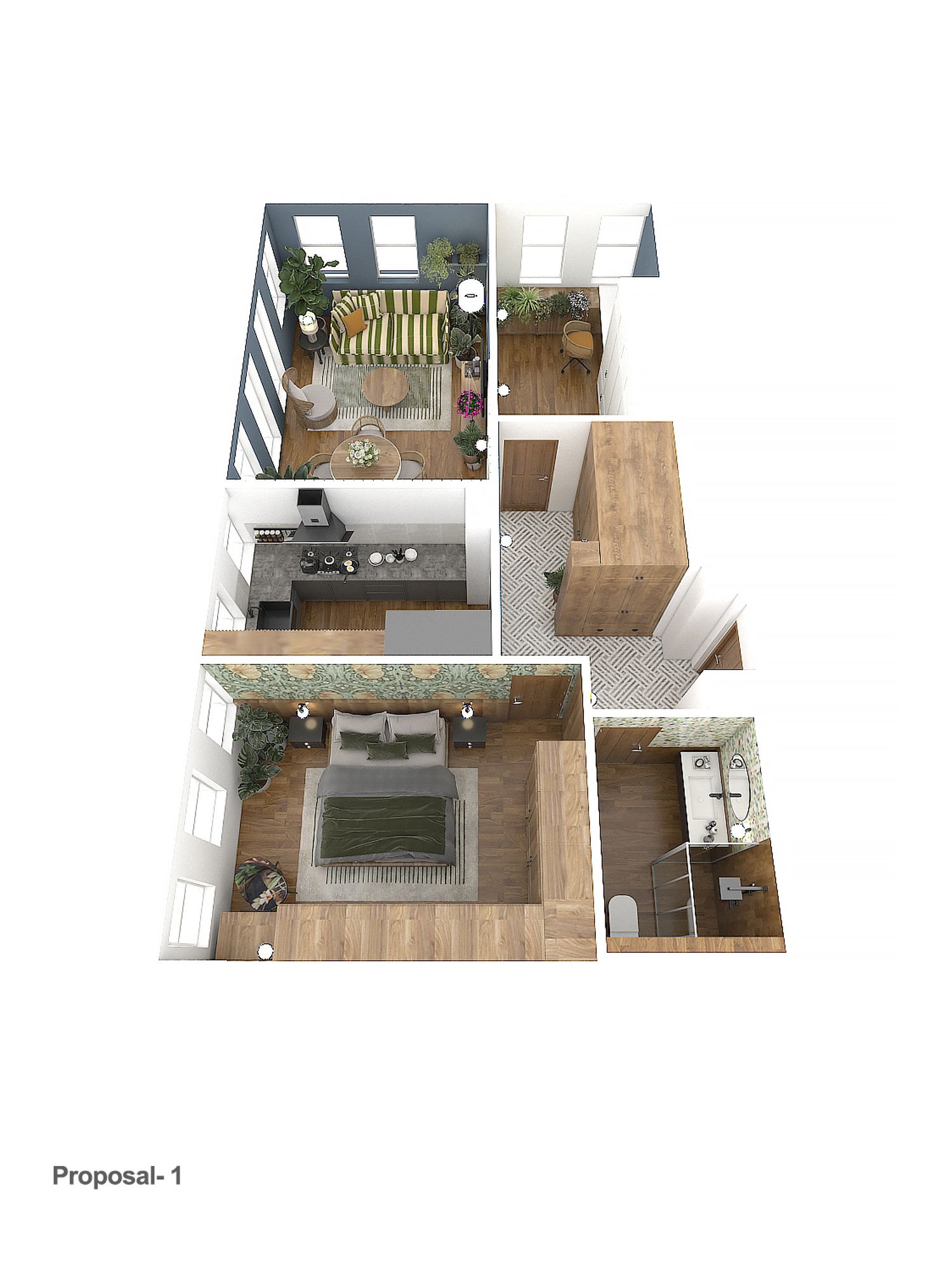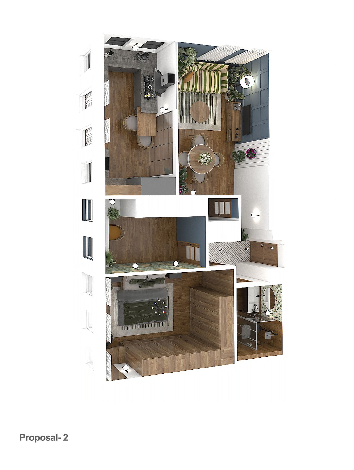 In the first and second proposals, an entrance wardrobe and a storage room (built with two wooden doors and without new walls) are foreseen in the hallway, which is a place to store extra items and extra chairs for the dining table.