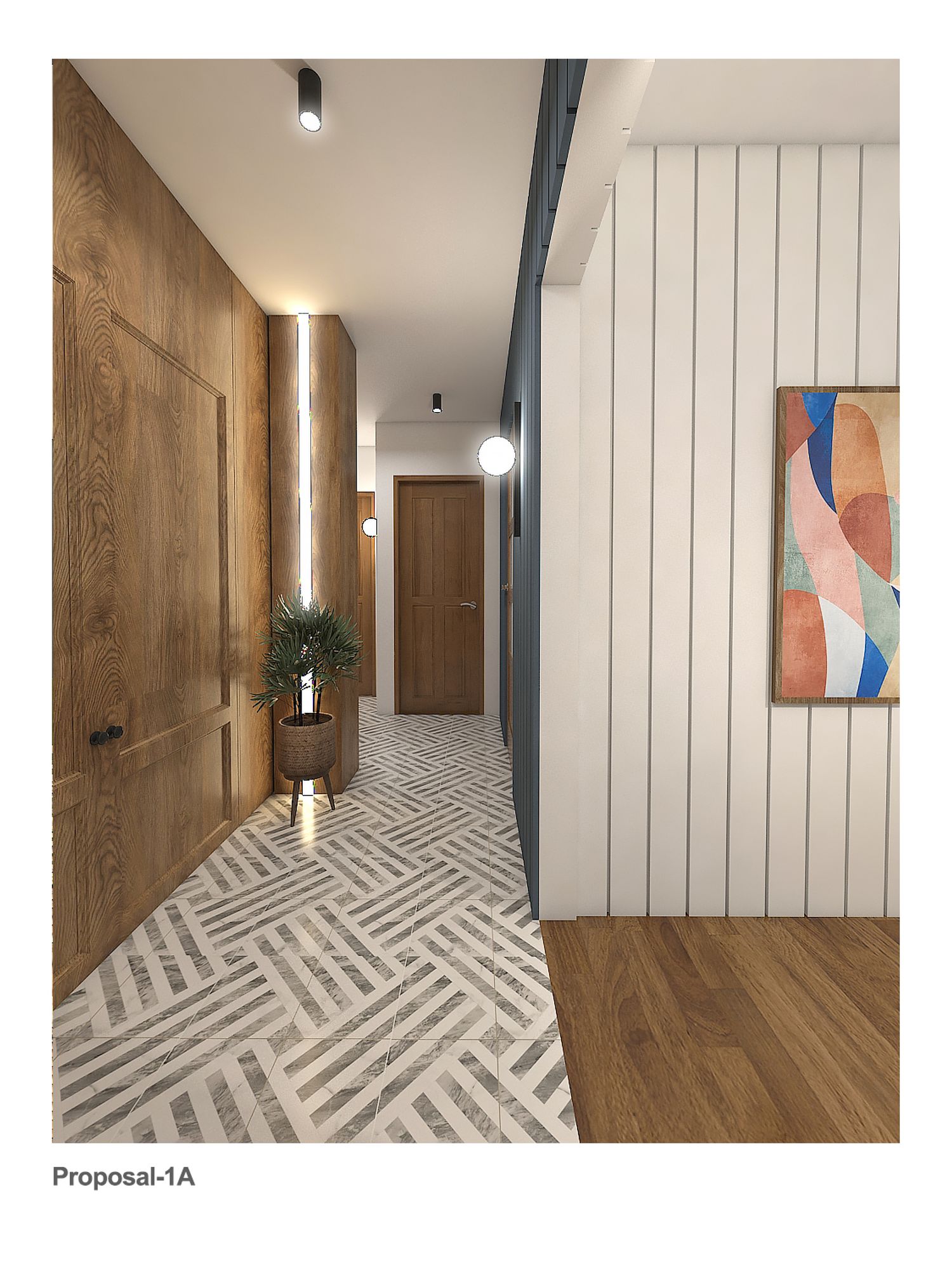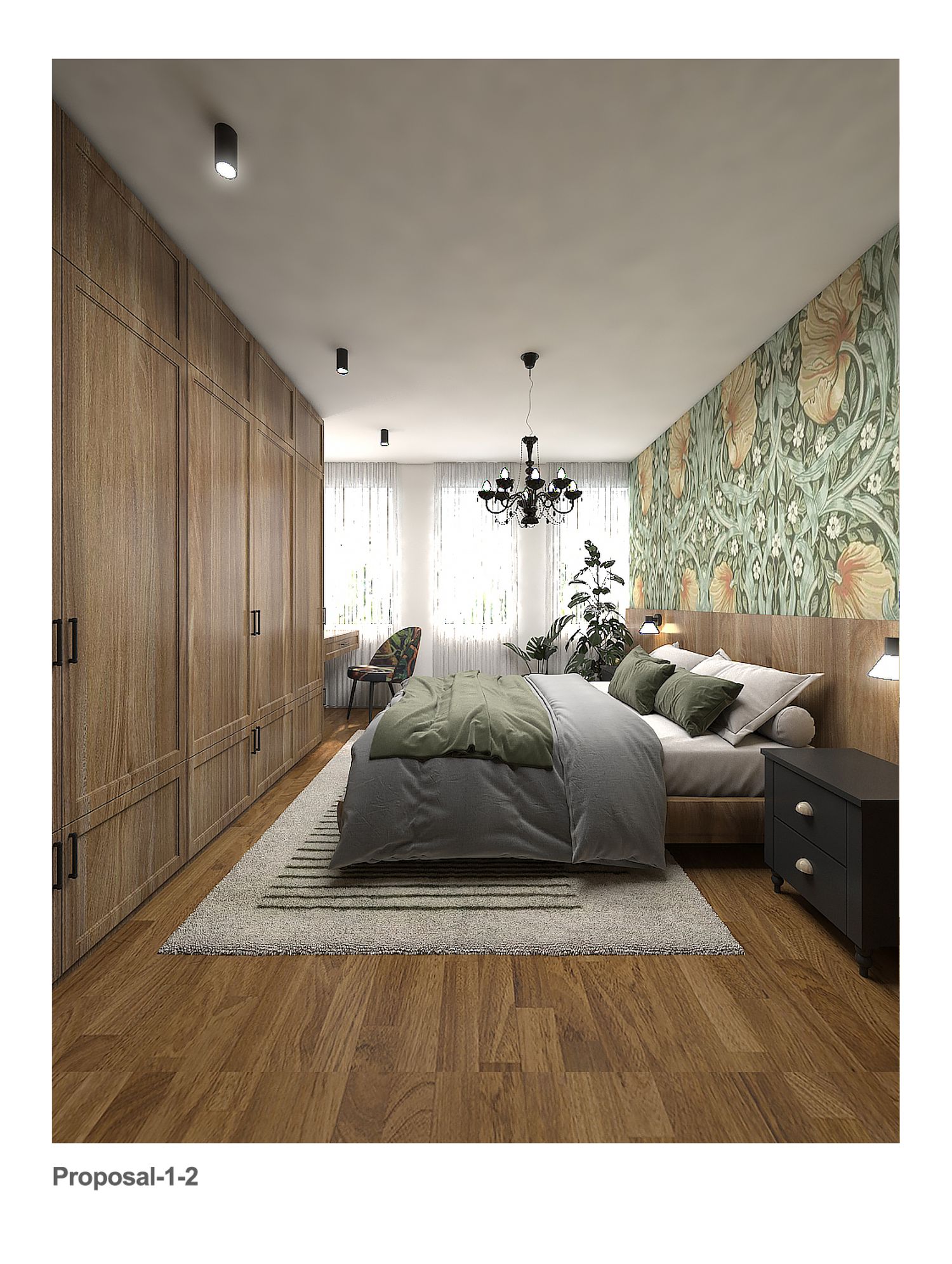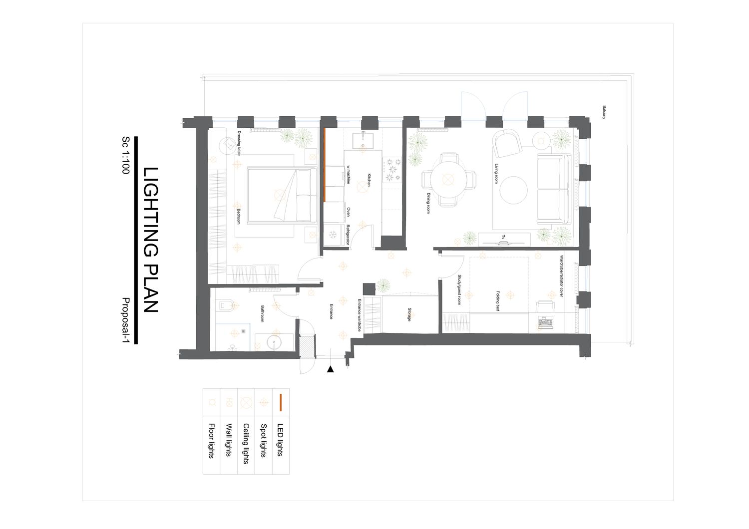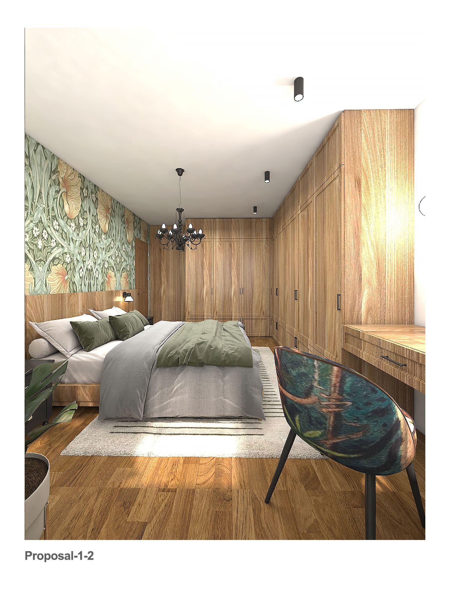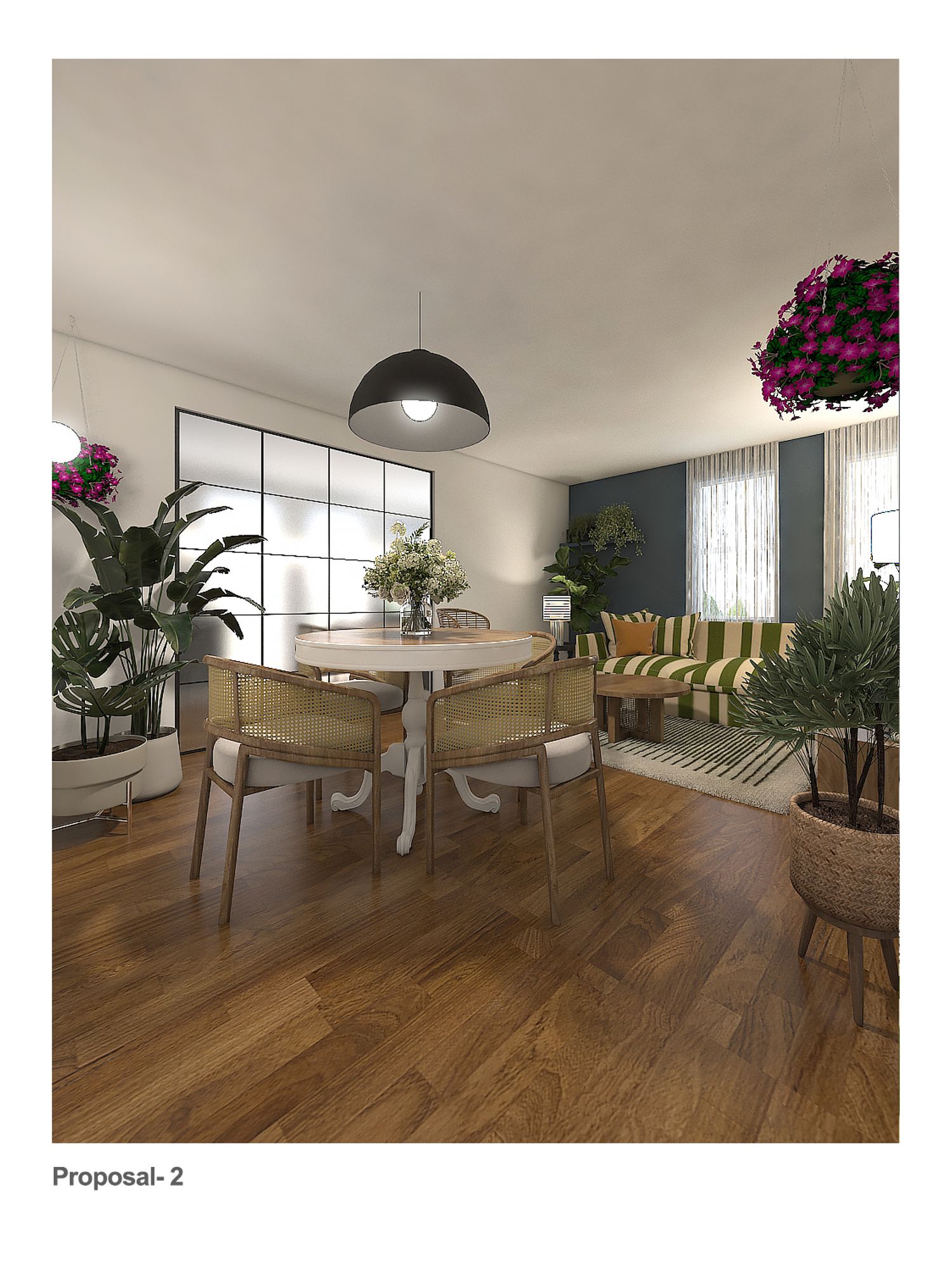 In the first and second proposals, an entrance wardrobe and a storage room (built with two wooden doors and without new walls) are foreseen in the hallway, which is a place to store extra items and extra chairs for the dining table.
