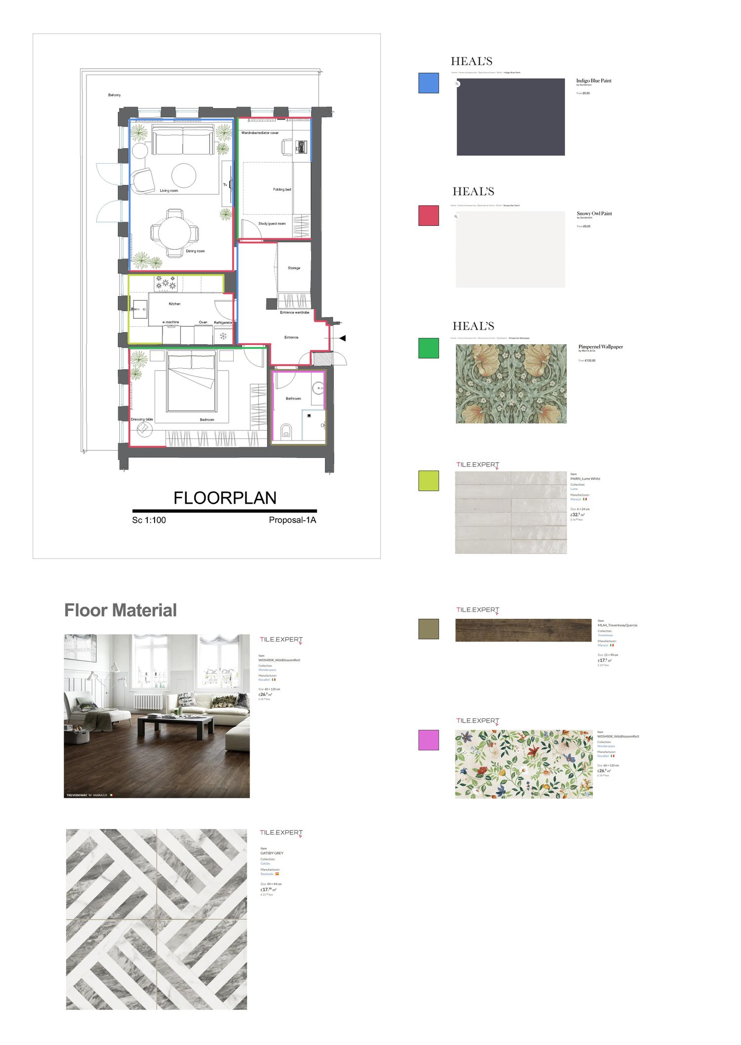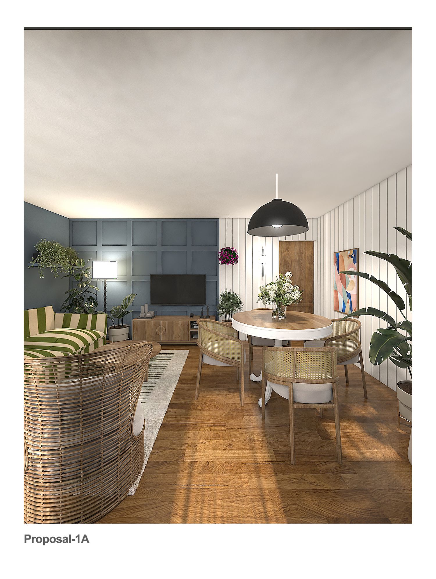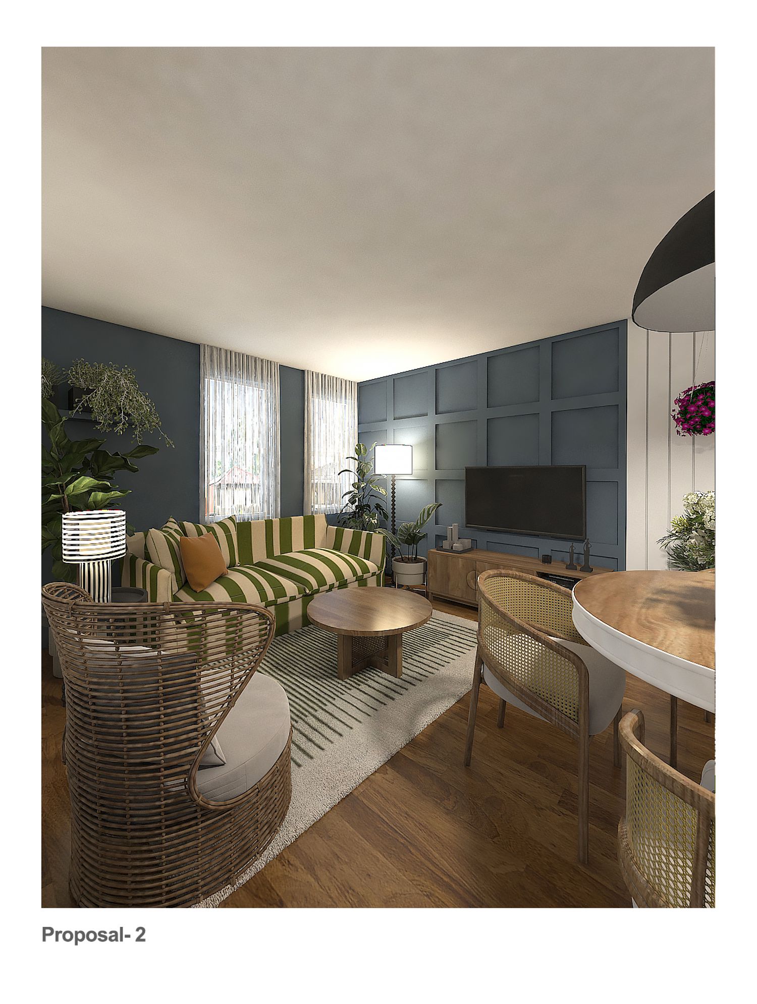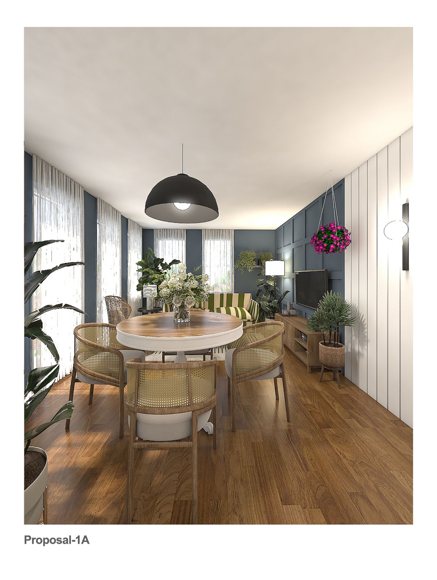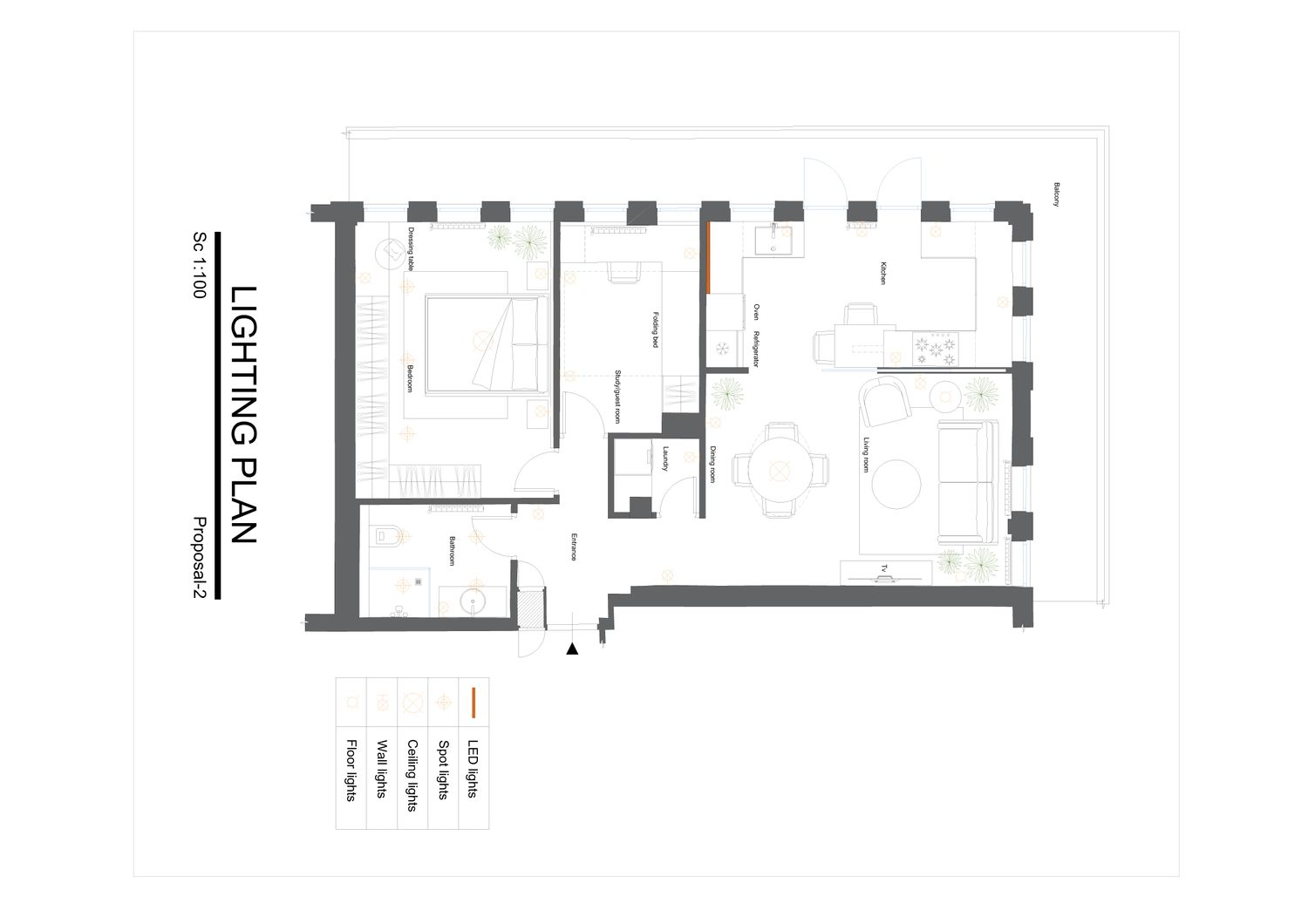 In the first and second proposals, an entrance wardrobe and a storage room (built with two wooden doors and without new walls) are foreseen in the hallway, which is a place to store extra items and extra chairs for the dining table.