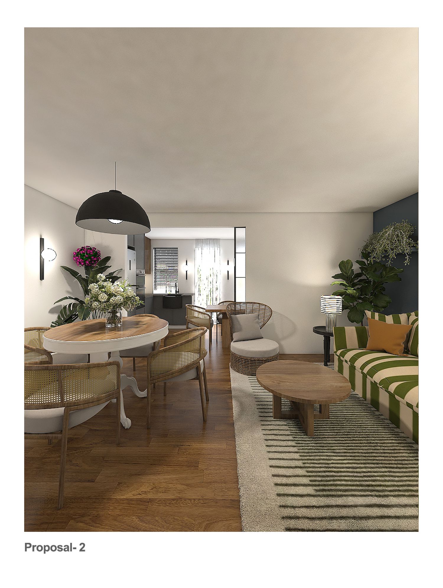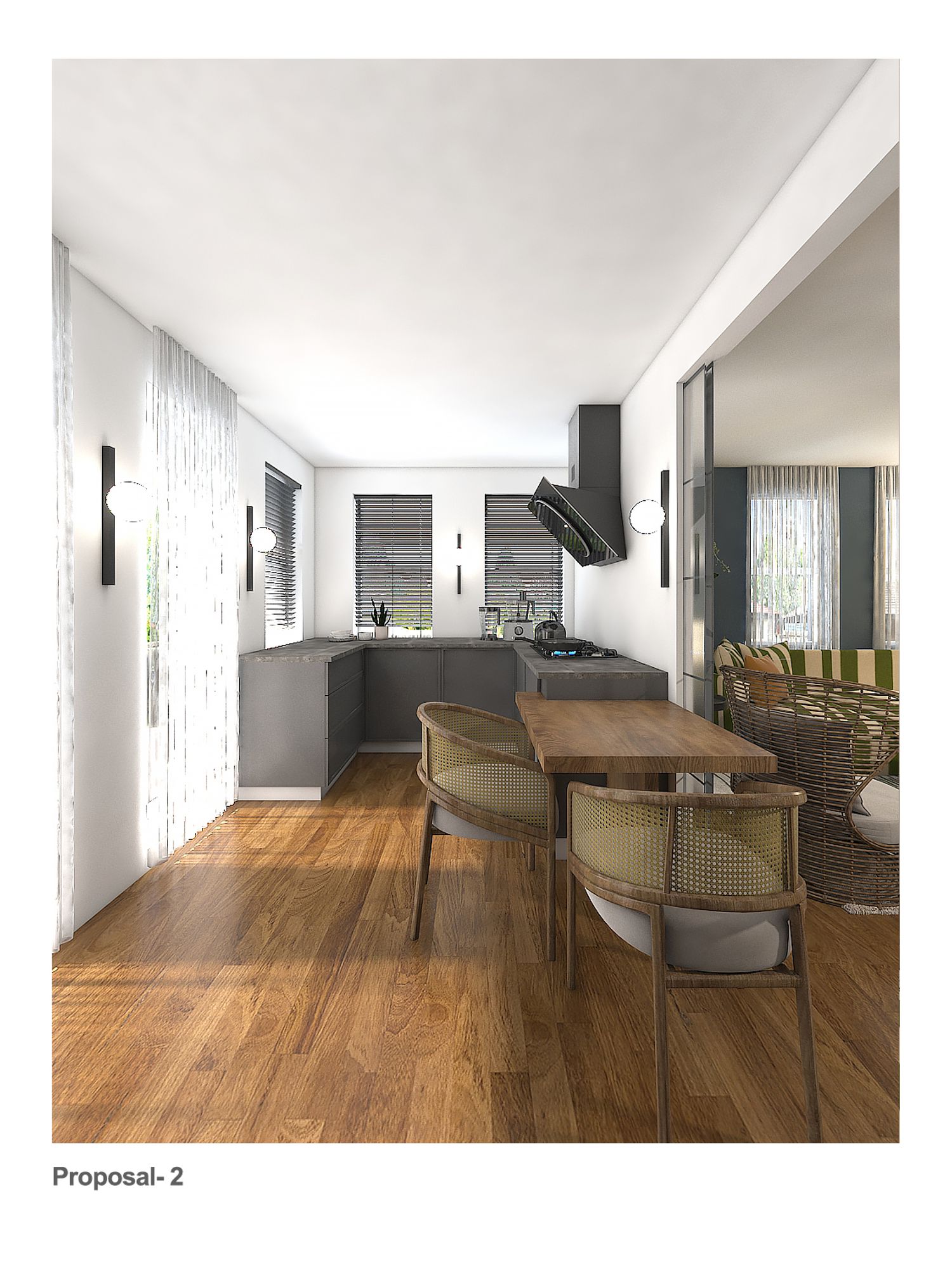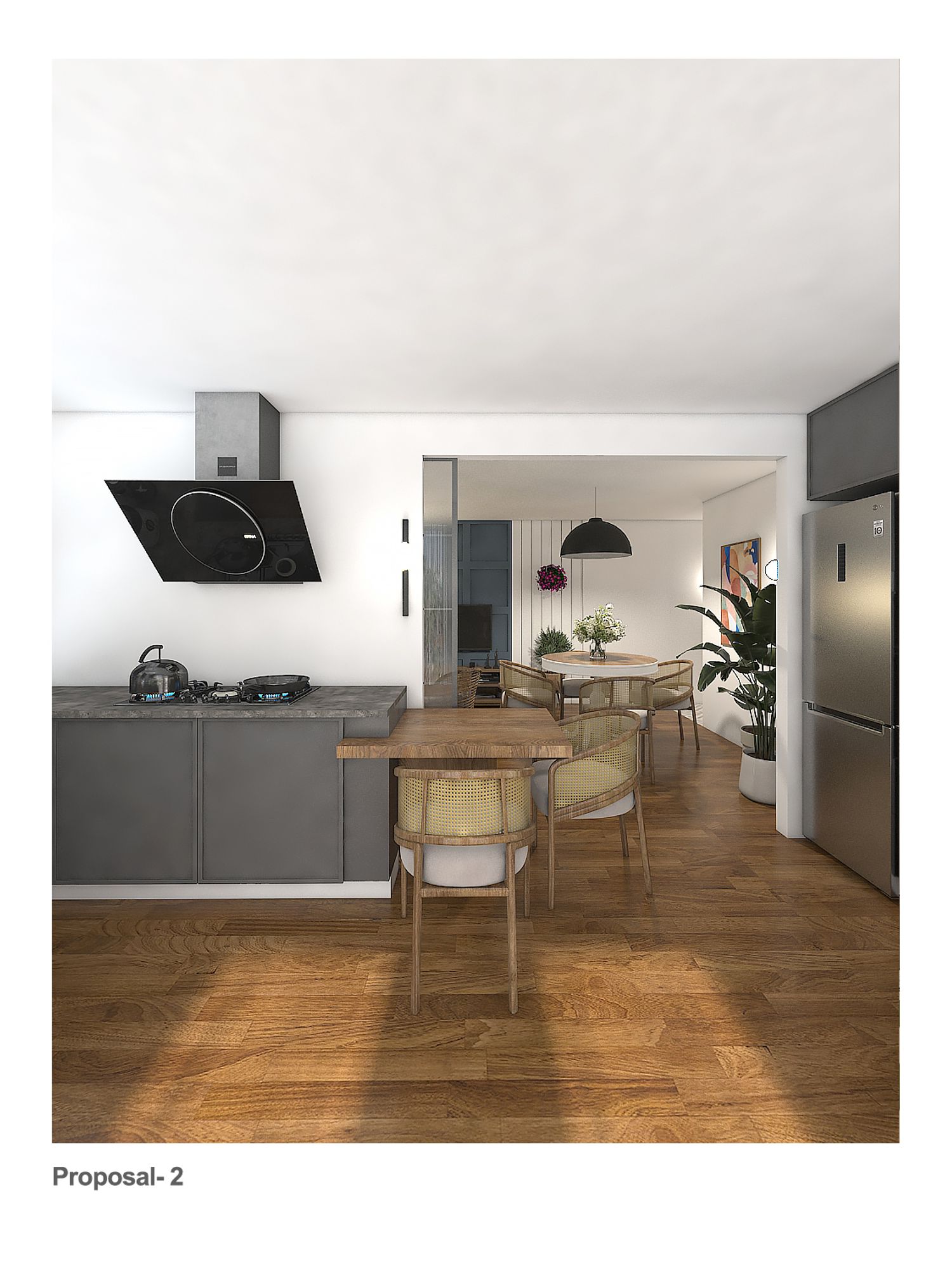 The third proposal aims to increase the dimensions of the kitchen and move it to a bright environment with access to the balcony and also reduce the windows of the dining/living room.