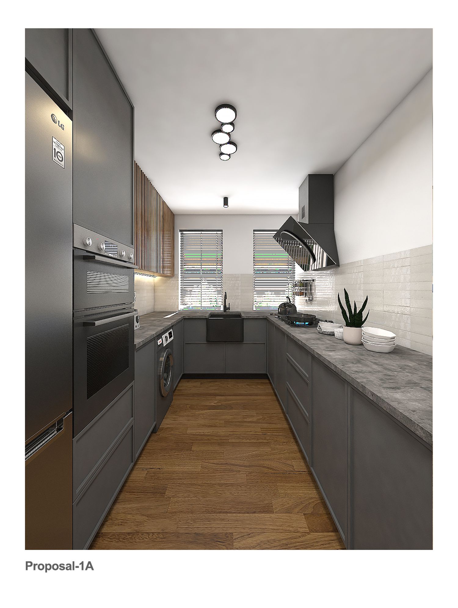 In the third proposal, a laundry room for the washing machine is planned, and the extra chairs of the dining table are also used as bar stools.