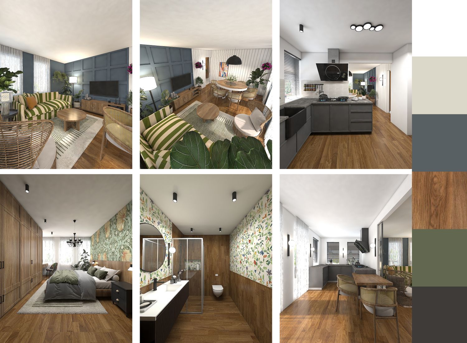 The design is inspired by the Art Deco style and uses natural materials and colors, wallpaper and tiles with nature designs.