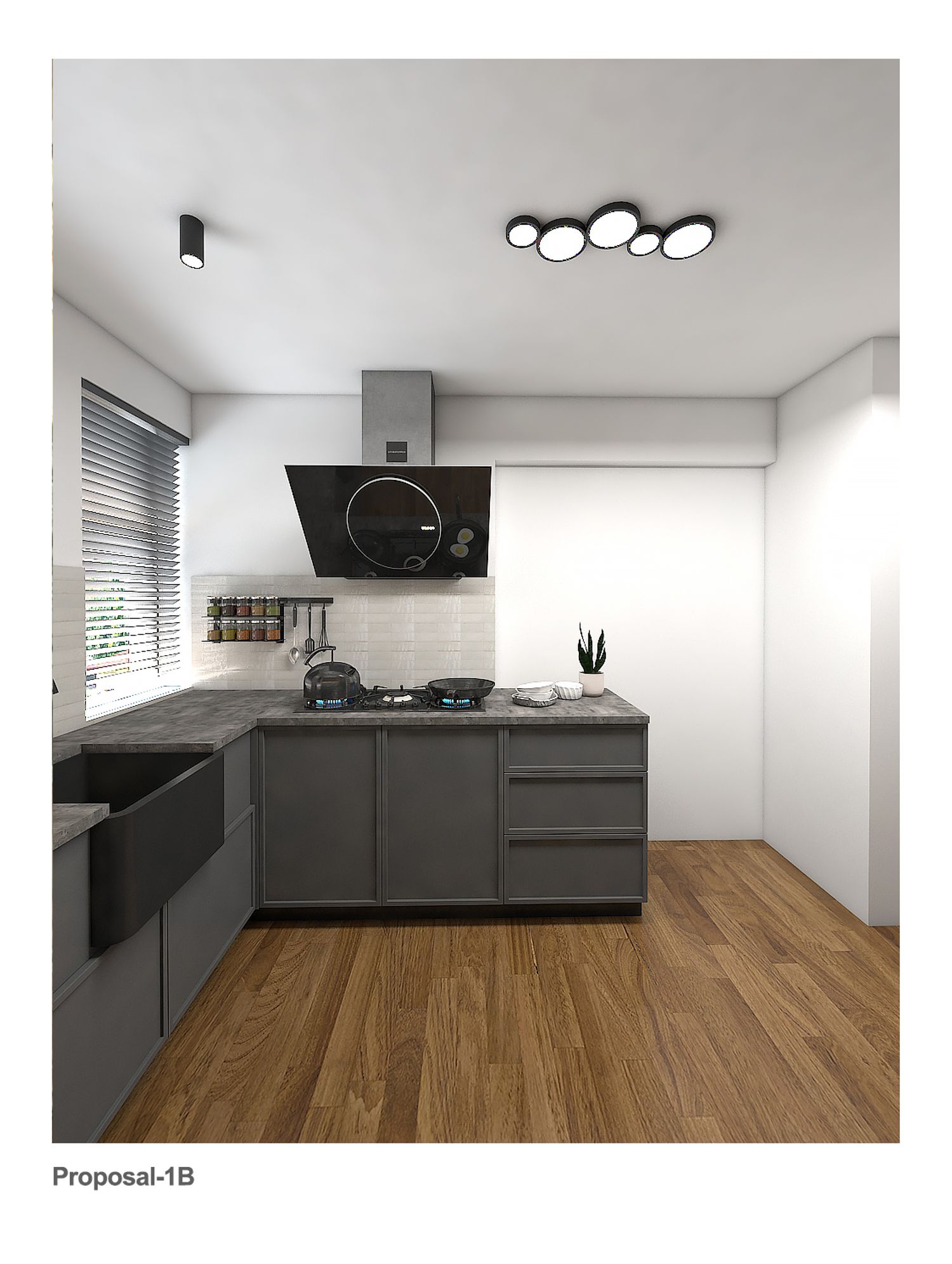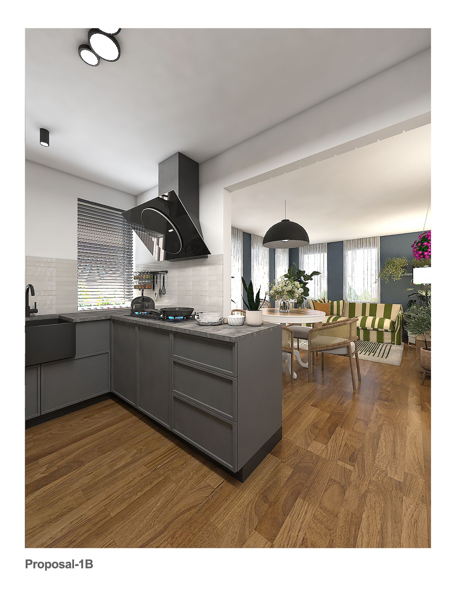 In this proposal, the kitchen, while being independent from the dining/living room, can be transformed into an open kitchen integrated with the dining and living room by opening the sliding door when necessary.