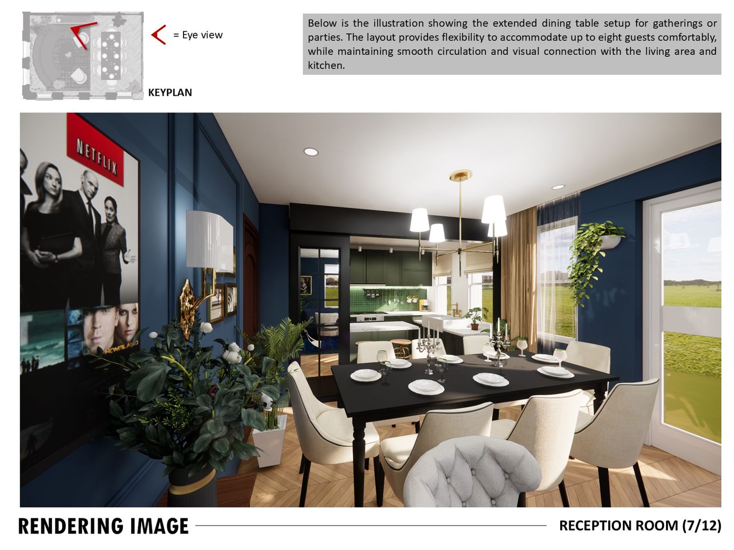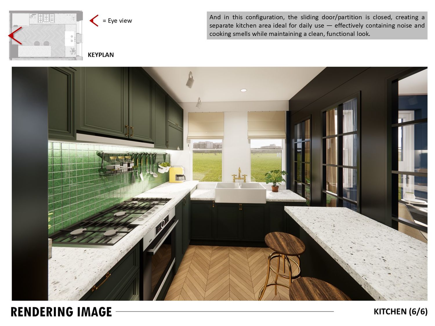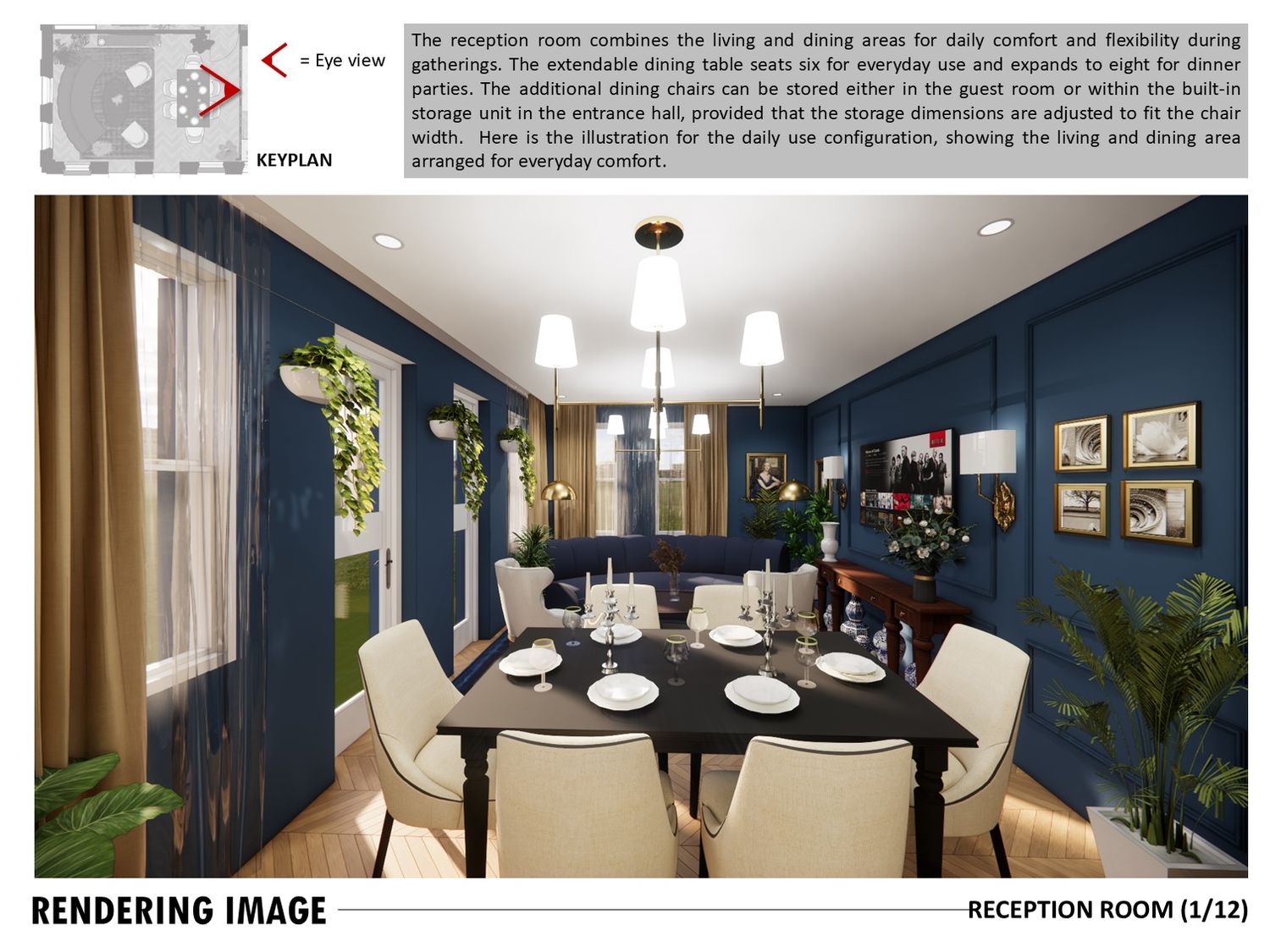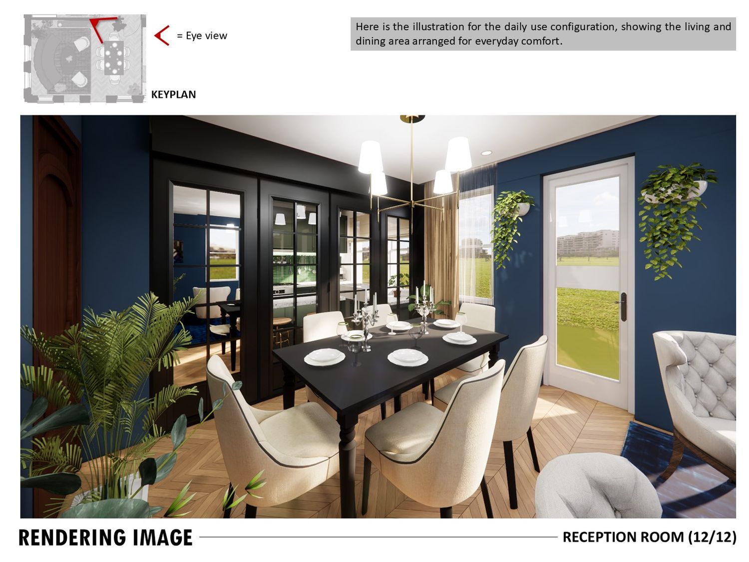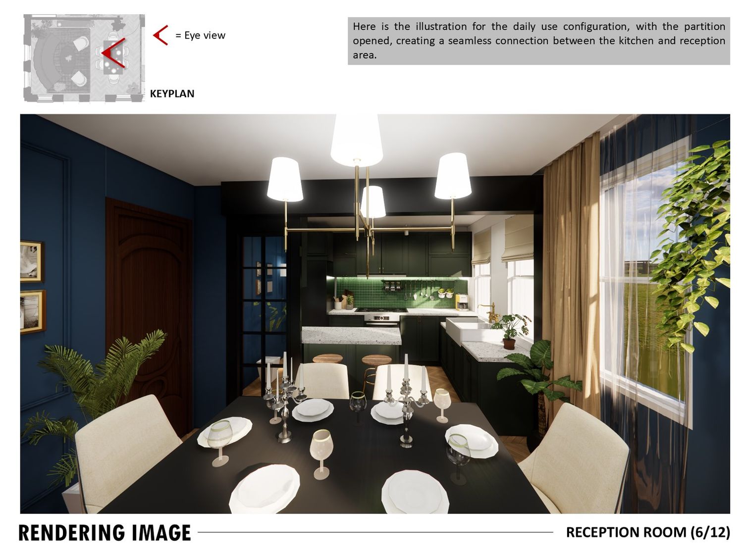 The layout connects spaces through sliding partitions and multi use furniture, allowing easy transition between daily use and entertaining.