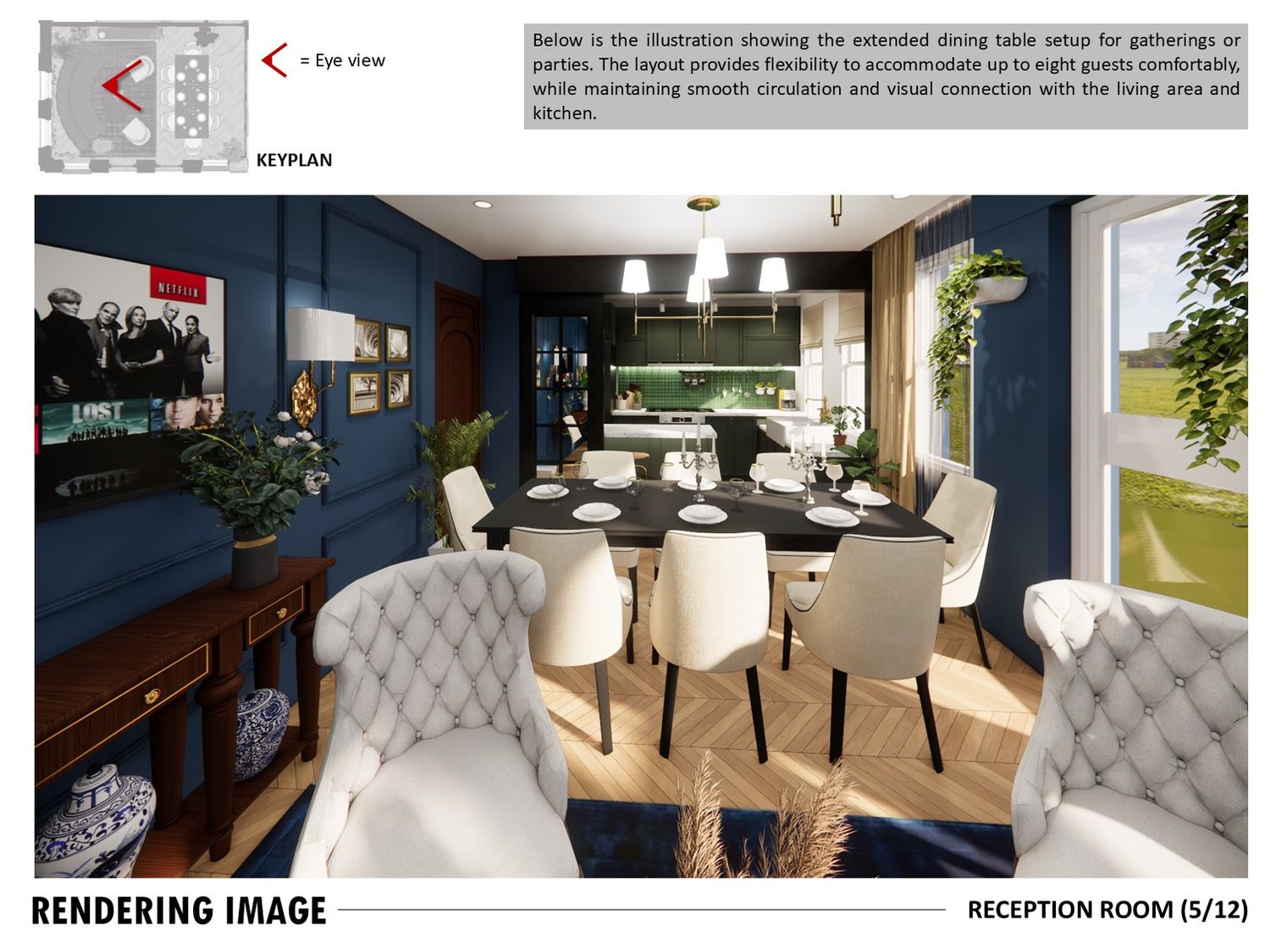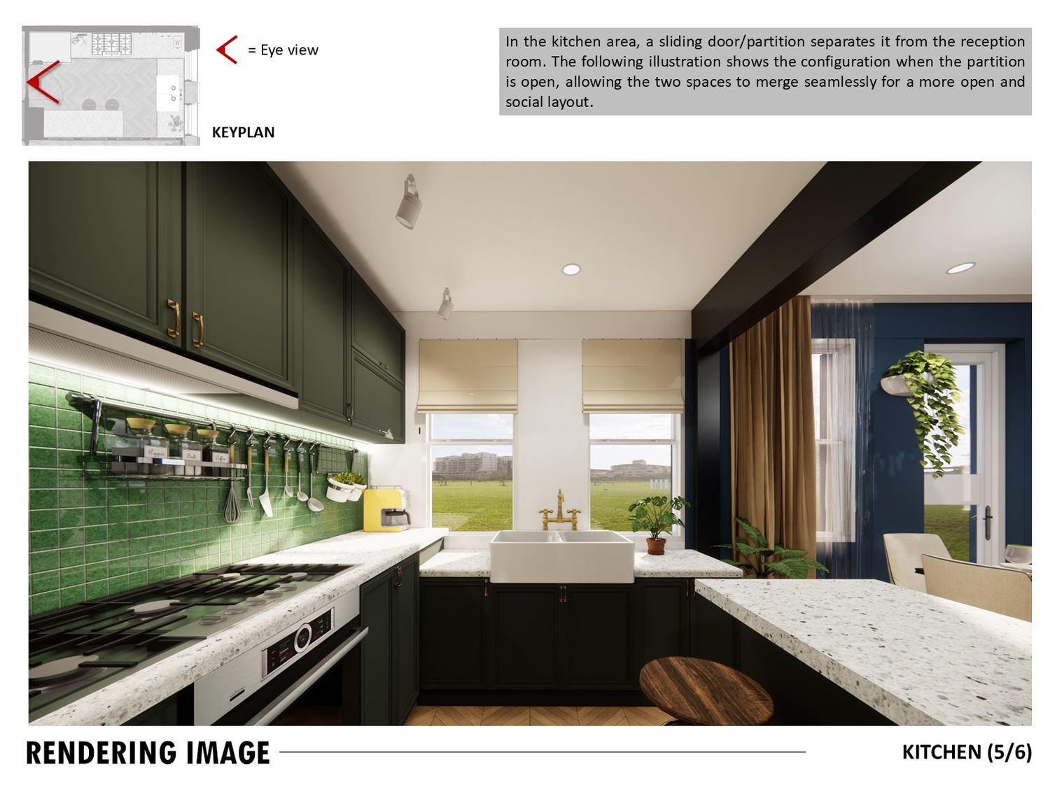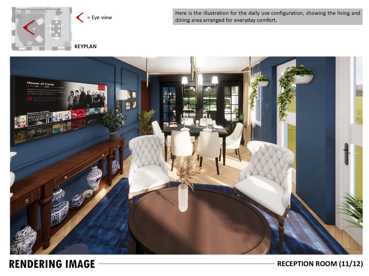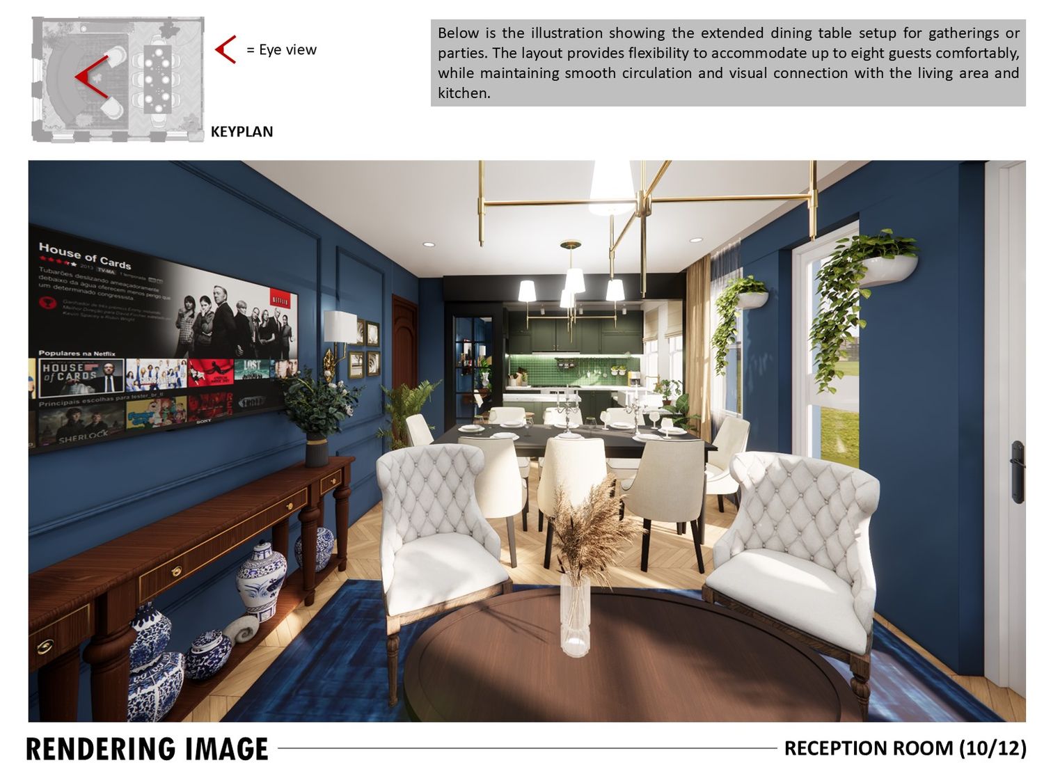The layout connects spaces through sliding partitions and multi use furniture, allowing easy transition between daily use and entertaining.