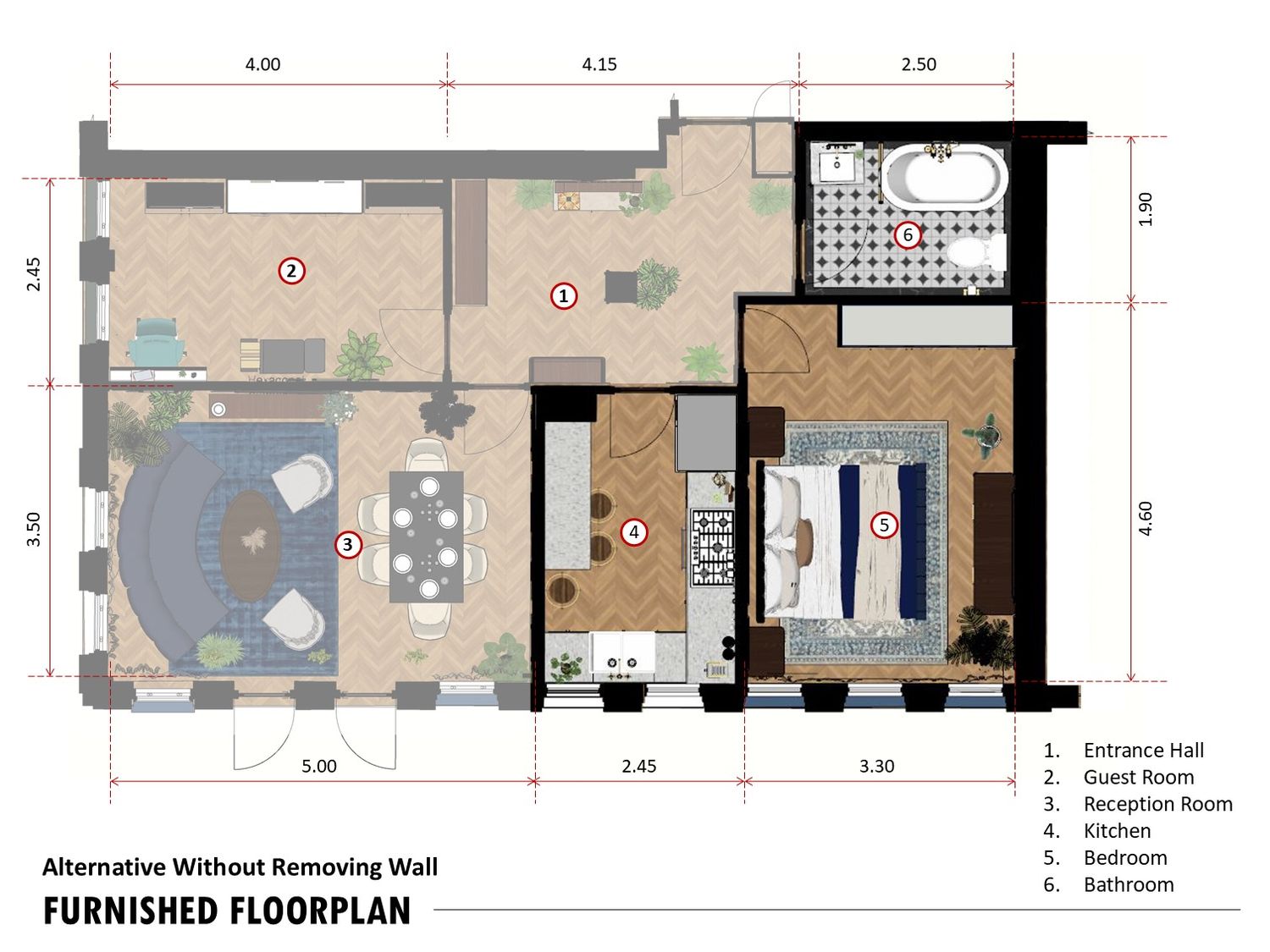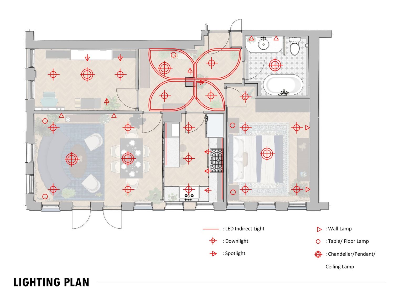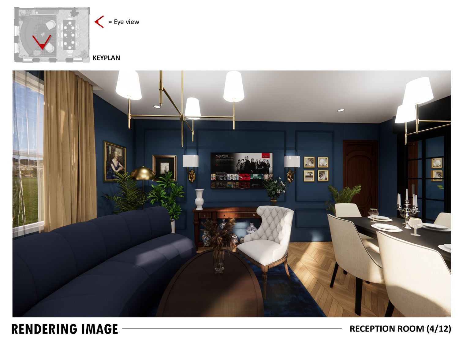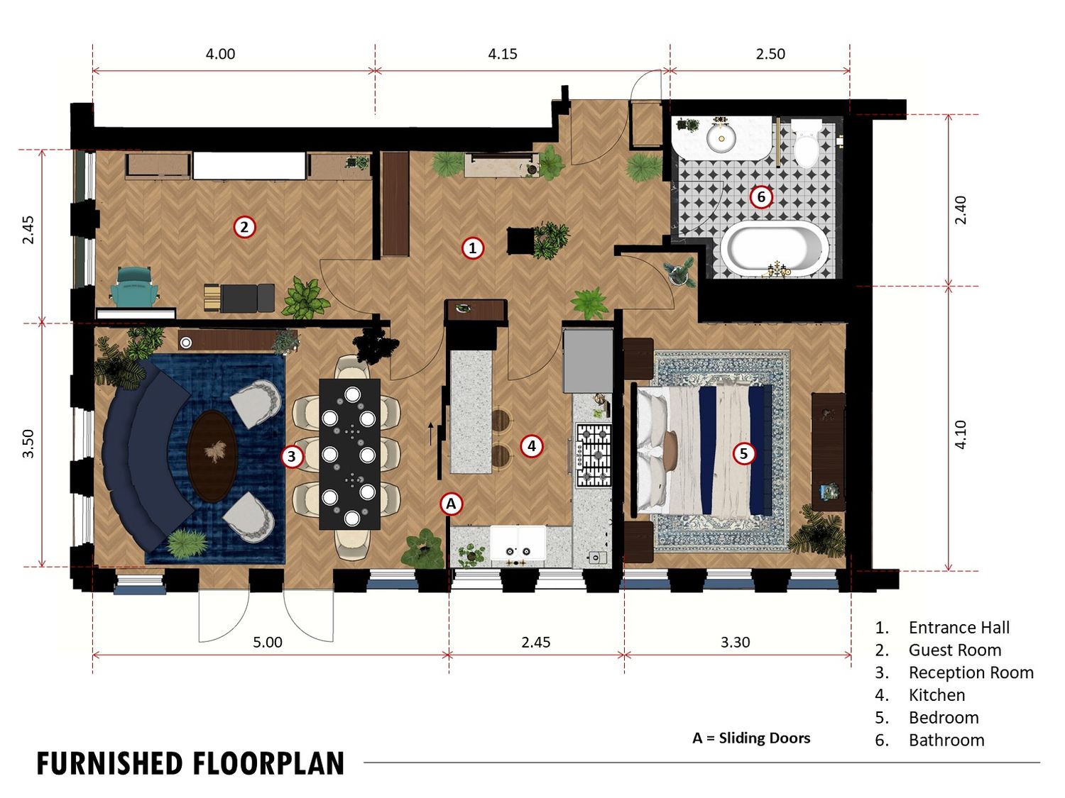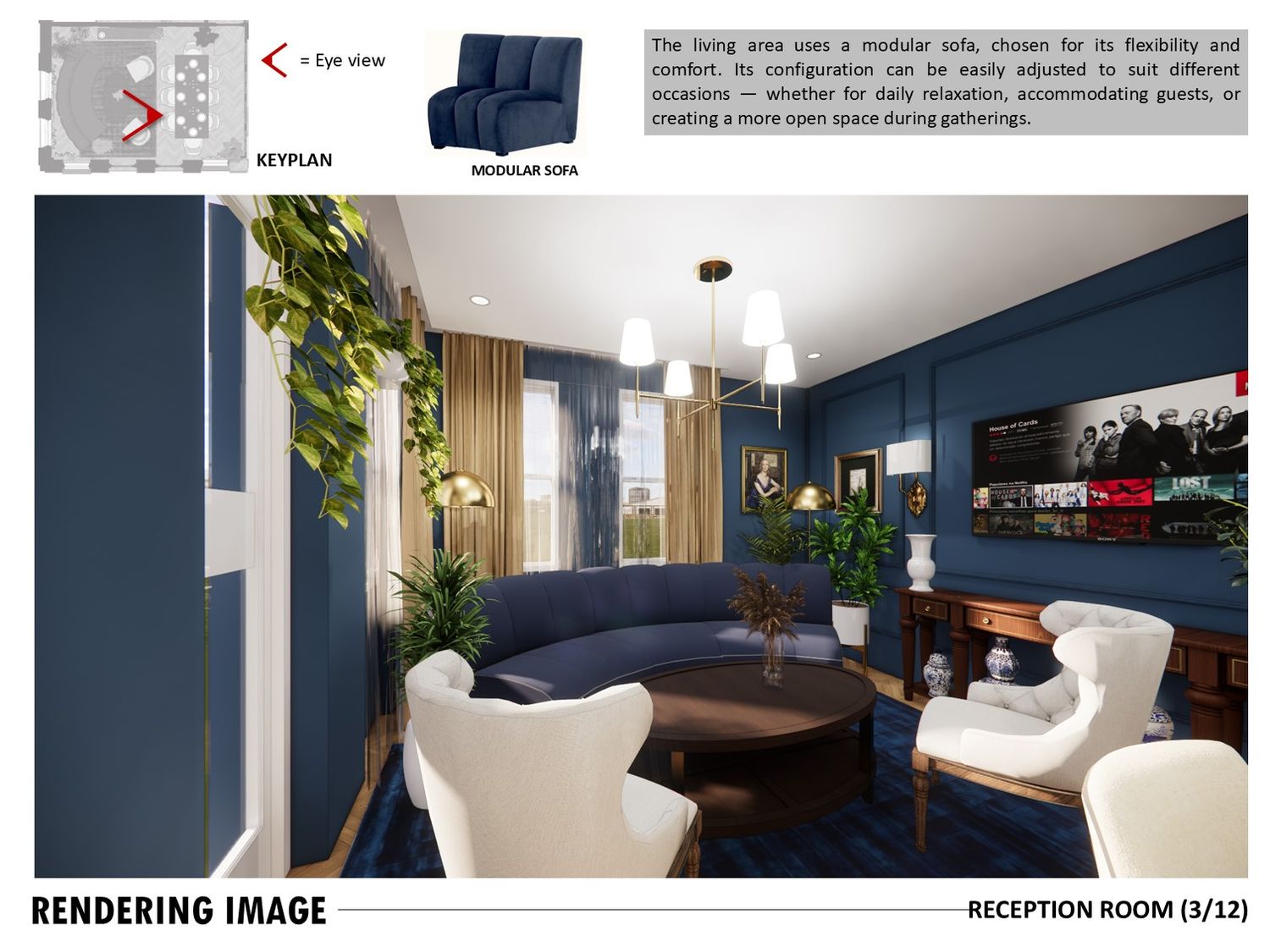 The layout connects spaces through sliding partitions and multi use furniture, allowing easy transition between daily use and entertaining.