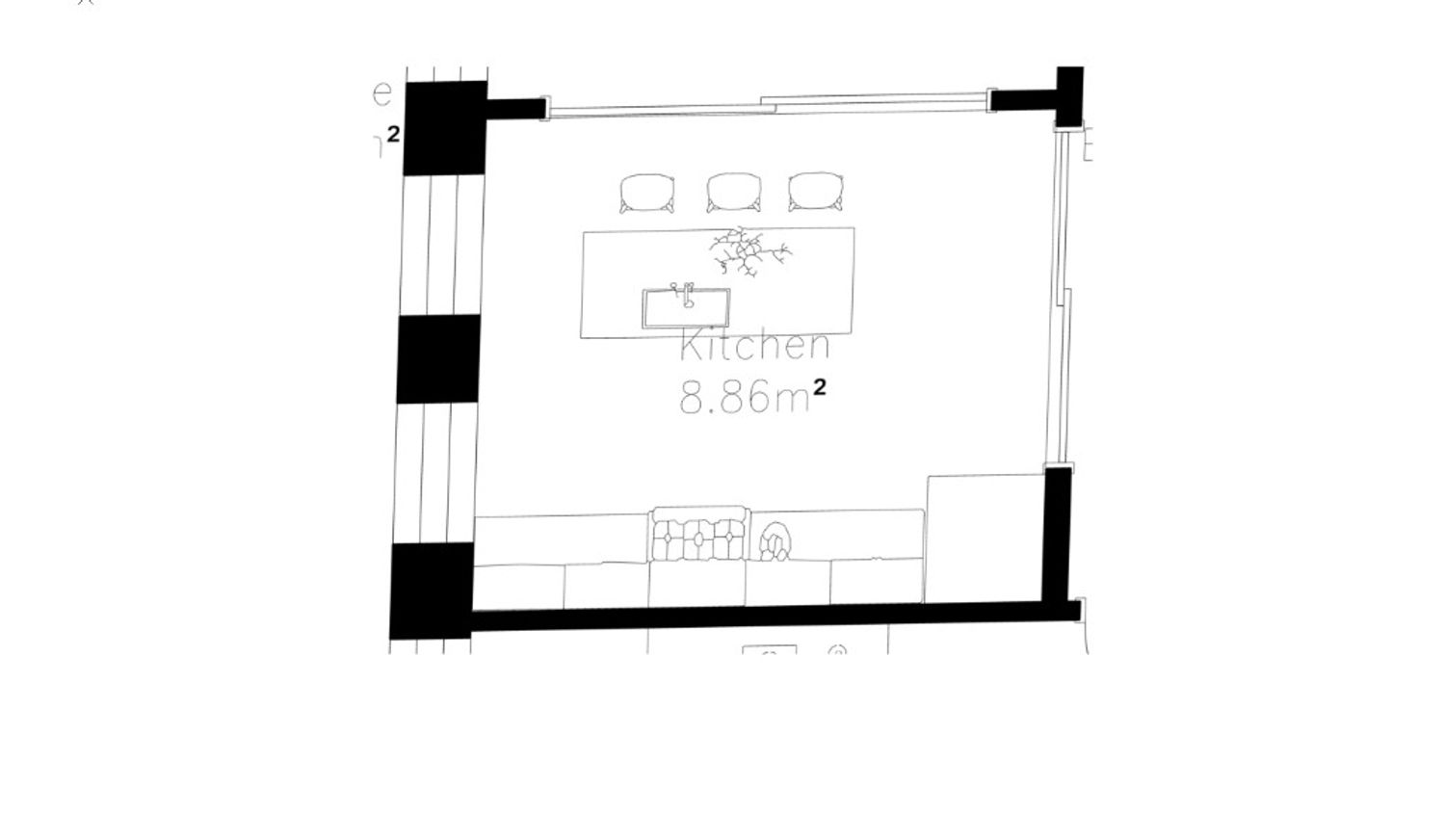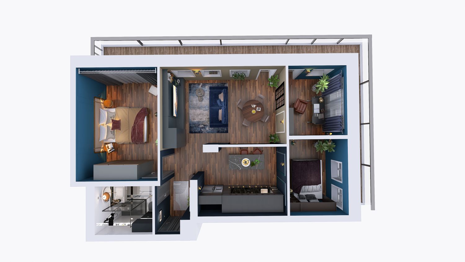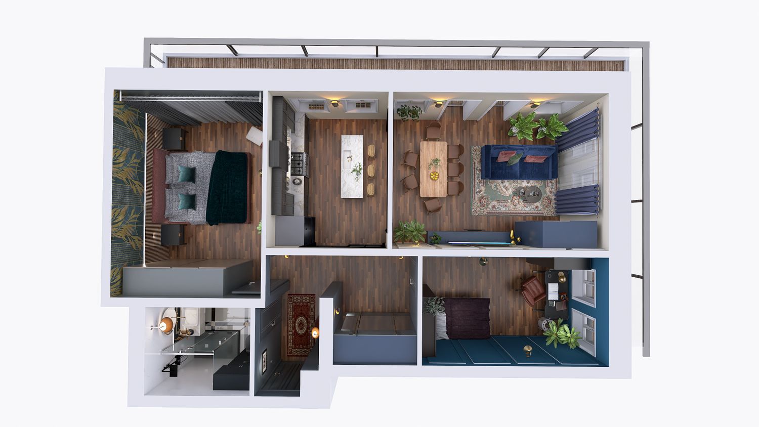 The second proposal reconfigures the layout to optimize circulation and flexibility. The kitchen is relocated near the entrance, opening space for a larger living area where the former kitchen was located. Sliding or folding glass doors connect the kitchen, living, and study, allowing smooth transitions between open-plan living and private guest setups. The study features a fold-away wall bed, transforming it into a comfortable guest room when needed.