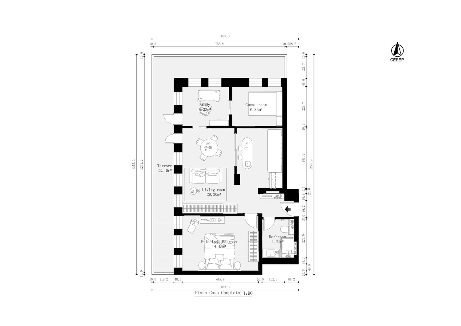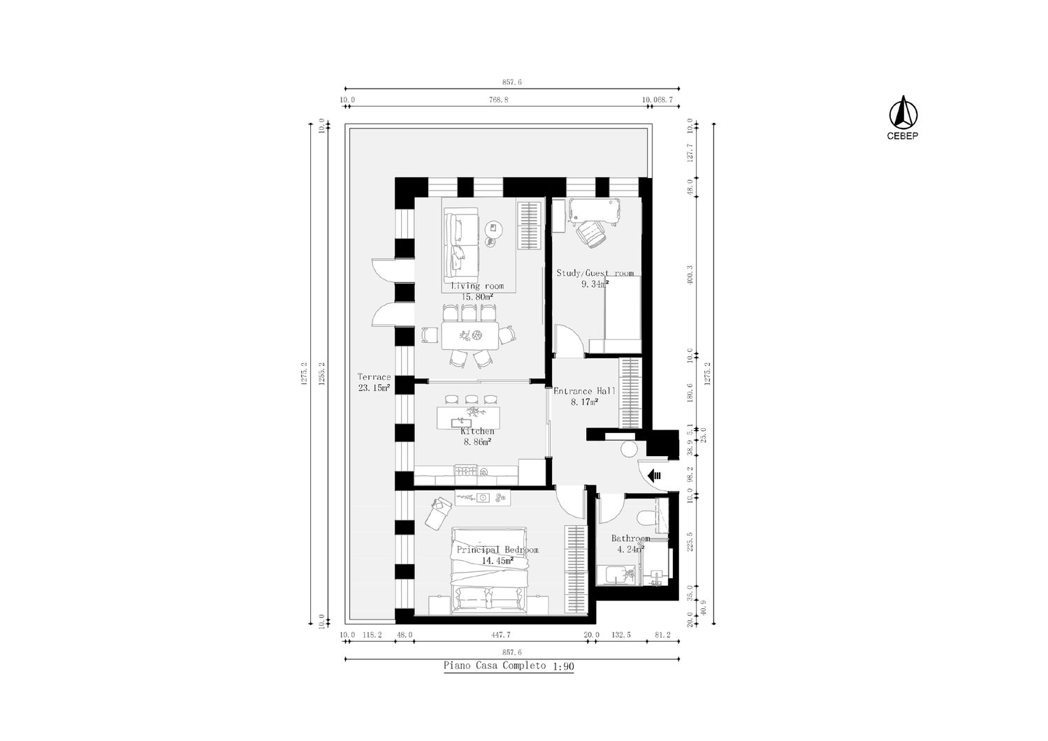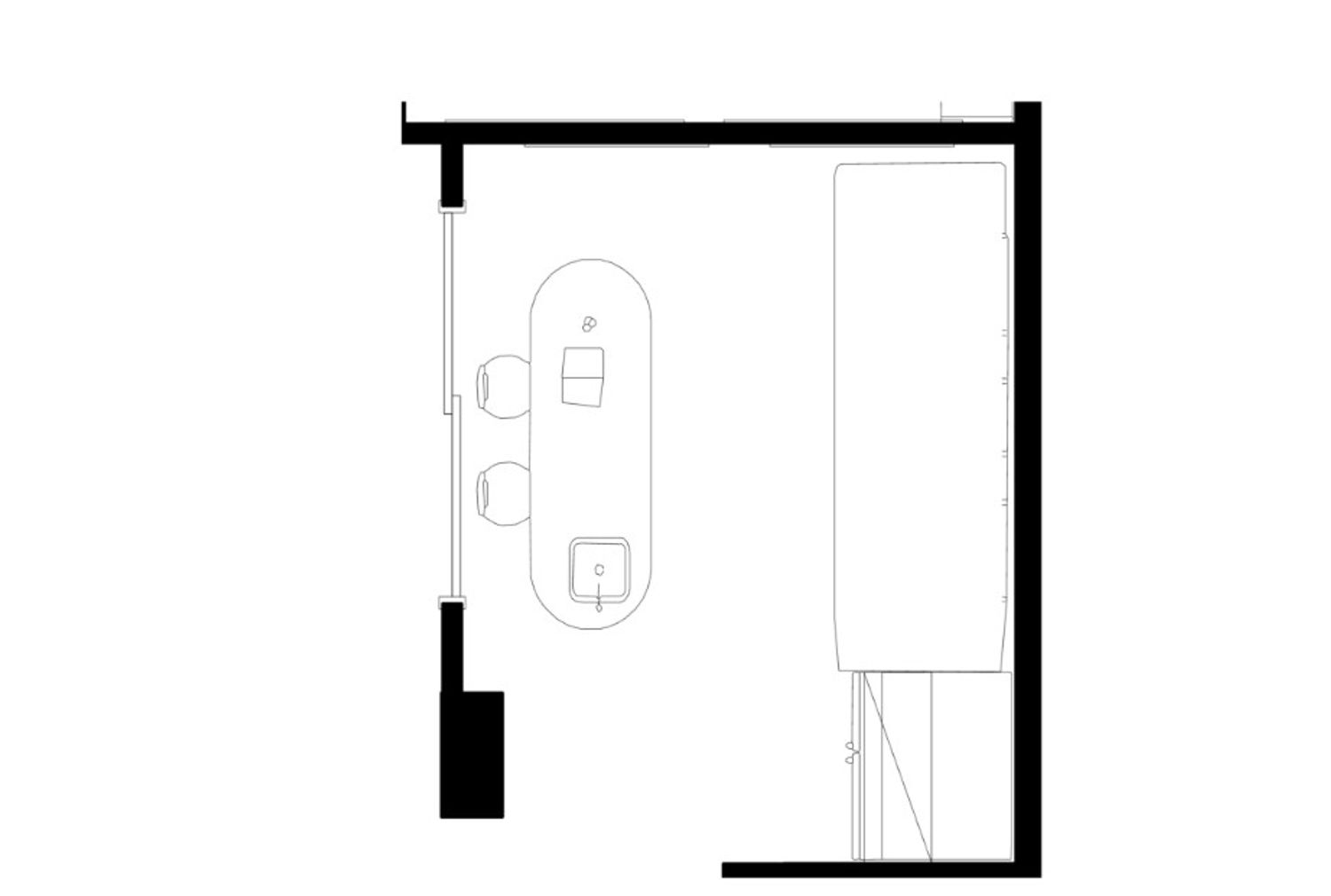 The second proposal reconfigures the layout to optimize circulation and flexibility. The kitchen is relocated near the entrance, opening space for a larger living area where the former kitchen was located. Sliding or folding glass doors connect the kitchen, living, and study, allowing smooth transitions between open-plan living and private guest setups. The study features a fold-away wall bed, transforming it into a comfortable guest room when needed.