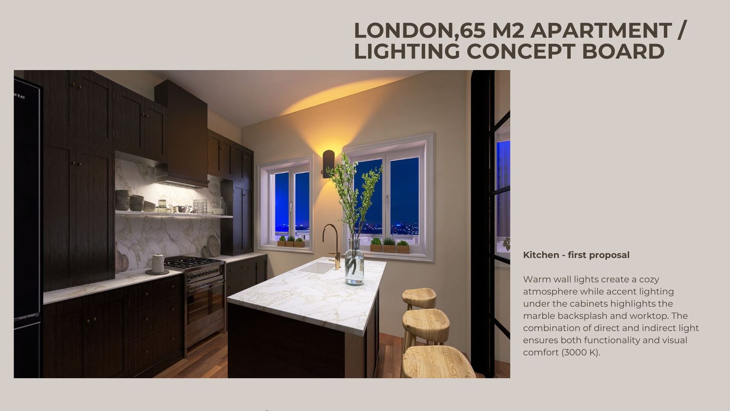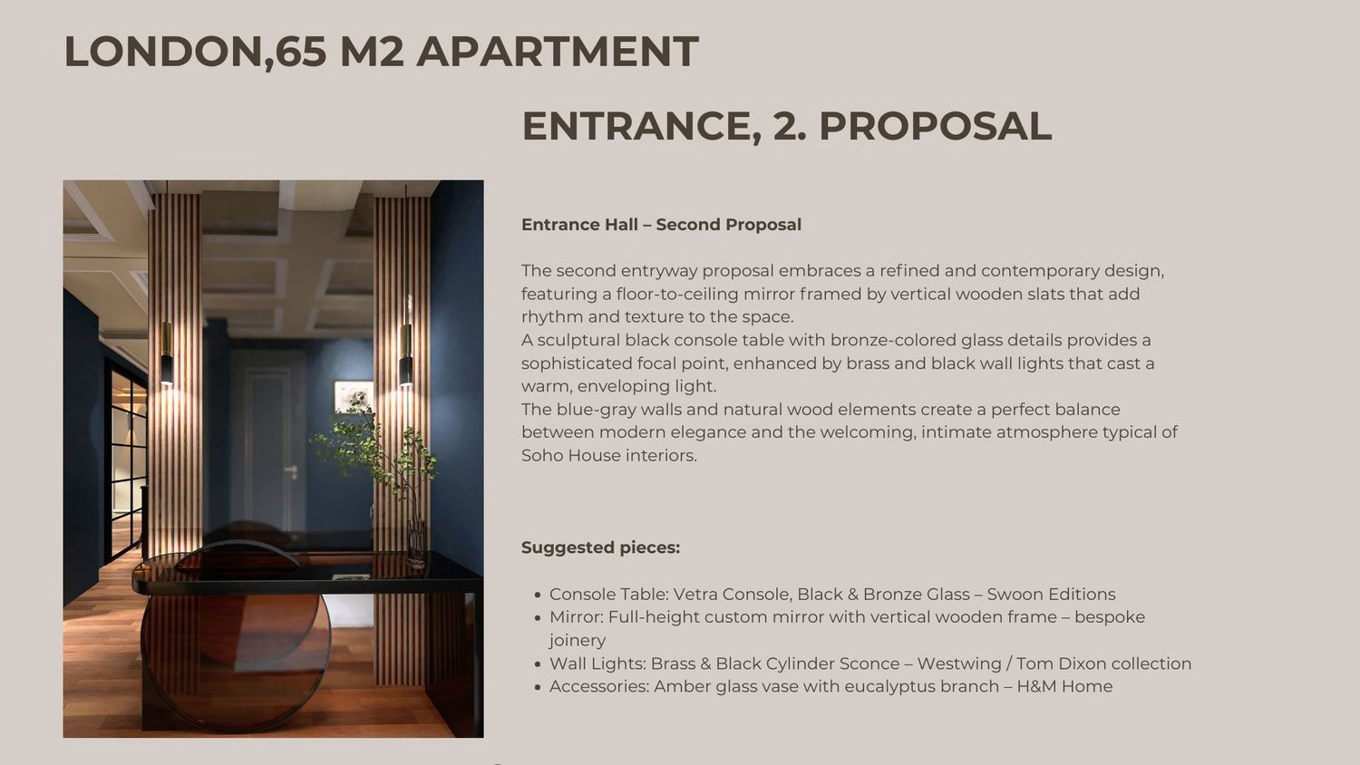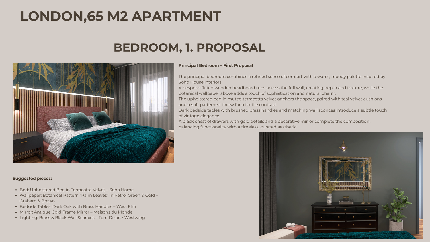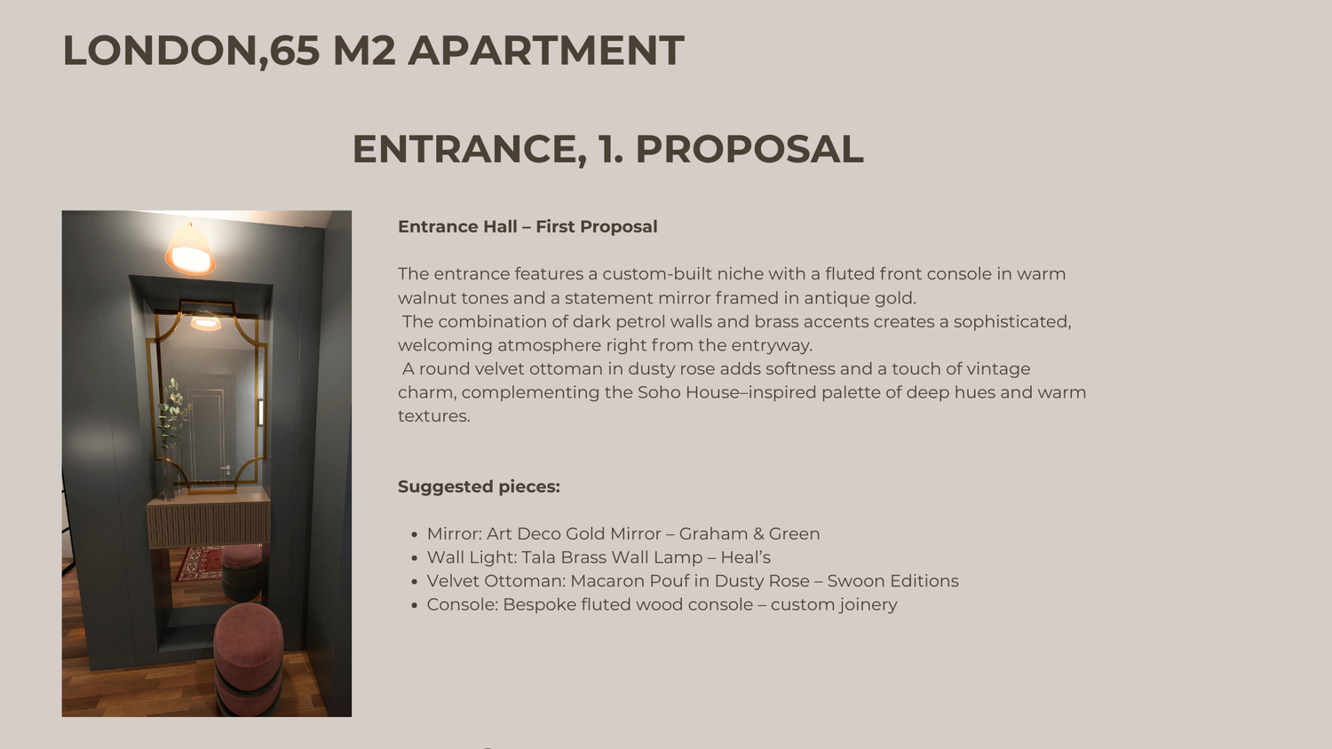 This project presents two alternative layouts developed to meet the client’s request for both functionality and spatial flexibility. Each design combines elegance and practicality within a Soho House–inspired atmosphere defined by warm tones, brass details, and layered lighting.