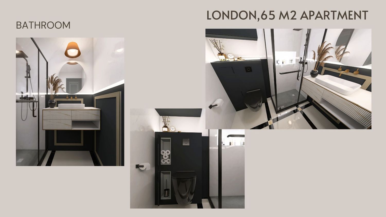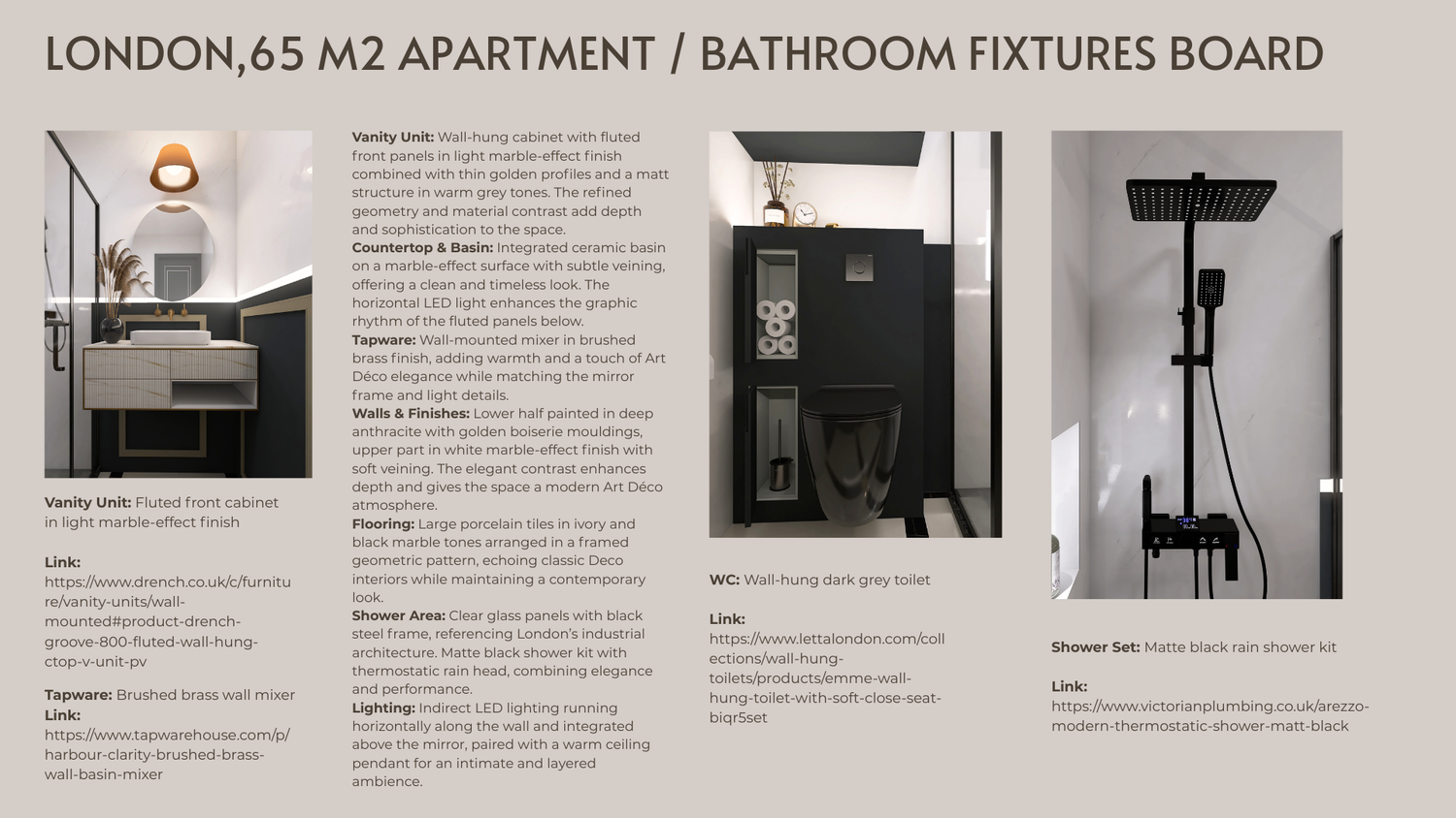 The bathroom has been enlarged toward the entrance to include a dedicated storage zone. Custom shelving and concealed niches behind the toilet provide additional space for towels and personal items, keeping the design clean and elegant. Finishes follow an Art Deco aesthetic with marble surfaces, brass fixtures, and fluted details, creating a refined yet functional atmosphere.