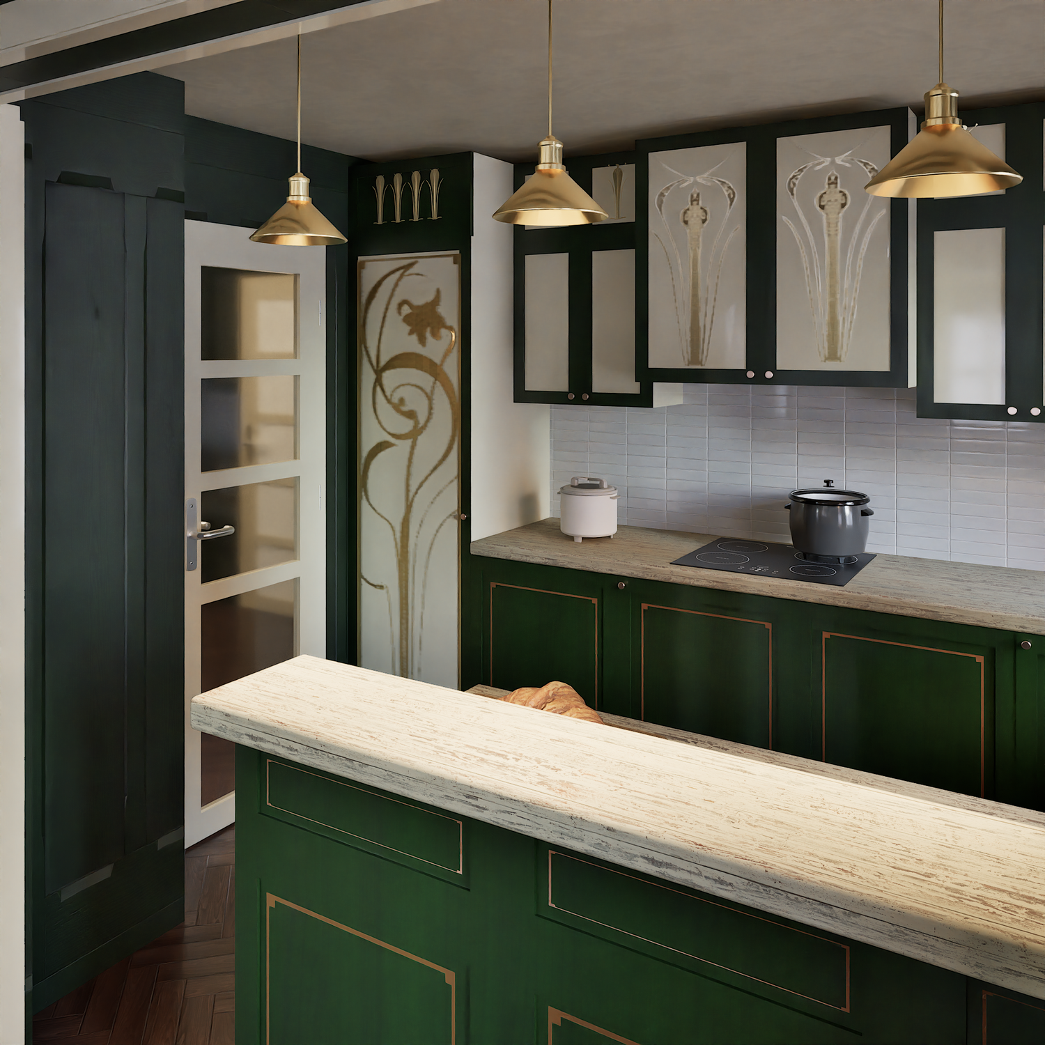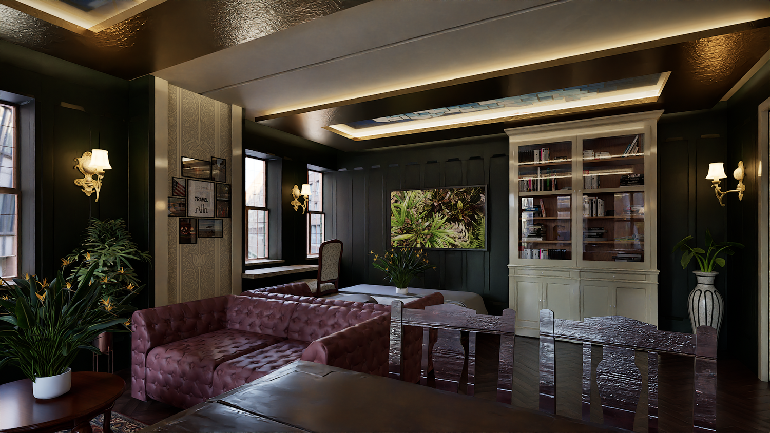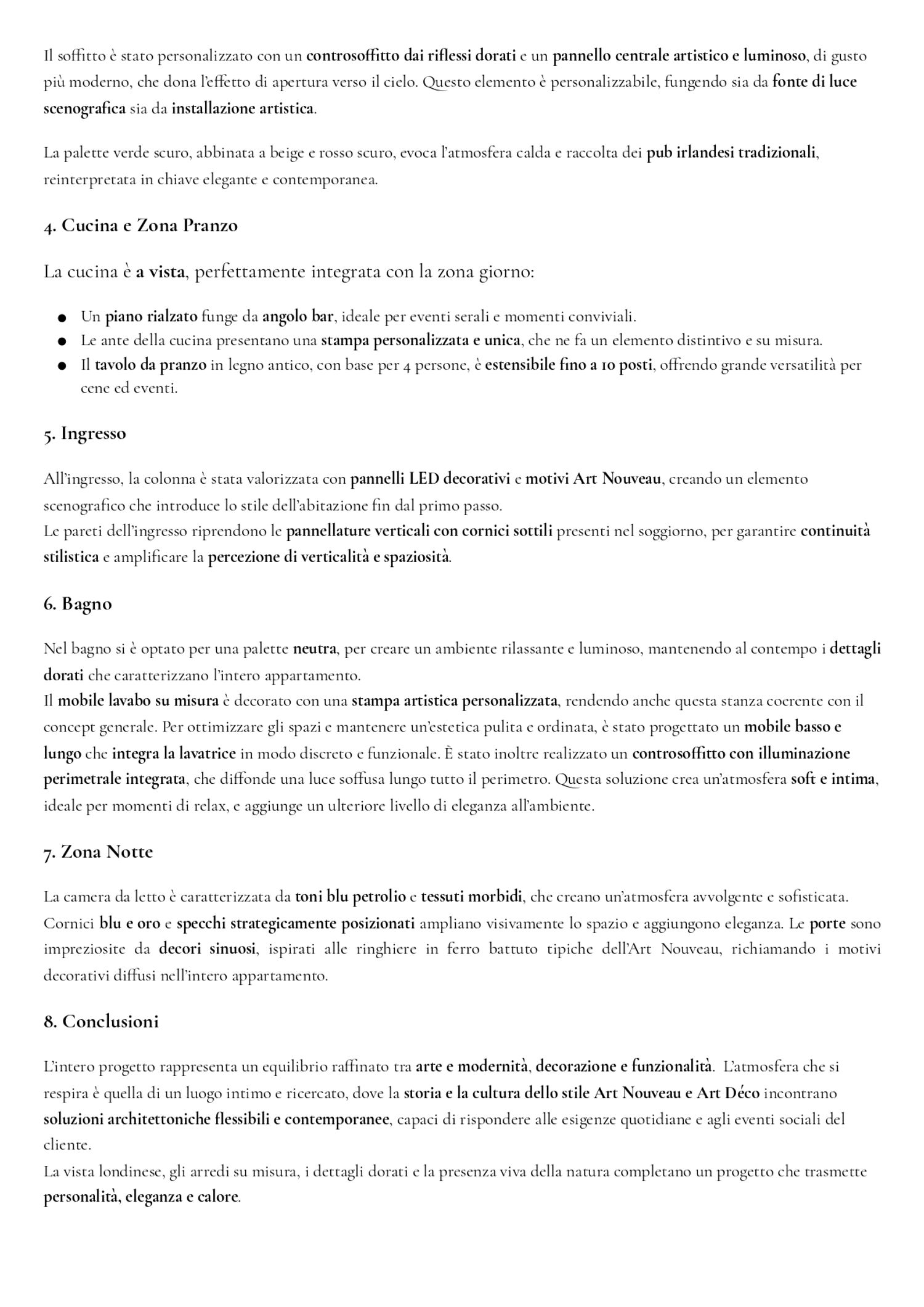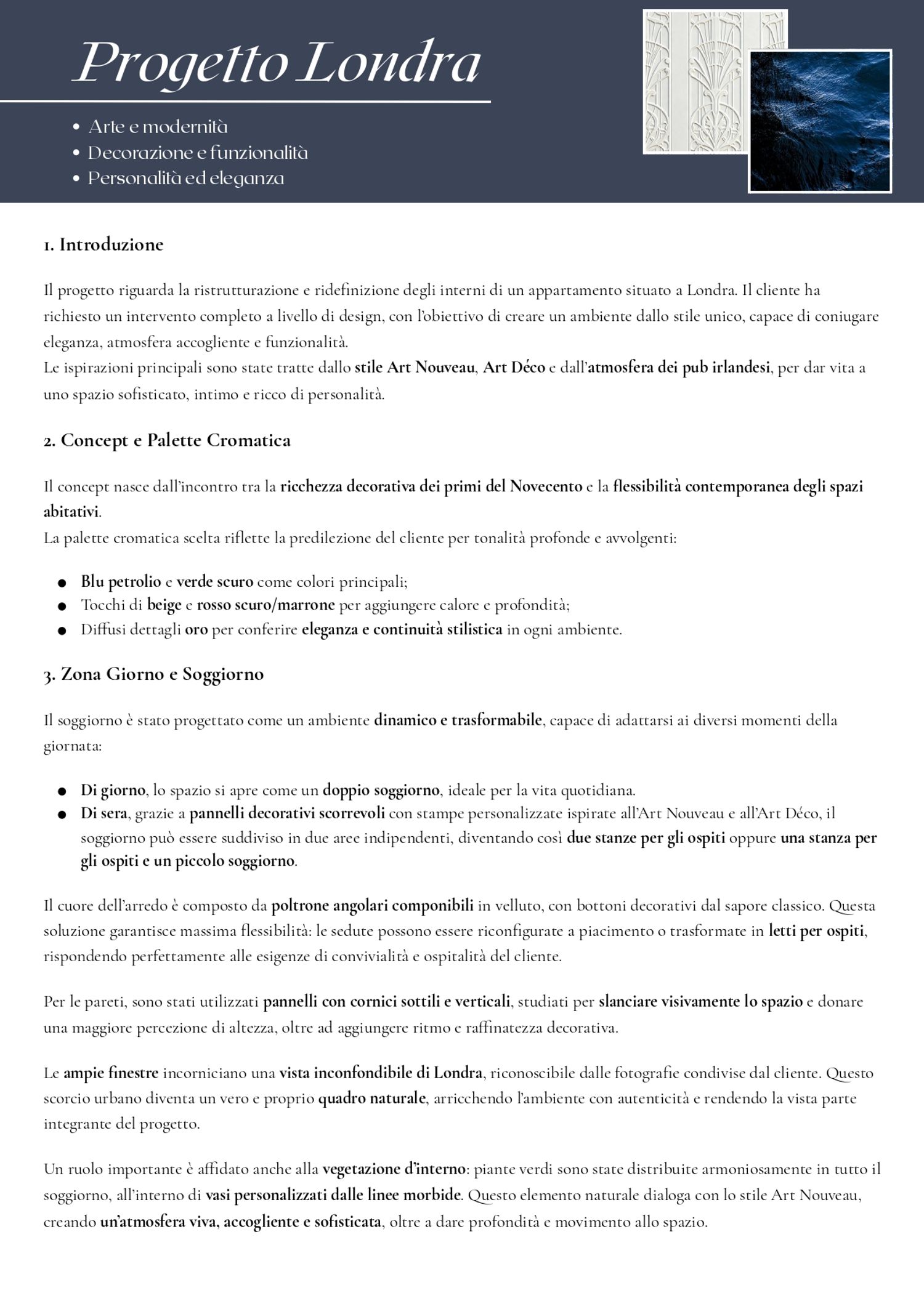 Questo progetto di ristrutturazione a Londra nasce dal desiderio del cliente di fondere eleganza storica e funzionalità contemporanea, ispirandosi agli stili Art Nouveau, Art Déco e all’atmosfera intima dei pub irlandesi. Attraverso una palette di colori profondi, arredi su misura e dettagli decorativi raffinati, l’appartamento è stato trasformato in uno spazio artistico, accogliente e versatile, capace di adattarsi con eleganza alla vita quotidiana e agli eventi conviviali. Su richiesta del cliente abbiamo sviluppato anche una planimetria senza demolizioni, mantenendo l'arredo come da progetto.
