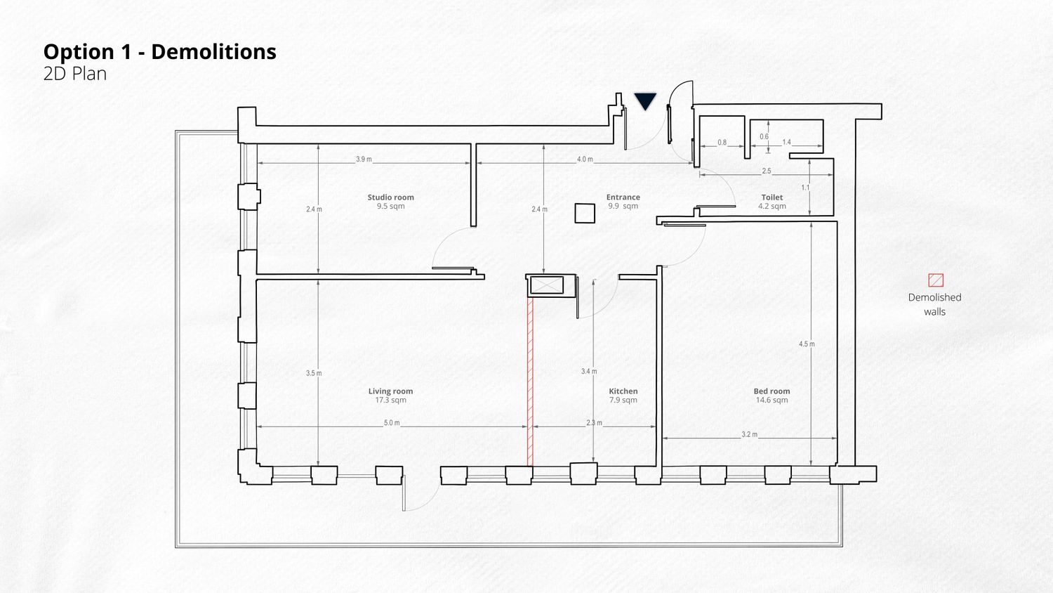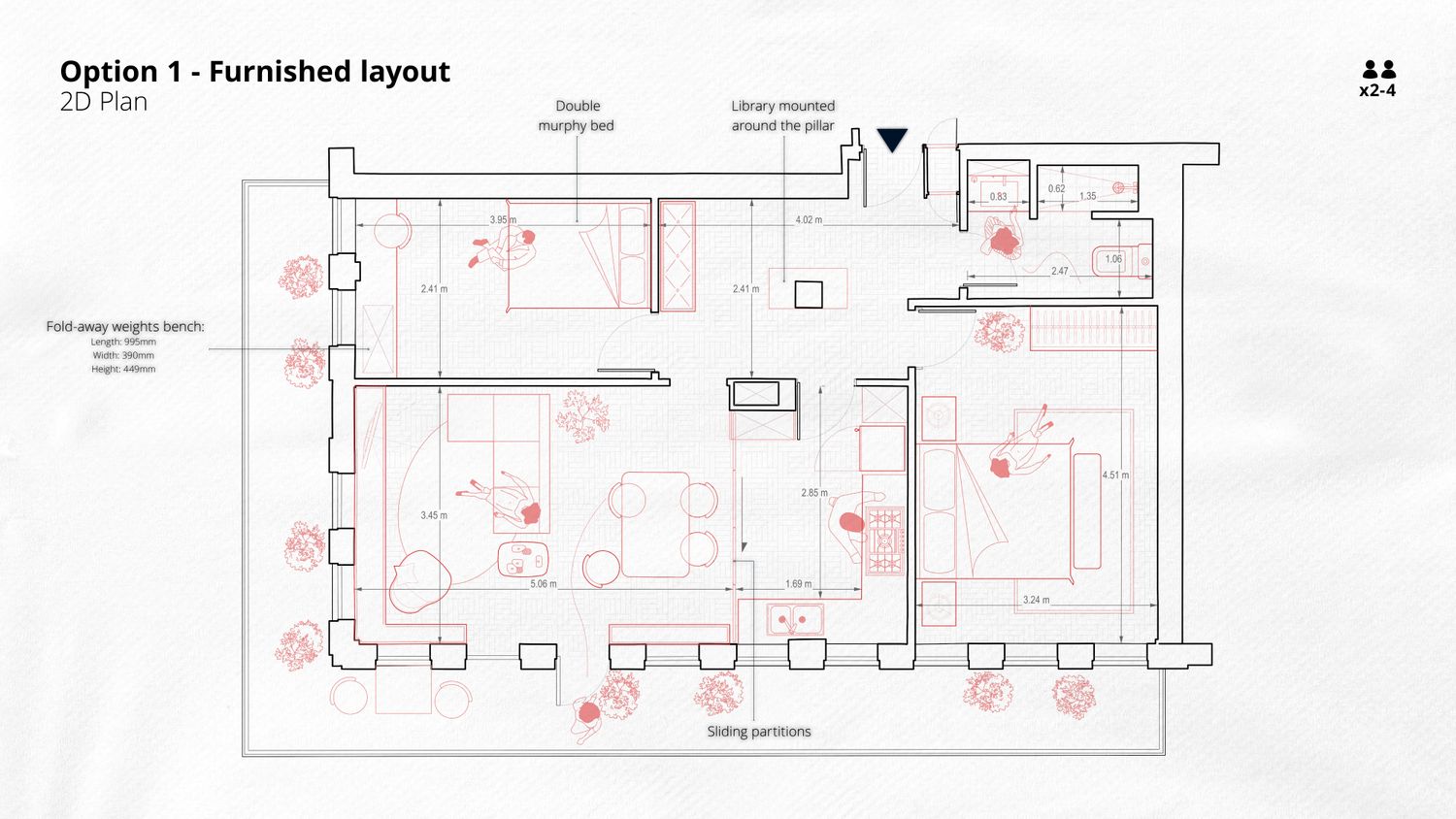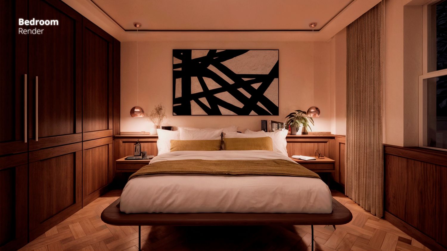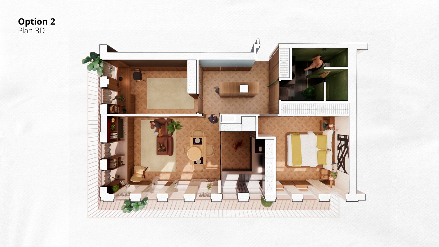 This configuration introduces selective structural improvements to enhance comfort and functionality. The bathroom expands to include a double sink and a generous walk-in shower, allowing for a luxurious daily routine. The bedroom is re-proportioned to accommodate a well-centred bed and a custom wall-mounted wardrobe, improving storage whilst making the most the space.