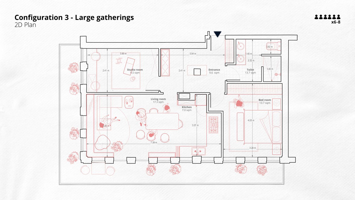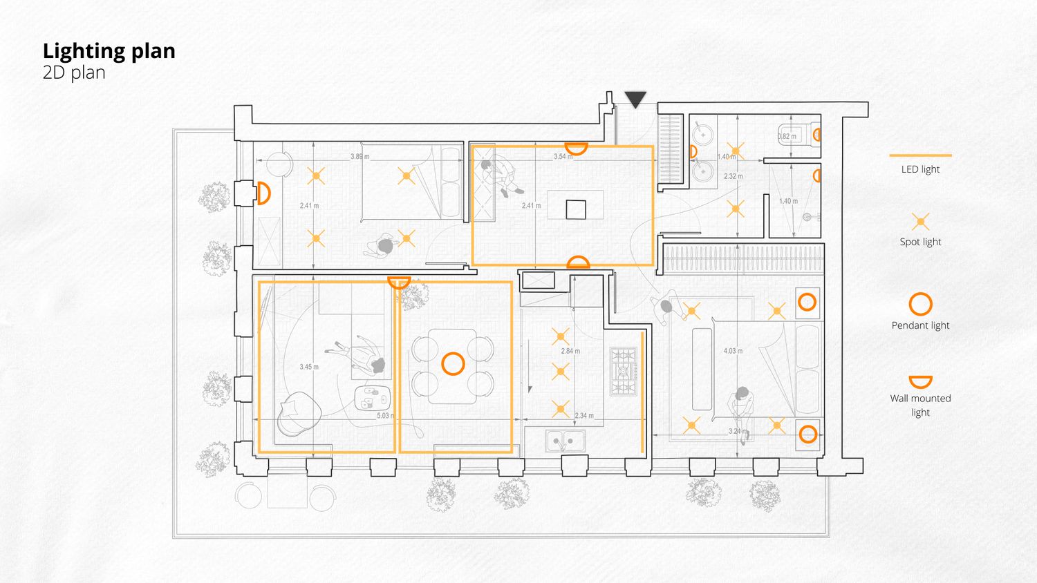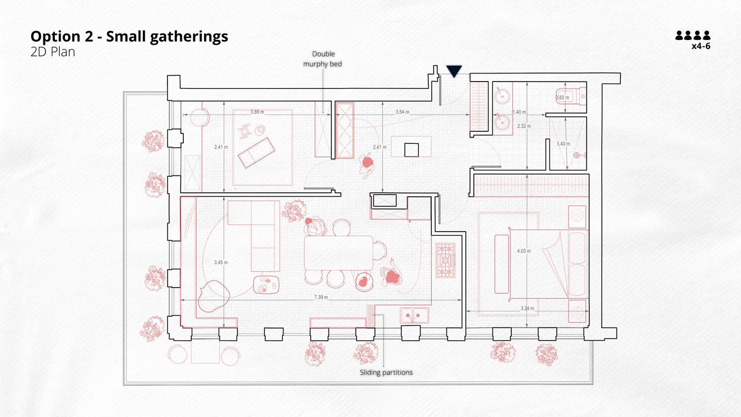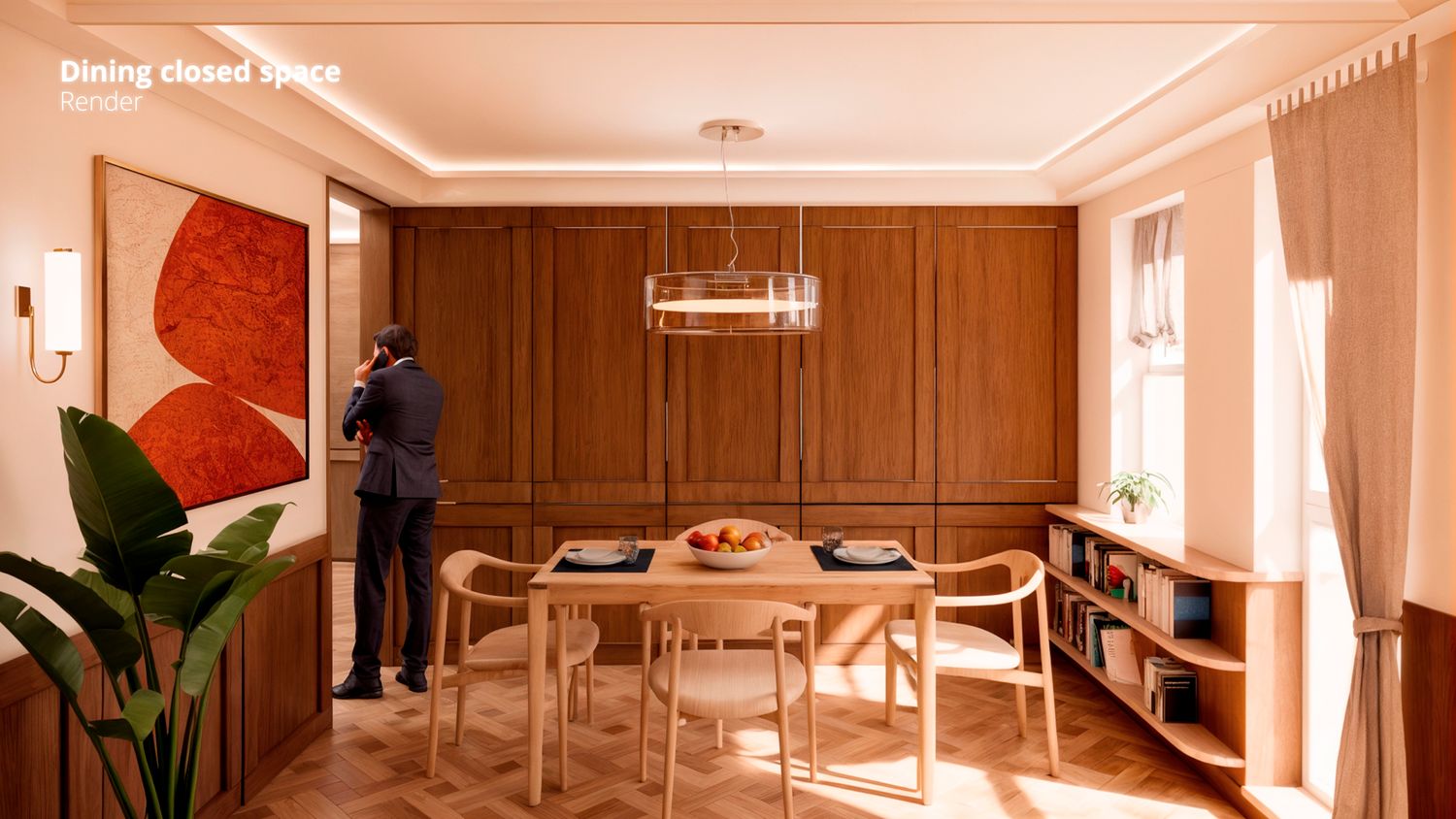 This proposal works entirely within the apartment’s current layout. Adaptability is achieved through lighting, movement, and smart furniture solutions. Fold-away and sliding partitions, extendable elements and layered lighting allow the home to transform seamlessly throughout the day.