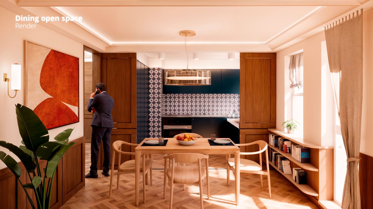 Meanwhile, the kitchen and living area remain the home’s true protagonists; open, welcoming, and harmoniously connected to the rest of the apartment. Thoughtful details, such as built-in shelving, layered lighting, and flexible furniture, ensure that the space is both functional and inviting.