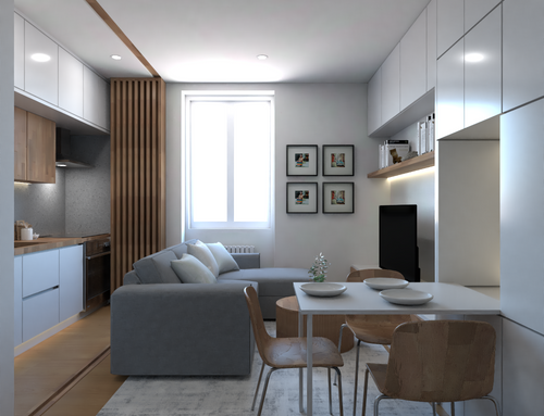 • A different cuisine. Since we intend to rent the apartment, we don't want to invest a lot of money. The conditions are: 1) It is essential that there is space to store the objects and that you do not see the utensils, glasses, plates, etc ... 2) The kitchen must be simple, linear or industrial (steel), or remain hidden. All appliances are new and do not need to be changed