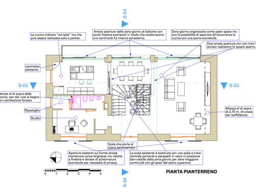-PIANO TERRA, vorremmo modificare la scala esistente, con una scala moderna. Vorremmo una cucina spaziosa e funzionale e possibilmente contigua alla zona living. Oppure un open space magari con la possibilità di essere separato all’occorrenza con una porta scorrevole. Vorremmo che rimanesse il camino, non per forza dove si trova. Vorremo realizzare un bagno, un ripostiglio e magari un'area studio.